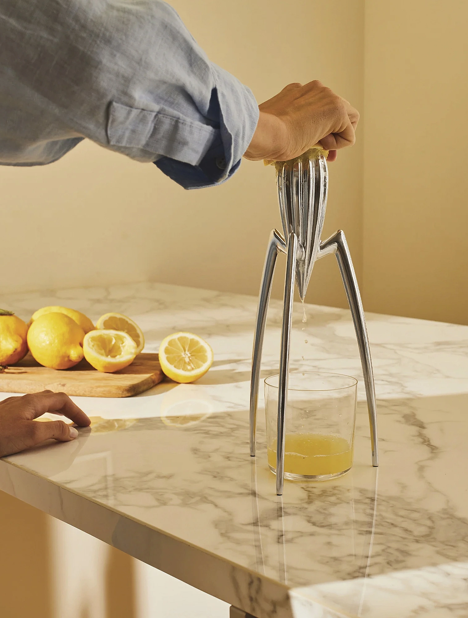 Почему кальмар? Кальмар — классика средиземноморской кухни. Его принято есть, выжав ломтик лимона. Старк заказал кальмаров на ужин в ресторане прибрежного городка Италии. Пока Старк ждал, когда ему принесут забытый официантом лимон, ему пришла идея использовать природные формы для кухонной утвари. Так появилась соковыжималка Juicy Salif.