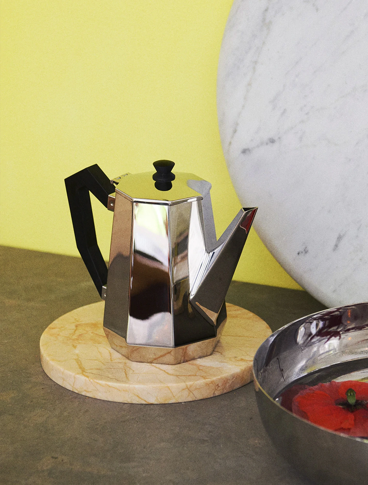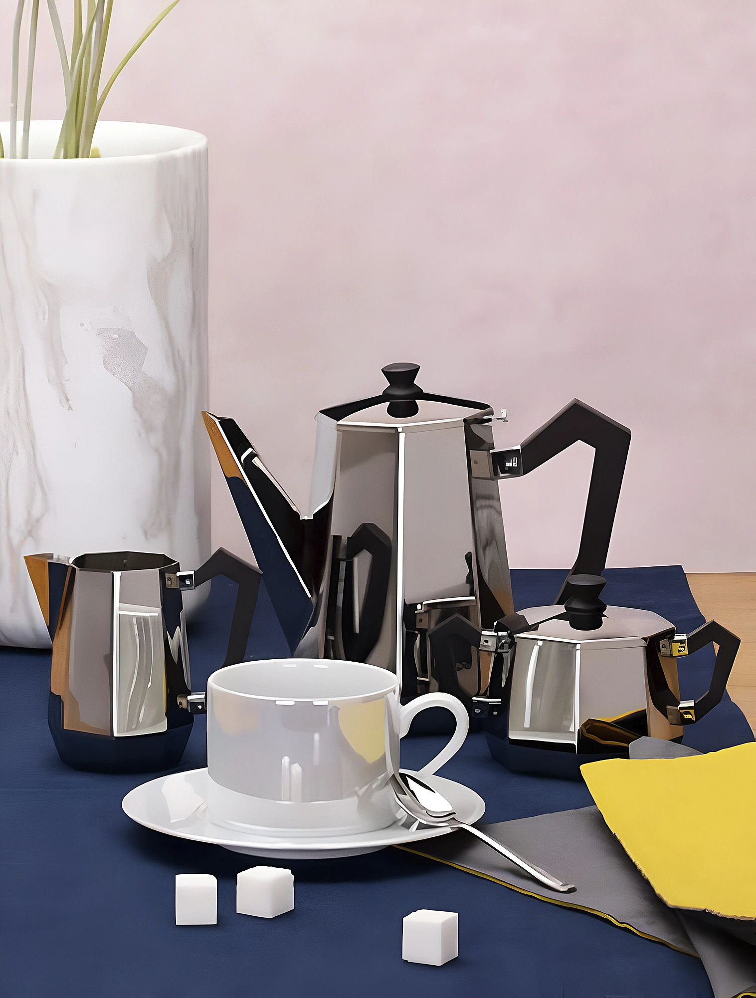 Ottagonale — одна из наиболее известных коллекций бренда. Её название переводится как «Восьмиугольный»: эта геометрическая фигура лежит в основе дизайнерского решения Карло. Сахарница, чайники, молочник и поднос — всё выполнено из нержавеющей стали. Стальной блеск идеально сочетается с чёткими лаконичными формами и чёрной фурнитурой.