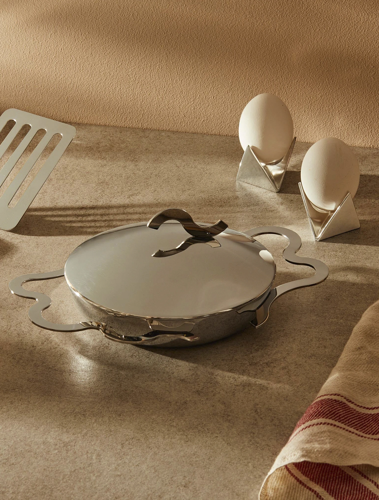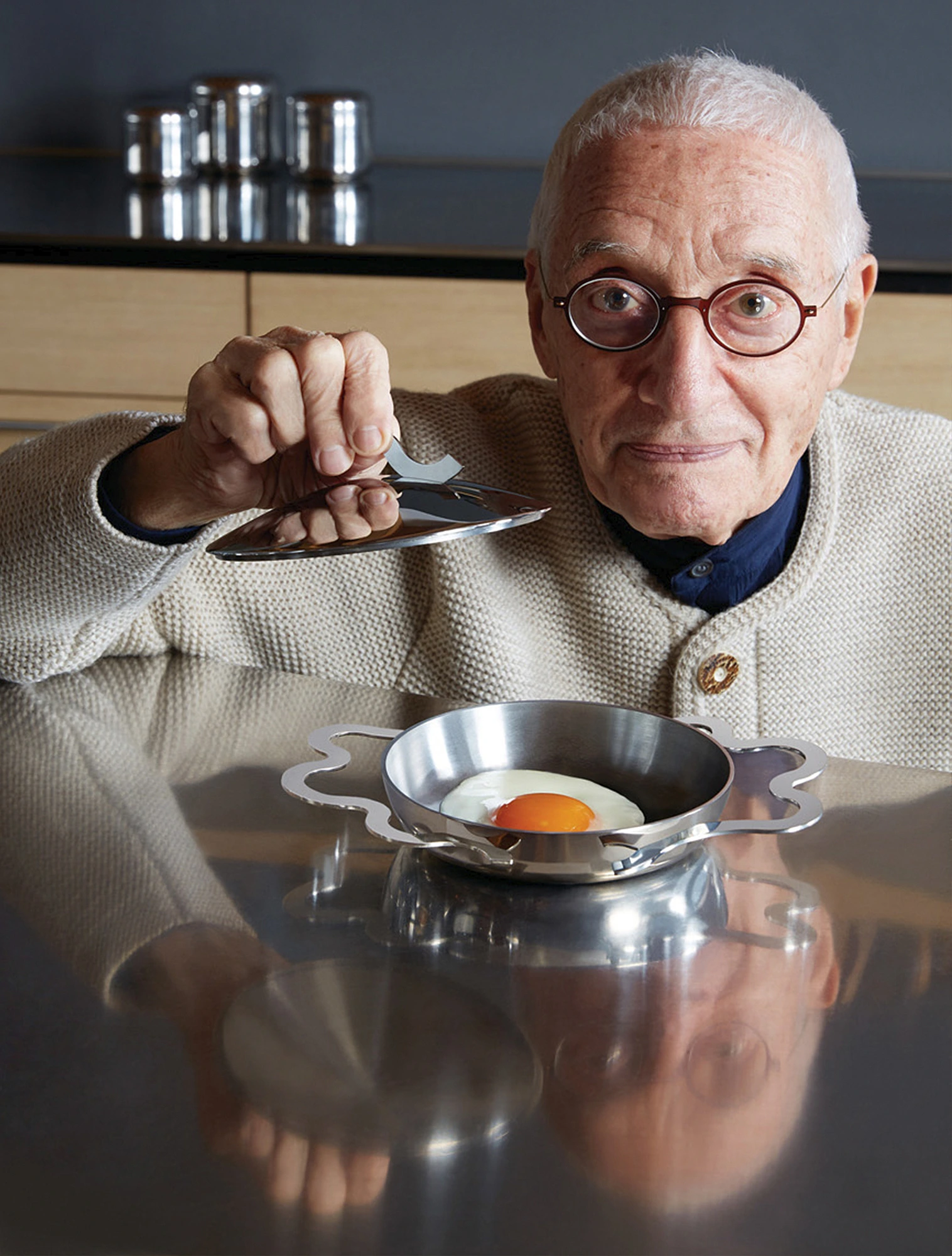 Сковородка Tegamino для Alessi сделана из нержавеющей стали, у неё большие и удобные изогнутые ручки, которые по форме напоминают разбитое яйцо на сковородке. Сковородка настолько хороша, что Мендини предлагал есть завтрак прямо из неё, не перекладывая в тарелку.