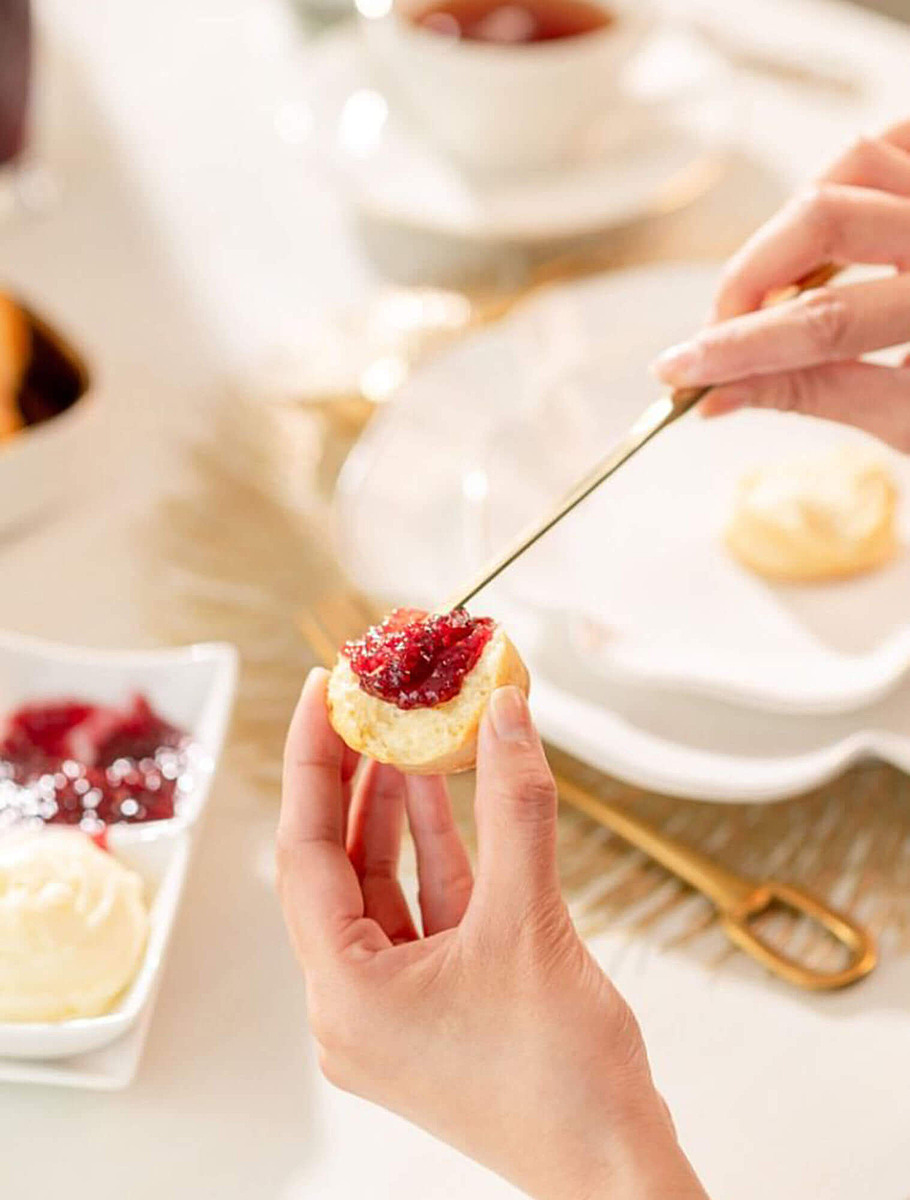 Сервируя домашний чайный стол, позаботьтесь не только об индивидуальных приборах для гостей, но и о сервировочных. Джем, масло, крем-сыр и другие добавки берут из розетки только общими приборами, перекладывают на свою тарелку, а уже потом намазывают или едят своими. Макать булочку или тянуться личным ножом в общую креманку этикет не допускает.