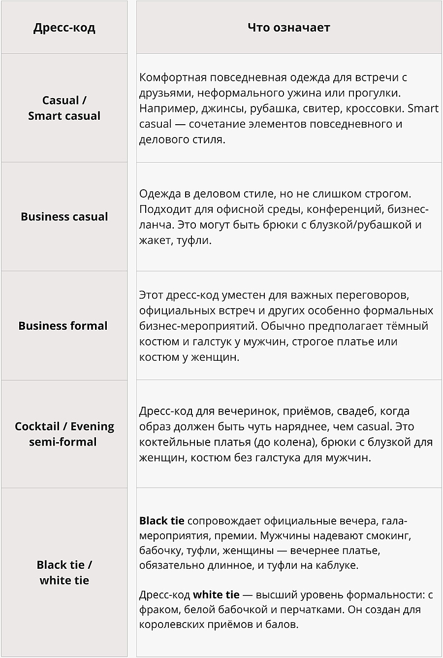 Есть базовые правила для любых ситуаций: одежда должна быть опрятная, отглаженная, по размеру, обувь чистая и ухоженная. Чтобы было удобнее выбрать одежду под разные мероприятия, придумали систему дресс-кодов.