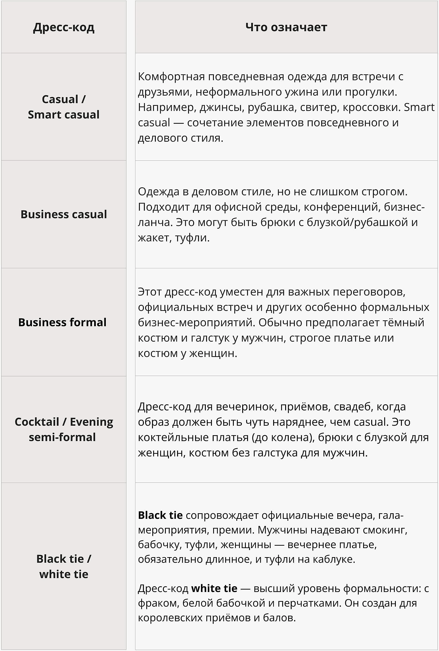 Есть базовые правила для любых ситуаций: одежда должна быть опрятная, отглаженная, по размеру, обувь чистая и ухоженная. Чтобы было удобнее выбрать одежду под разные мероприятия, придумали систему дресс-кодов.