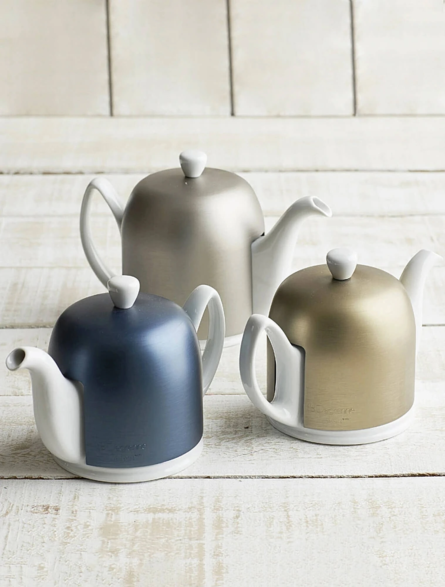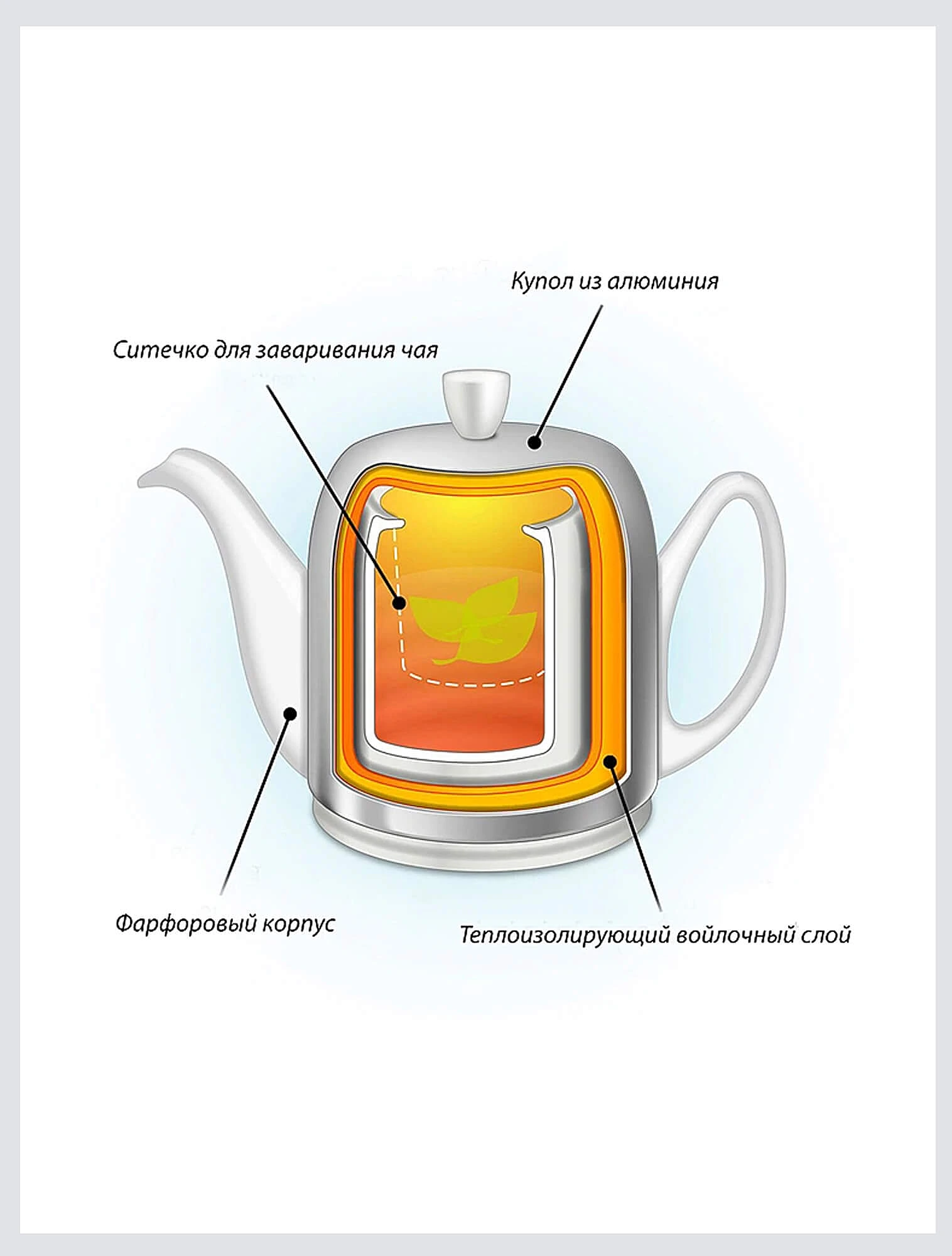 Чайник Salam тоже состоит из нескольких слоёв. Фарфоровое основание сверху накрывает отполированный стальной колпак со съёмной фетровой подкладкой. Благодаря такому устройству чайник приобретает свойства термоса и в два раза дольше сохраняет напитки горячими. Изящный носик спроектирован так, чтобы капли не попадали на скатерть. Внутри чайника есть ситечко для заварки.