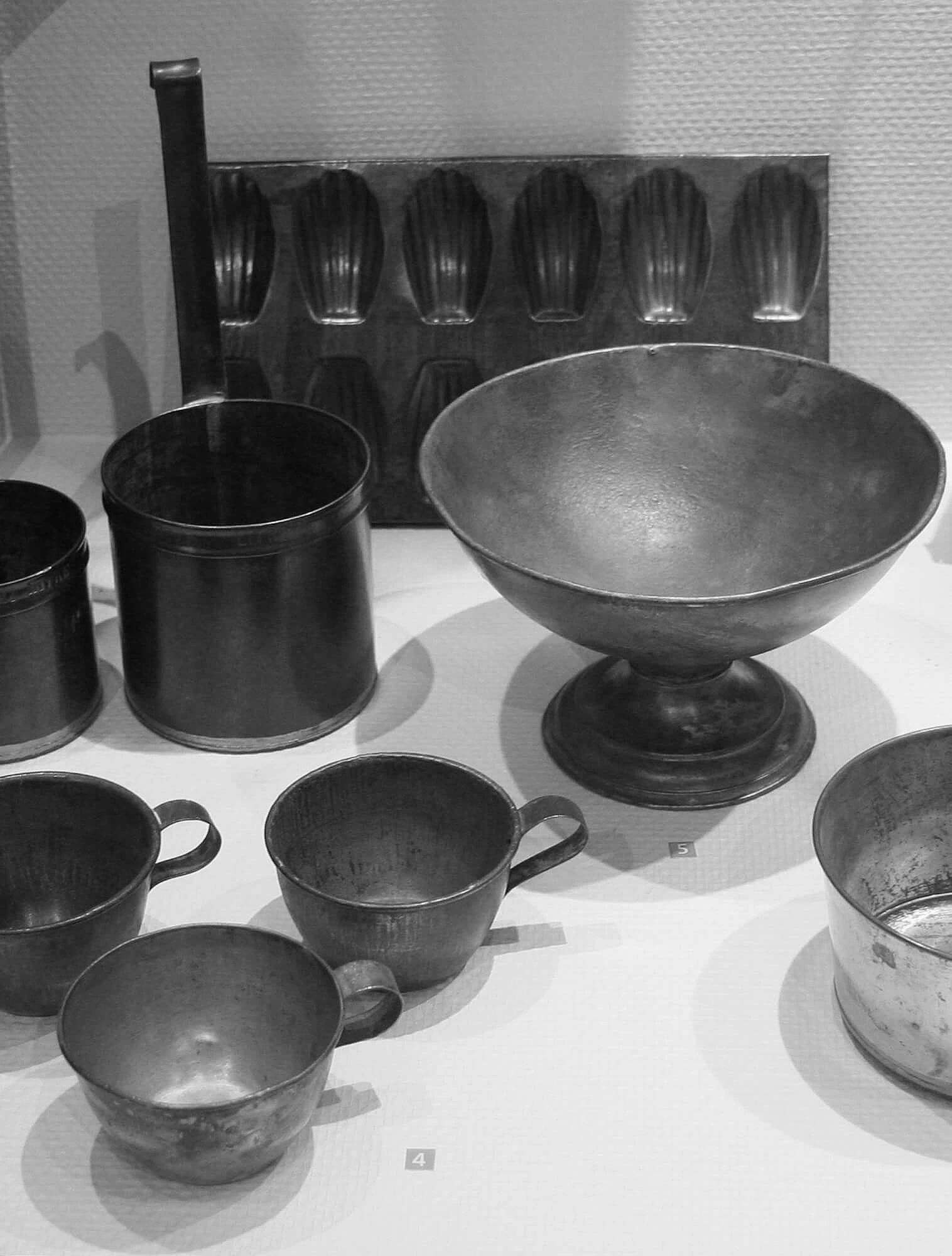 В качестве основного материала он использовал белую жесть — металлический сплав с защитным покрытием из олова. Столовые приборы из жести получались доступными по цене, но считались менее долговечными.