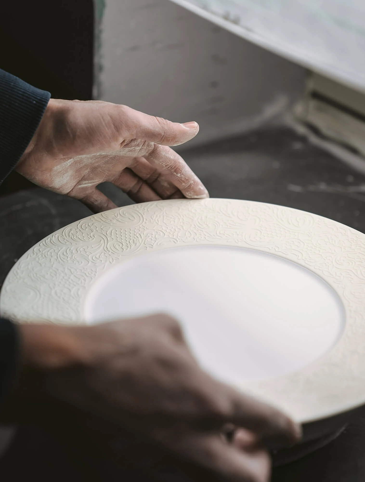 Мастера фабрики Degrenne вручную вырезают узор на формах для изготовления посуды и используют различные техники нанесения глазури, чтобы подчеркнуть красивый рельеф орнаментов.
