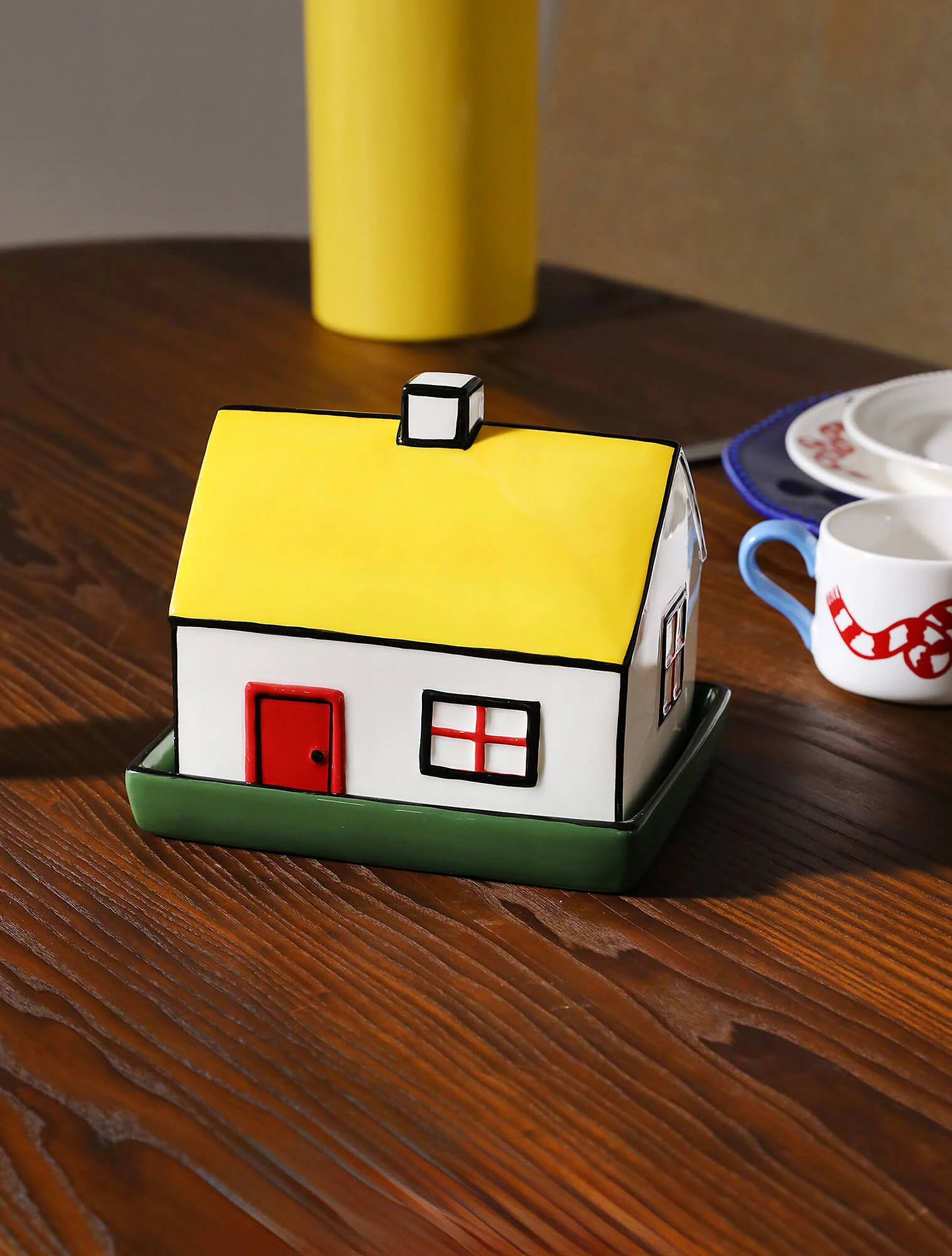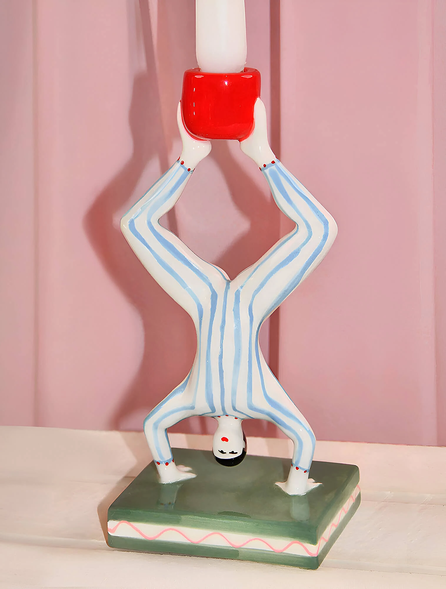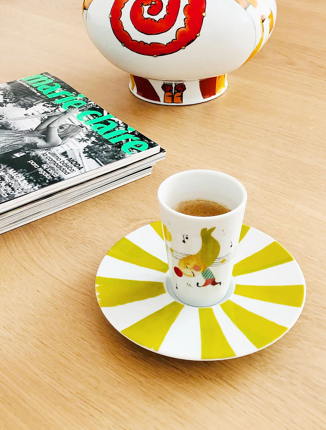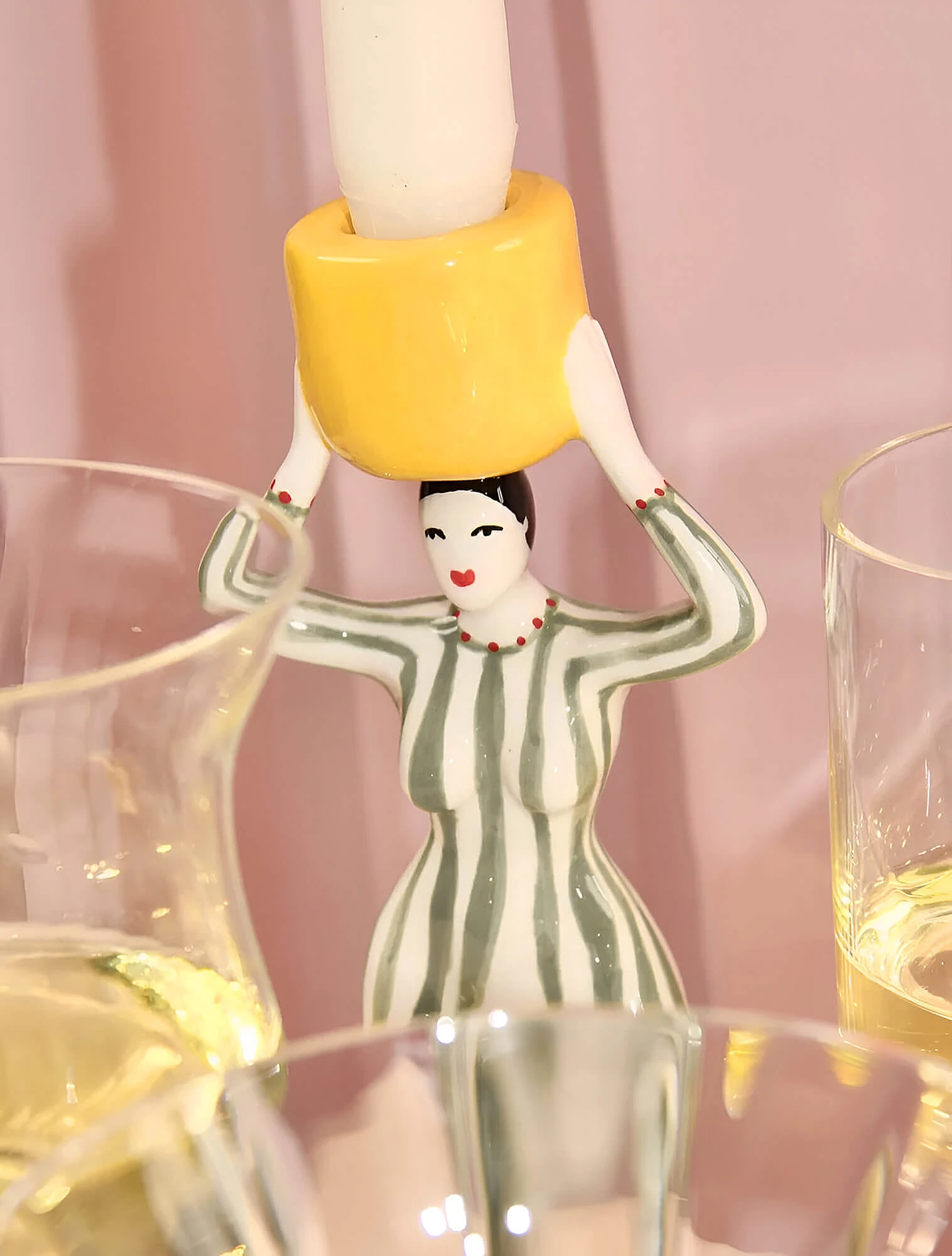Интересно, что выразительные формы и мотивы здесь важнее, чем сама цветовая гамма. Один из примеров, коллекция «Да и нет» Императорского фарфорового завода — классика, ставшая частью дофаминового тренда. Костяной фарфор с чётким полосатым рисунком и тонким золотым кантом отсылает к классическим цирковым образам, а вот палитра выбрана неожиданная: жёлтый, зелёный, розовый, синий и фиолетовый. Автор серии — Сергей Соколов, скульптор и заслуженный художник России.