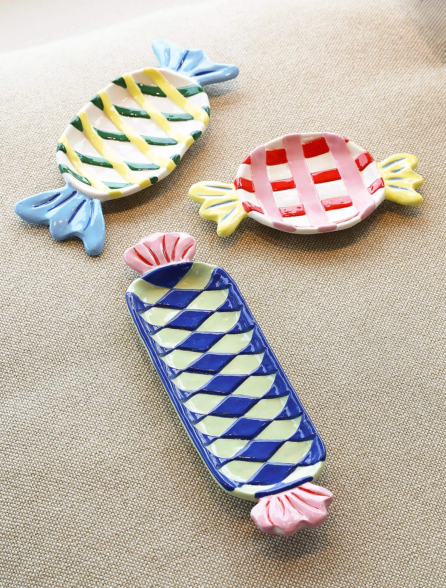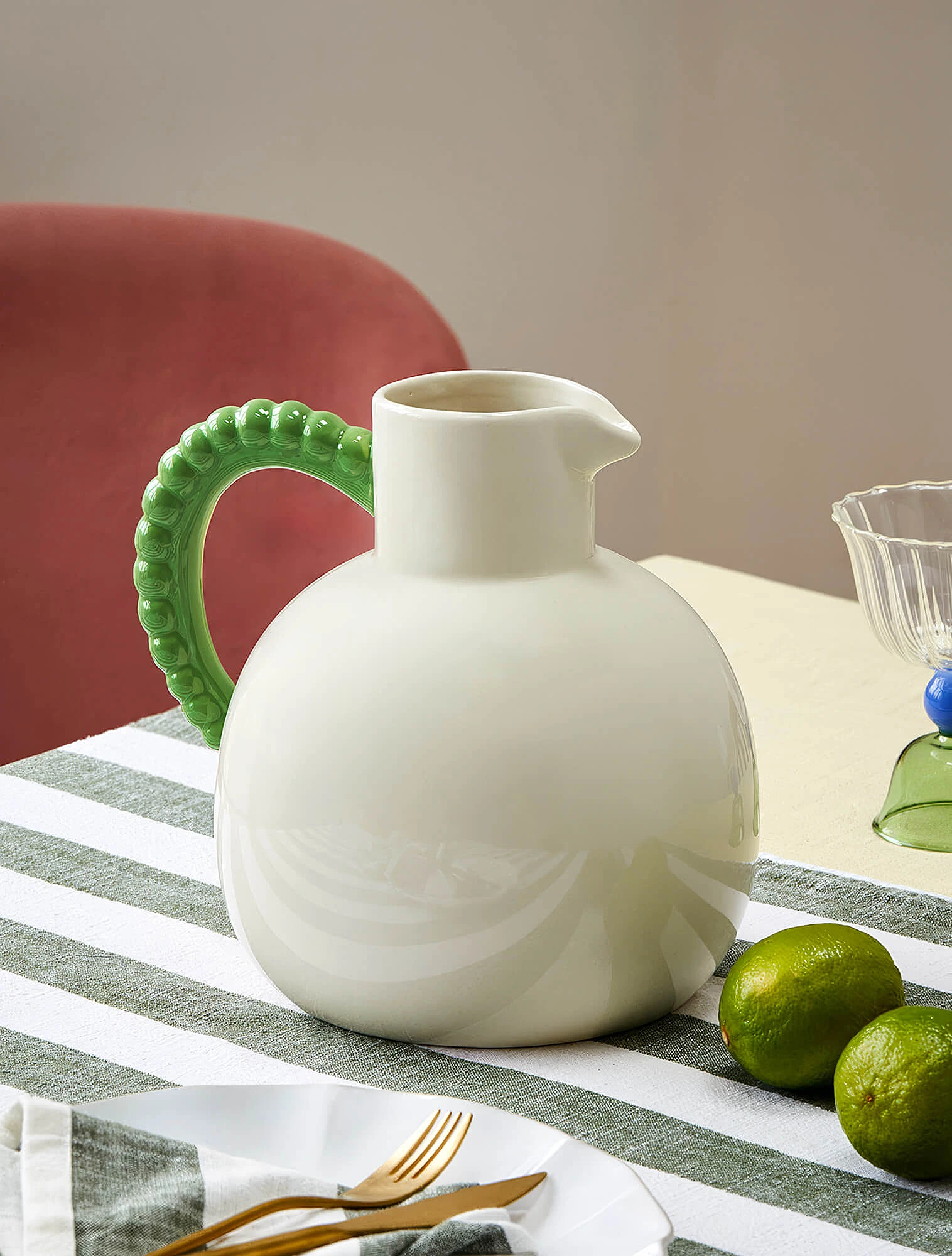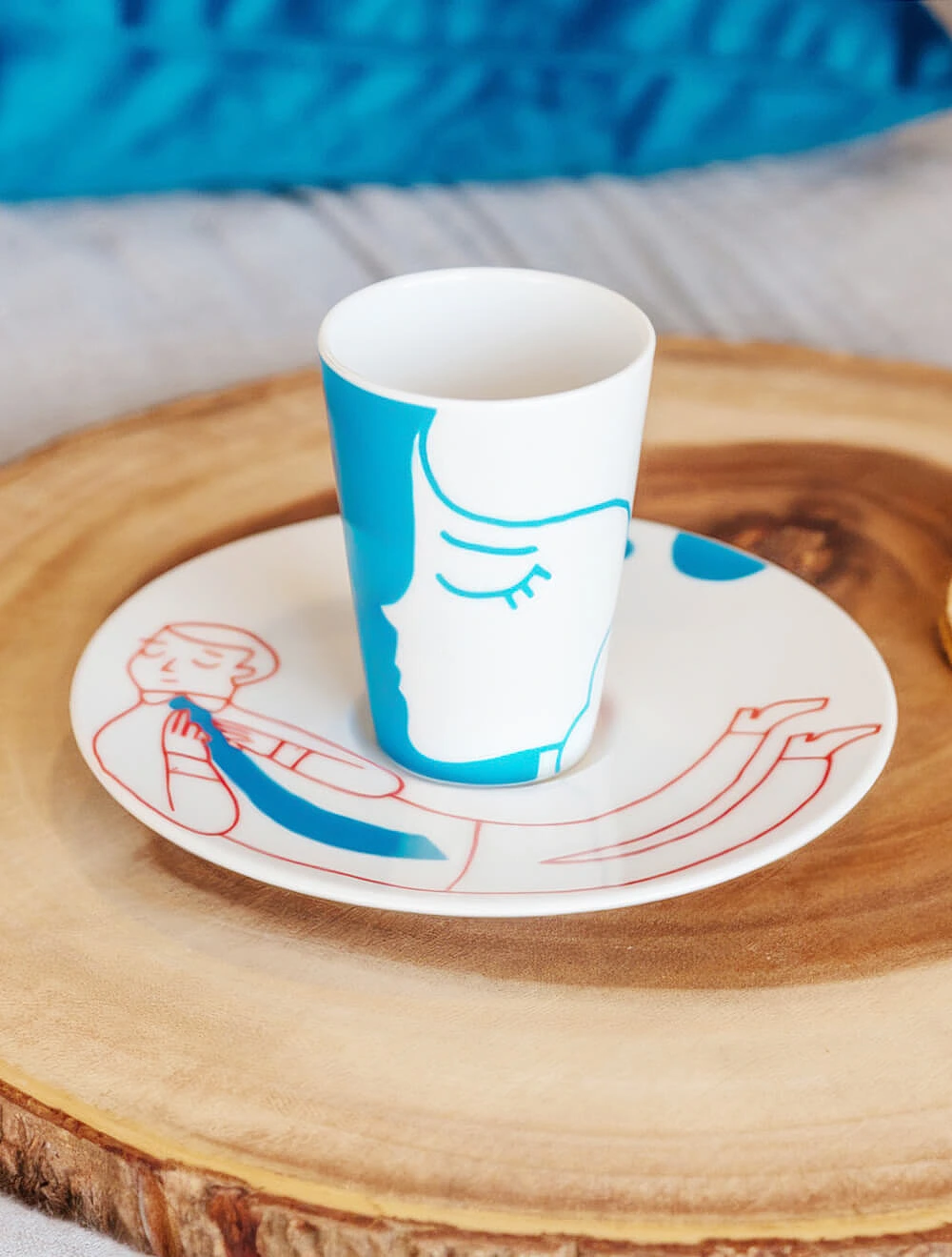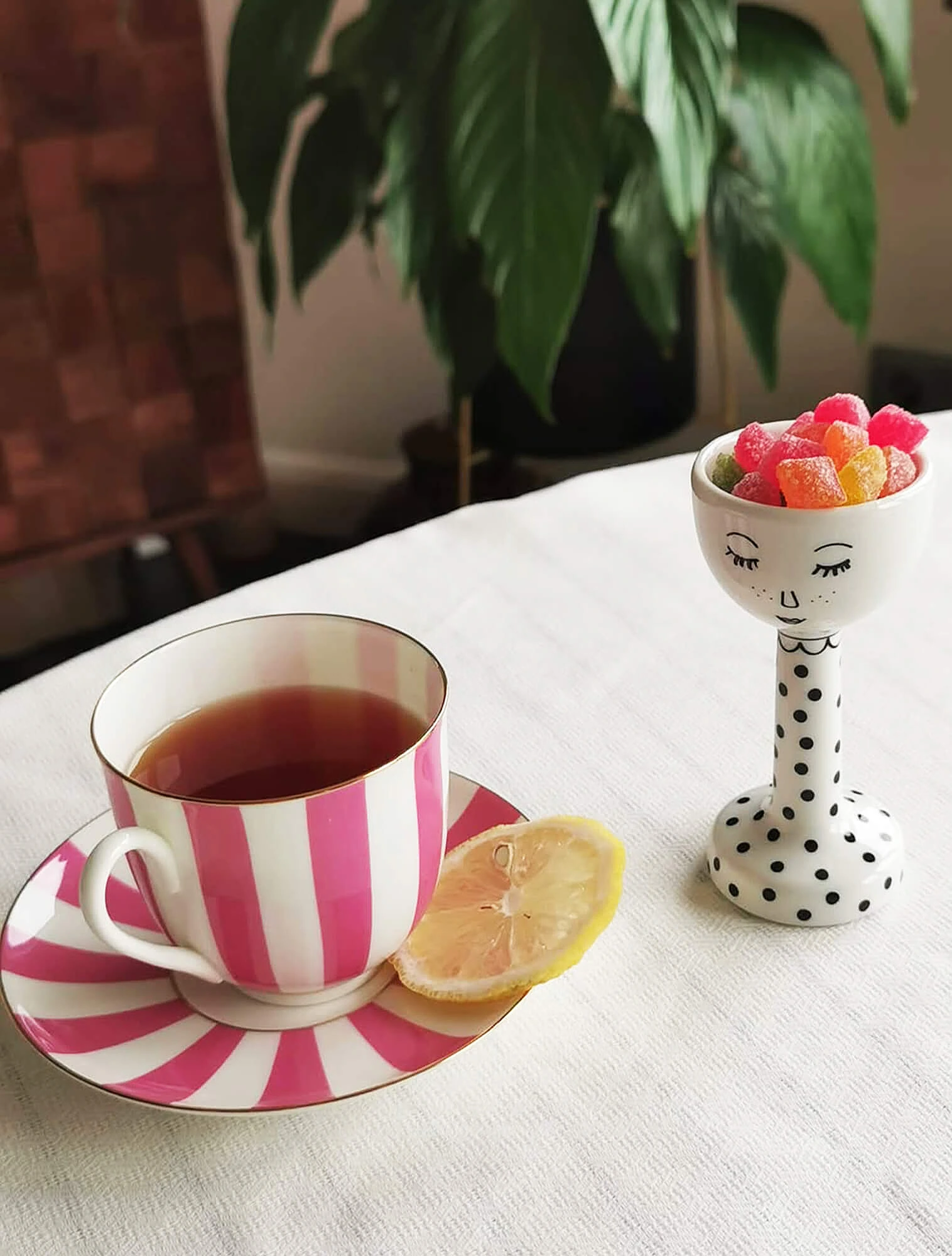 Интересно, что выразительные формы и мотивы здесь важнее, чем сама цветовая гамма. Один из примеров, коллекция «Да и нет» Императорского фарфорового завода — классика, ставшая частью дофаминового тренда. Костяной фарфор с чётким полосатым рисунком и тонким золотым кантом отсылает к классическим цирковым образам, а вот палитра выбрана неожиданная: жёлтый, зелёный, розовый, синий и фиолетовый. Автор серии — Сергей Соколов, скульптор и заслуженный художник России.
