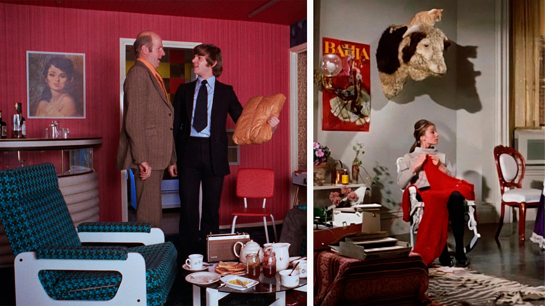 Вспомните обстановку в фильме «Заводной апельсин» Стэнли Кубрика и ранних работах режиссёра Педро Альмодовара или, например, квартиру главной героини в «Завтраке у Тиффани». Сейчас бы мы назвали эти киноинтерьеры воплощением дофаминового дома: ковёр из шкуры зебры, диван-ванная с малиновыми подушками, ретро-чемоданы.