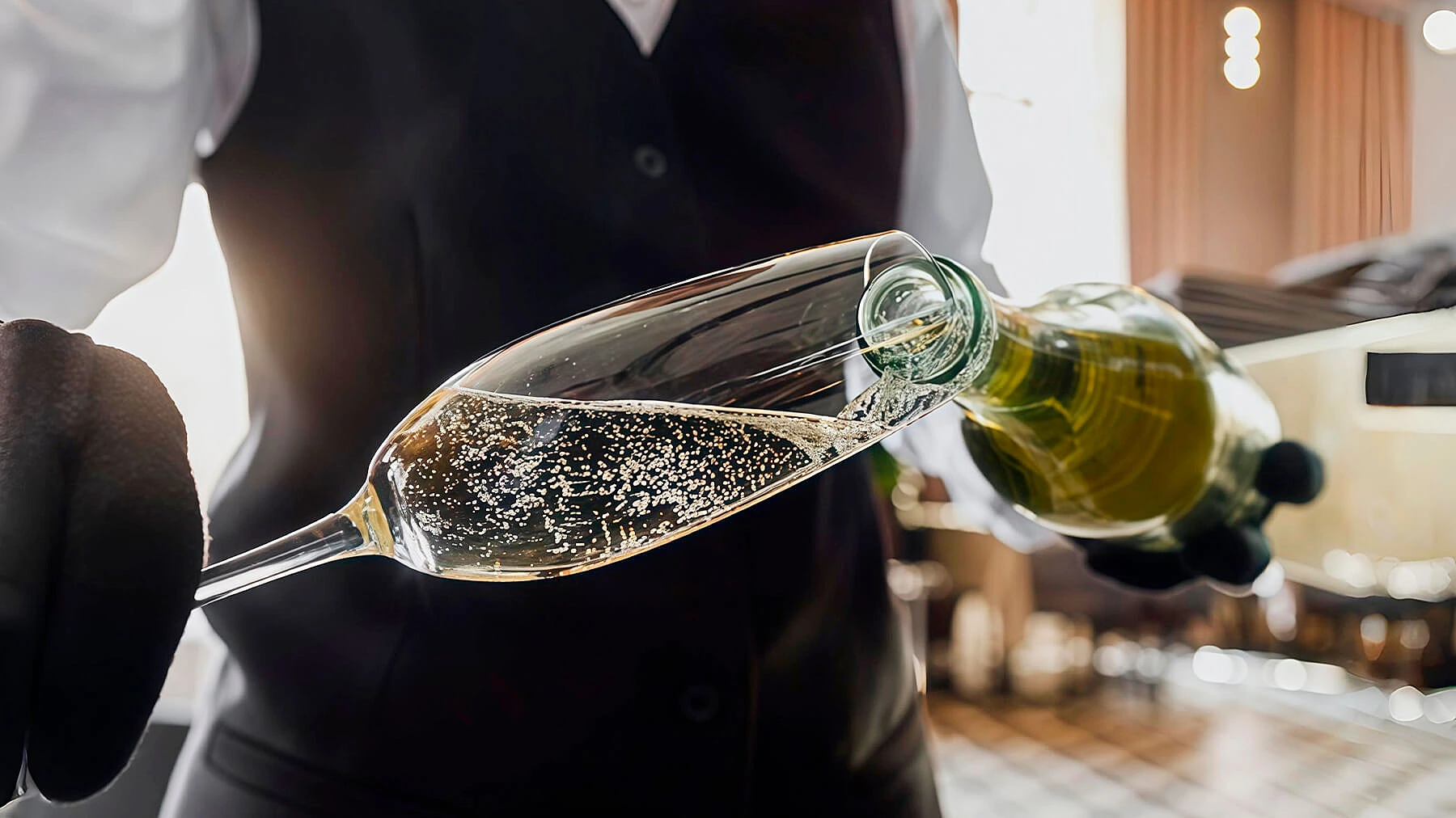 В ресторанах шампанское разливают справа от гостя, чтобы этикетка была обращена к гостю и он видел марку вина. Чтобы рука сомелье не нагревала бутылку, он держит её за основание.