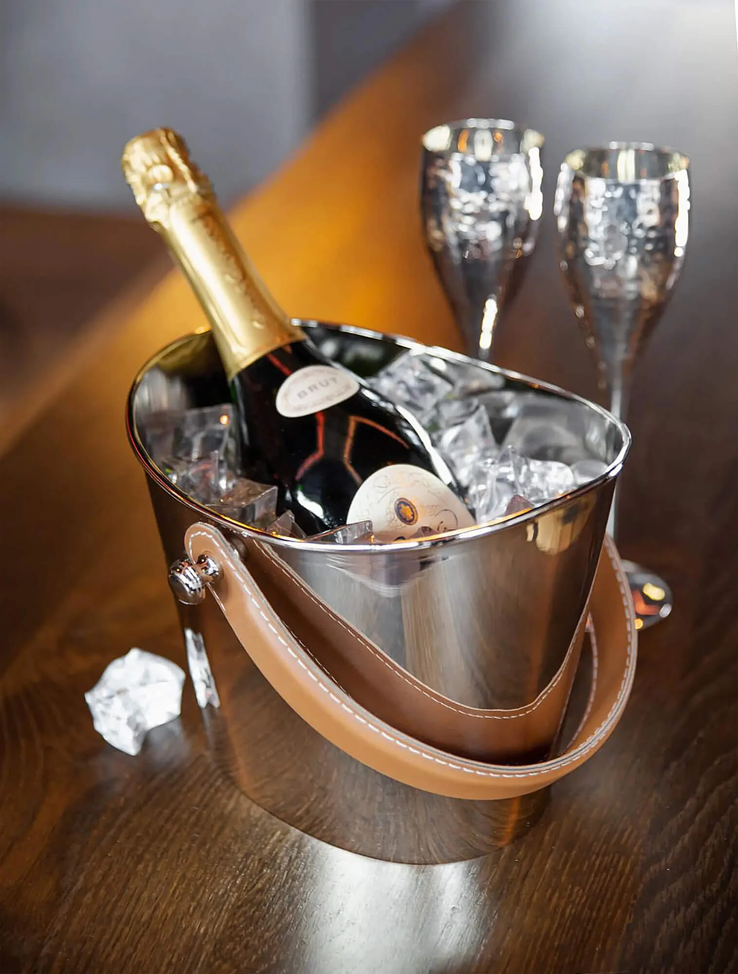 Если шампанское дарят дома, друзьям или близким, можно добавить к бутылке аксессуары — набор бокалов, охлаждающее ведёрко или кулер.