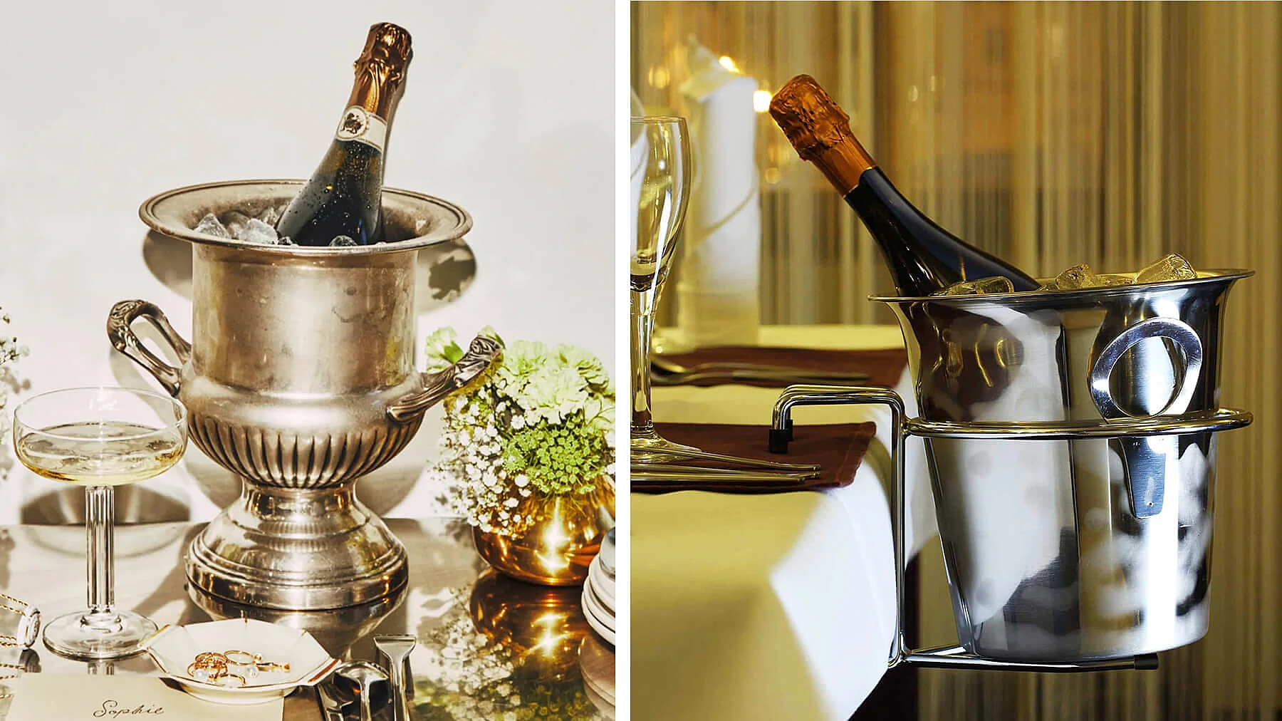 Ведёрко никогда не ставится в центр стола. В ресторанах используют специальную подставку или боковой столик — это предотвращает стекание конденсата на скатерть. Дома можно поставить ведёрко на край стола, но лучше подложить под него поднос или плотную салфетку.