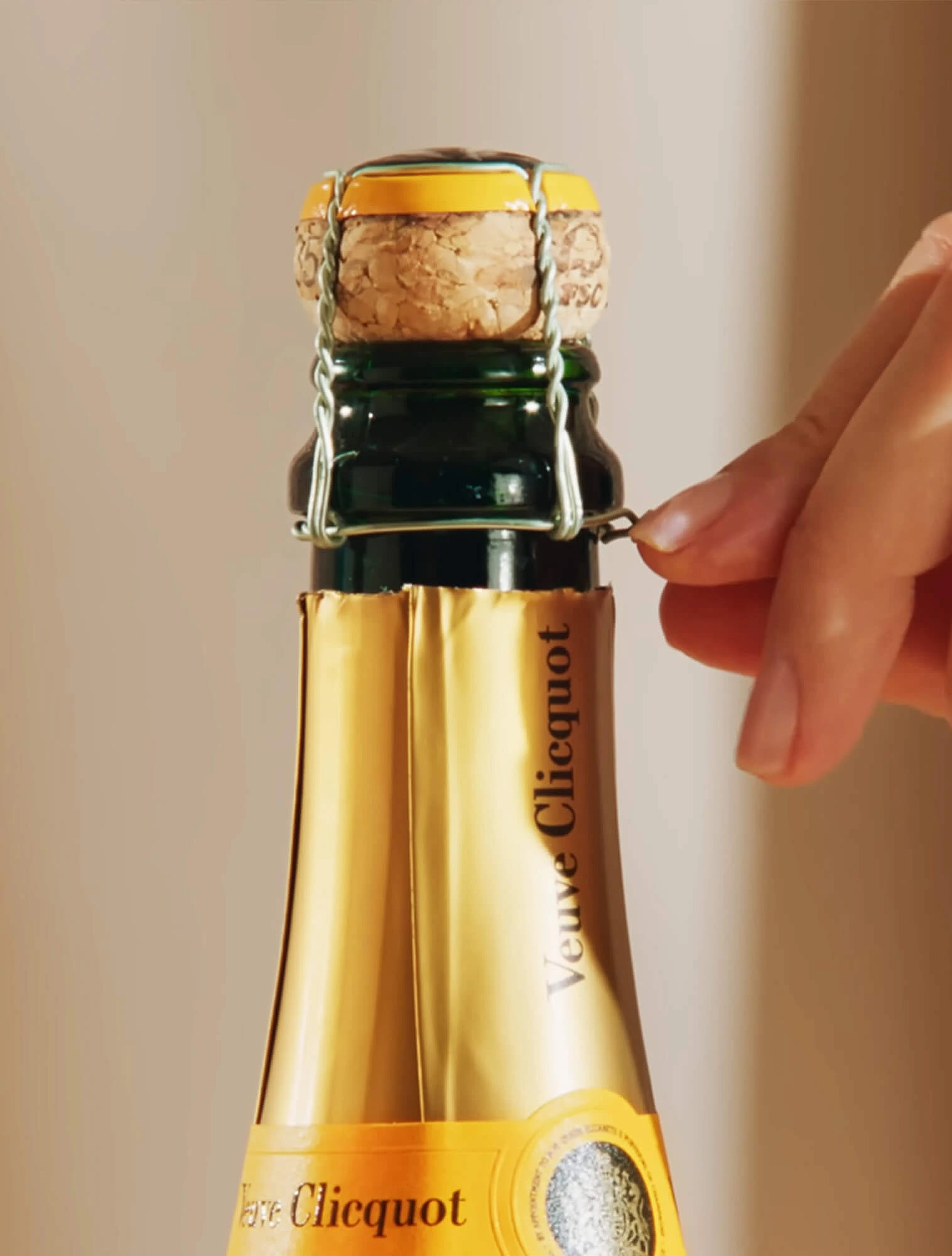 По правилам игристого этикета бутылку открывают тихо — с лёгким «вздохом», а не с выстрелом. Чтобы открыть бутылку, нужно снять фольгу и аккуратно ослабить мюзле — металлическую проволоку, удерживающую пробку. Бутылку слегка наклоняют под углом 45°, направляя горлышко в сторону от гостей.