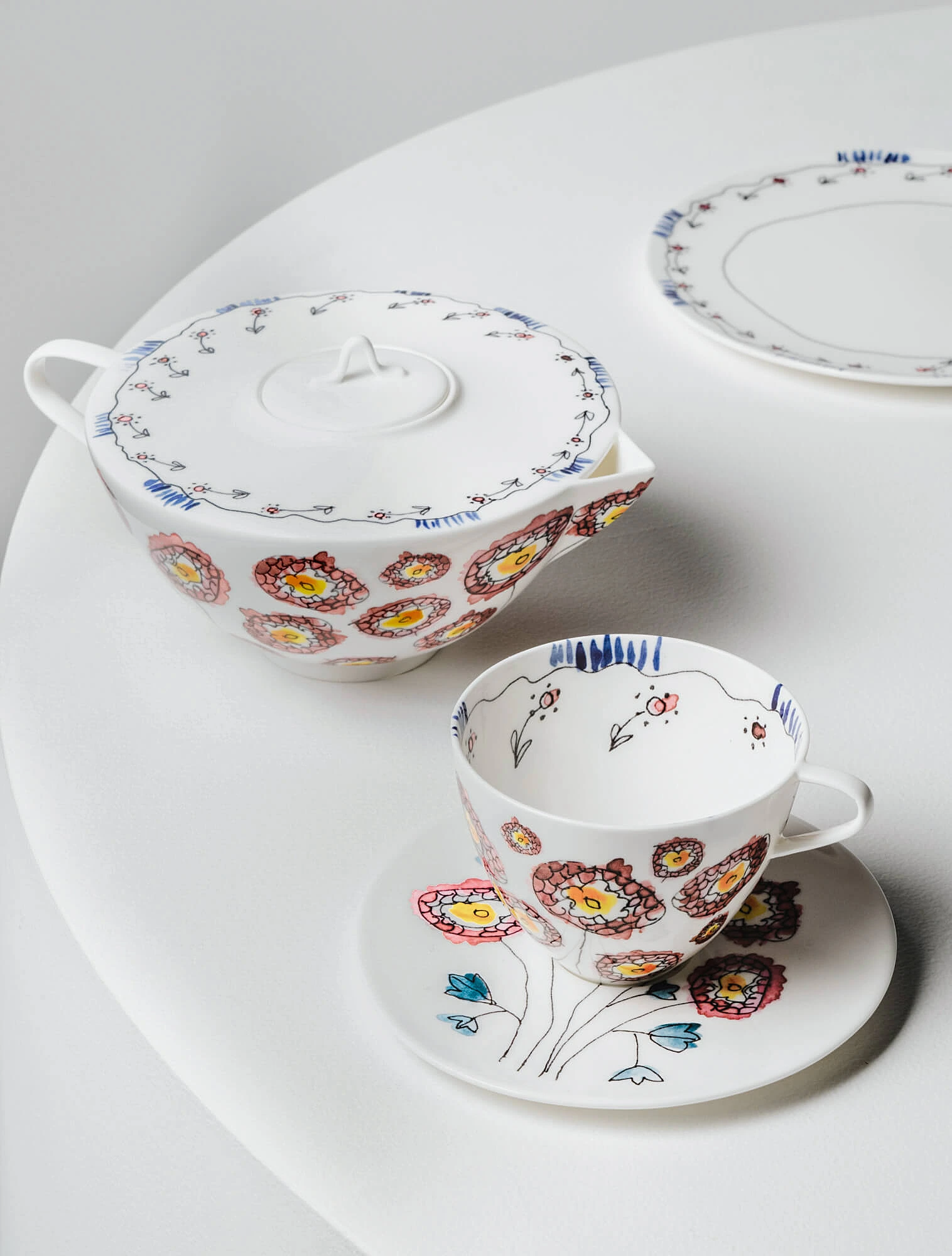 Цветочные мотивы — фирменный элемент бренда Marni — переосмыслены в духе примитивизма. Ассиметричные формы, рукописные линии, приглушённые оттенки. Коллекция получилась на стыке моды, искусства и кулинарии и сразу же попала на страницы ведущих интерьерных изданий.