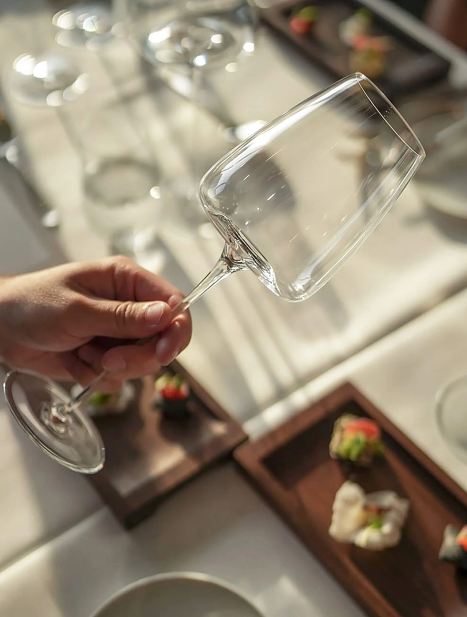 Во французских школах сомелье в качестве универсального стандарта используют дегустационный бокал INAO — форму, созданную Национальным институтом происхождения и качества. Он похож на тюльпан: чаша расширяется внизу и сужается кверху, чтобы аромат не рассеивался, а вино раскрывалось мягко и постепенно. В нём дегустируют любые вина. Но в магазинах или ресторанах такие бокалы встречаются редко: они ниже, строже и немного напоминают лабораторную чашу, поскольку созданы не для эффектной подачи, а для точной оценки вина.