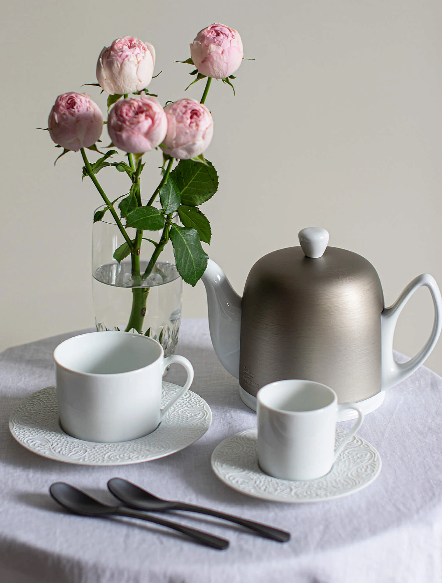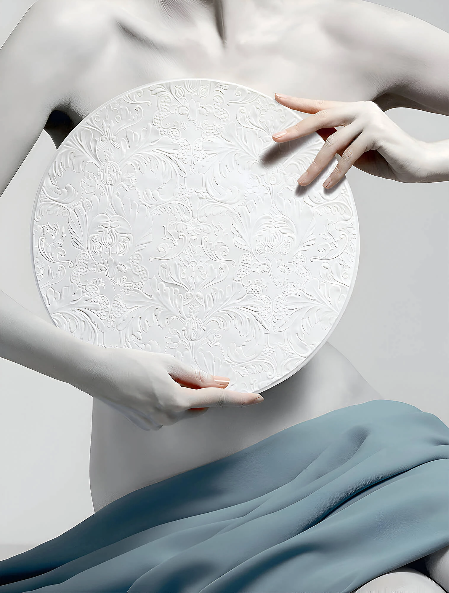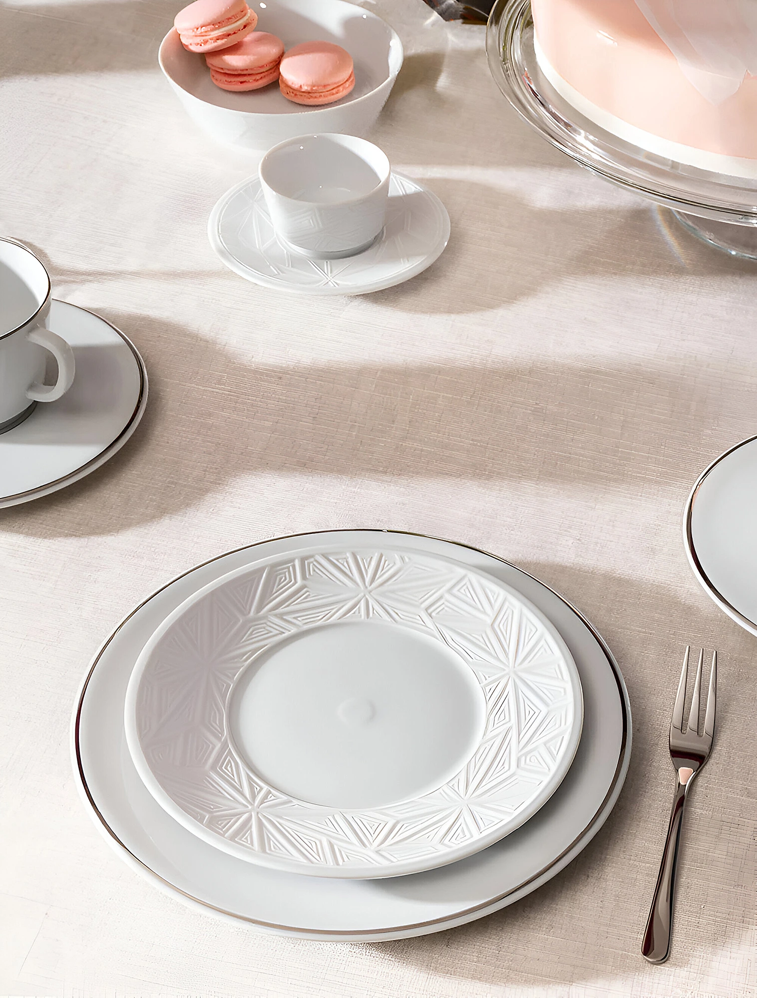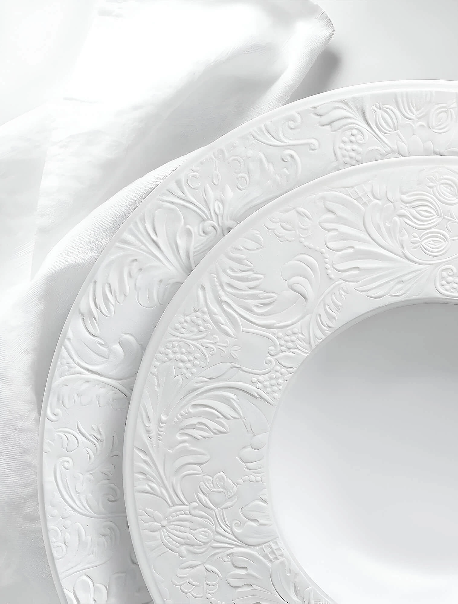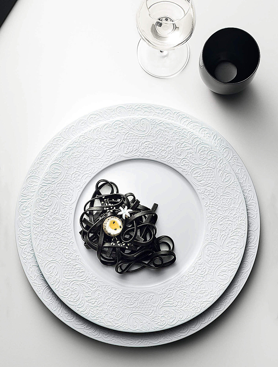 Бисквитный фарфор встречается в коллекциях лиможского бренда Degrenne. Тарелки из серии L Couture покрыты глазурью только в центре, а бортики намеренно оставлены бархатистыми. За счёт этого рельефный кружевной узор на посуде выглядит более живым и фактурным.