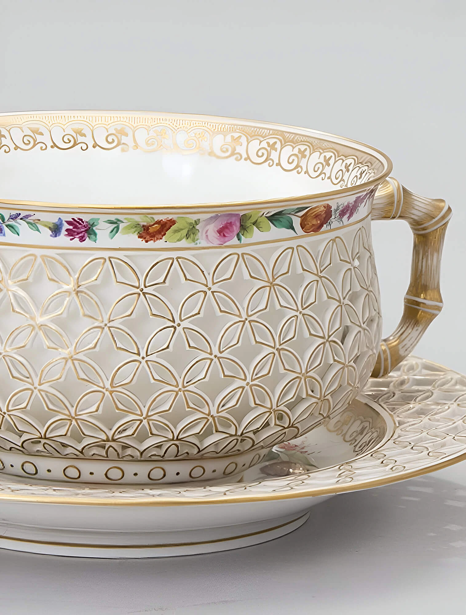 Помимо богатой цветовой палитры, изделия из Севра выделялись новаторскими техниками декорирования. Например, мануфактуру прославил «сетчатый» фарфор: ажурный узор, напоминающий тонкое кружево, вырезали на сырой глиняной заготовке.