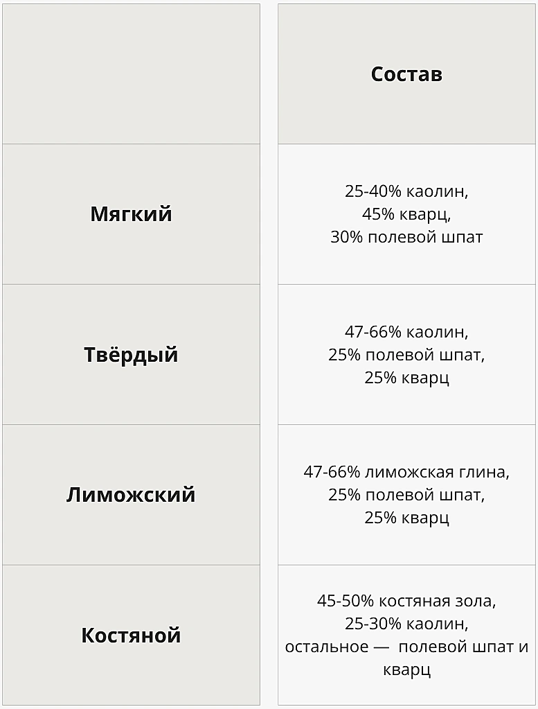 Существует три базовые разновидности фарфора — твёрдый, мягкий и костяной фарфор. Всё остальное — их вариации.