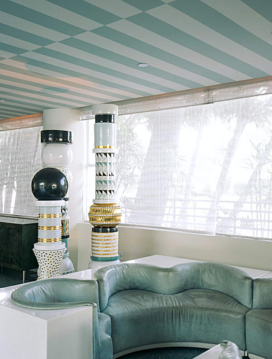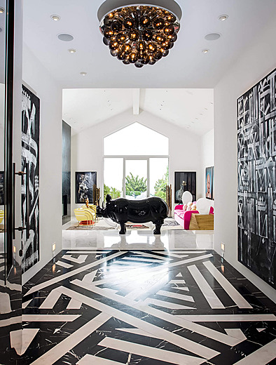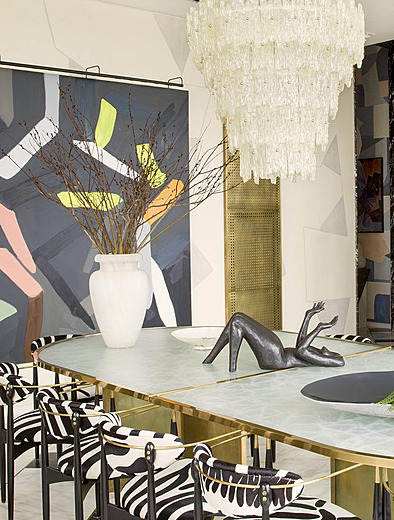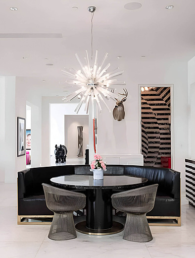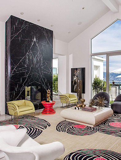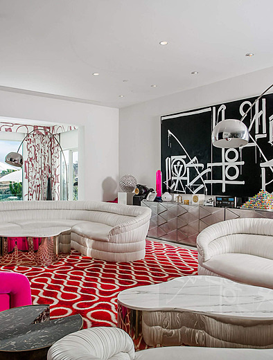 Она часто работает с дорогими тканями, анималикой, металлом и зеркальными поверхностями. Они придают помещению ощущение роскоши, напоминая дома старых звёзд американского кино.