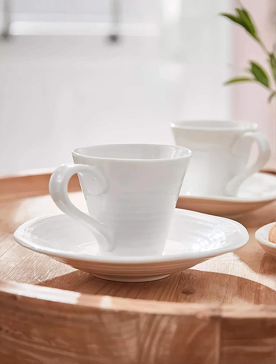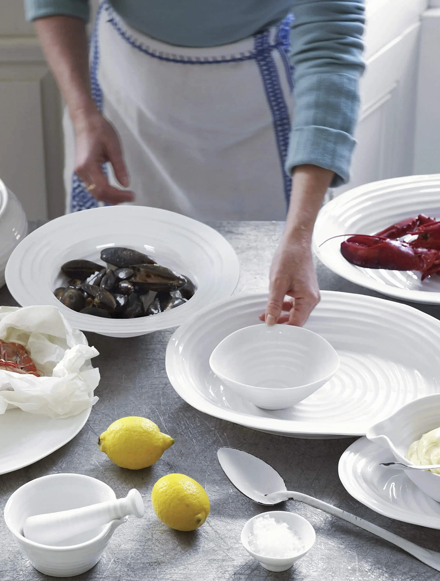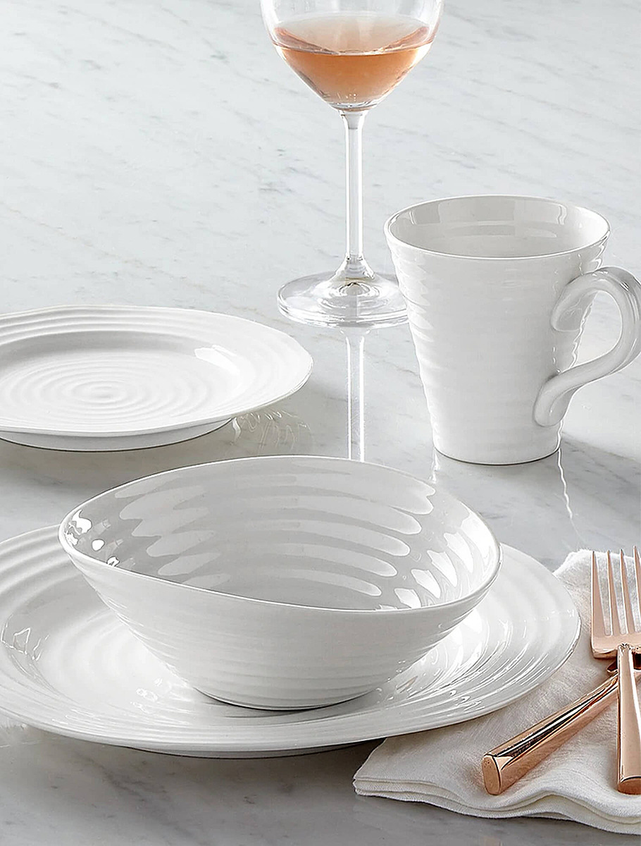 В дизайне коллекции для Portmeirion Софи объединила эстетику спокойного японского минимализма с английской эксцентричностью. У белоснежной посуды слегка неровные края и волнистый рельеф — кажется, что она сделана на гончарном круге. Чтобы добиться такого эффекта, керамист Portmeirion Кевин Миллуорд вручную вылепил прототипы для каждого предмета коллекции.
