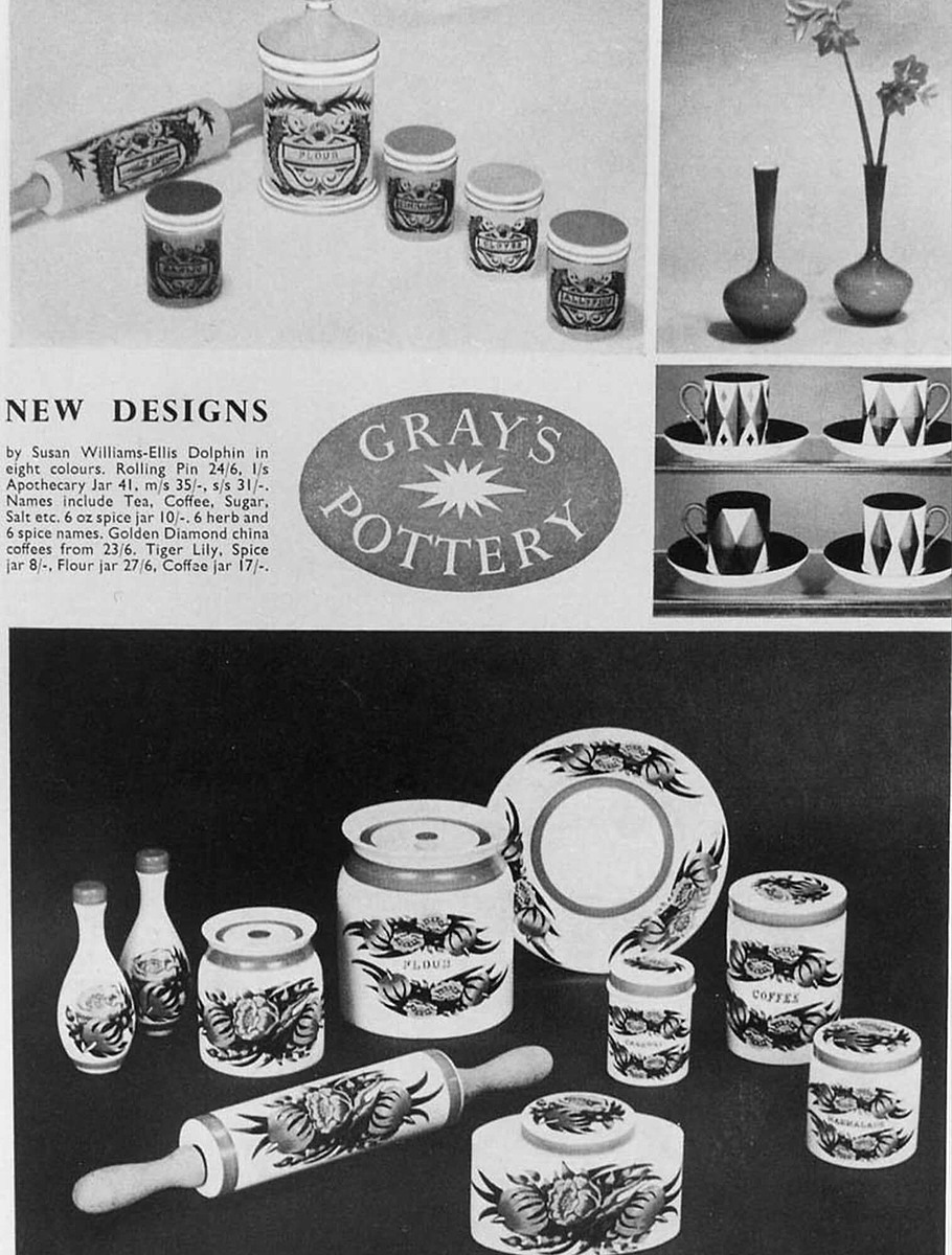 В 1950-х Сьюзен создала серии «Дельфины» и «Малахит». Их дизайн передавал атмосферу приморской деревни и отличался универсальностью: один и тот же переводной принт можно было использовать для разных предметов. Сейчас «Дельфины» и «Малахит» считаются одними из самых знаковых ранних произведений Уильямс-Эллис.