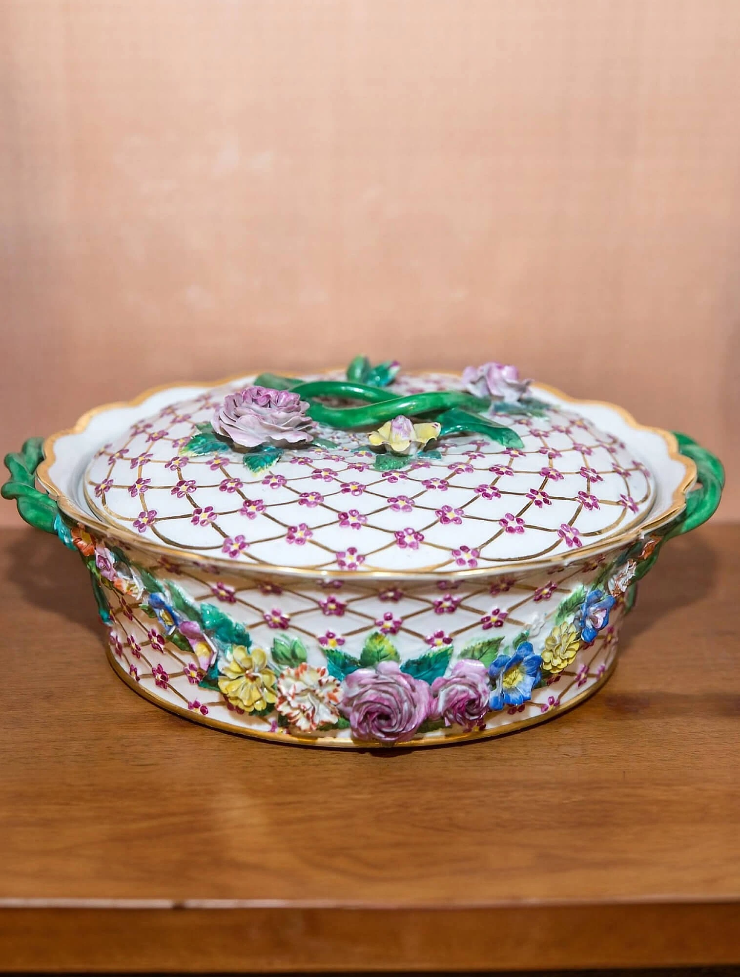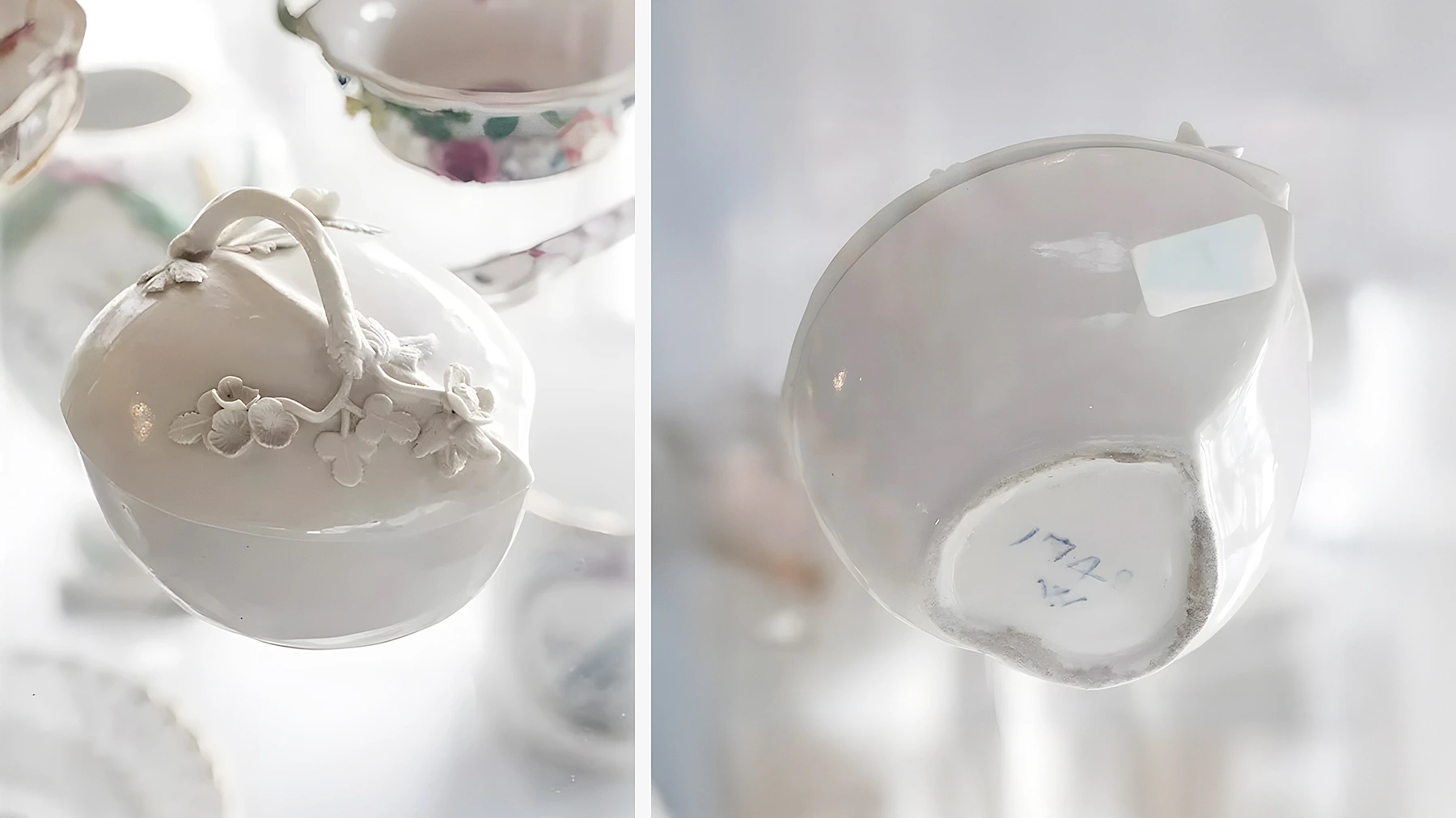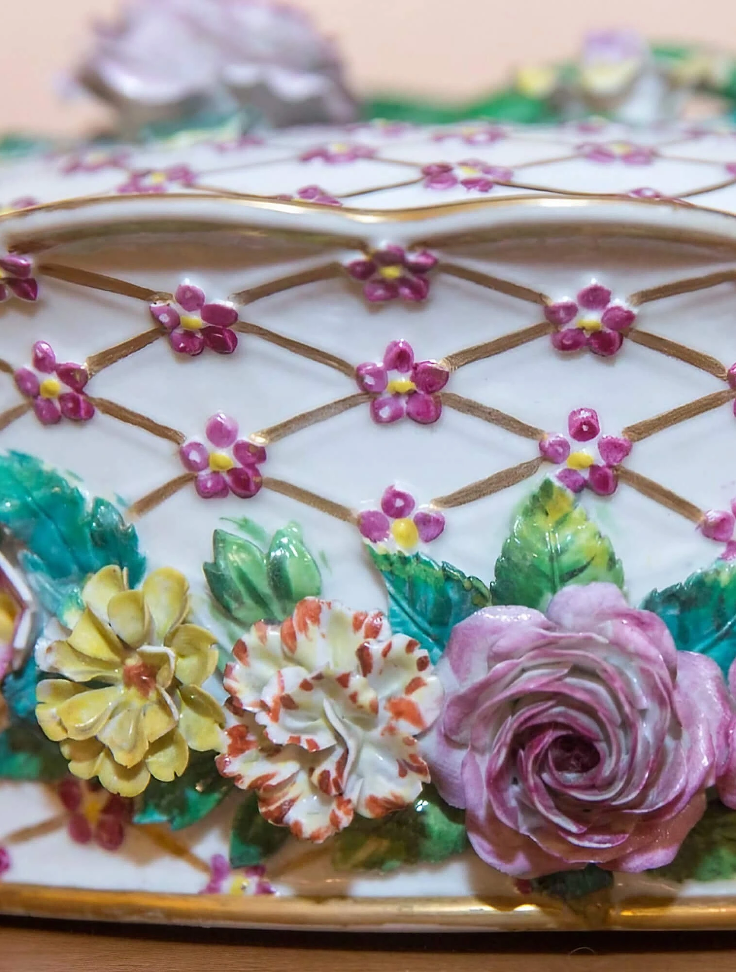 Особенностью набора стали предметы с гирляндами из роз. Крепили цветы с помощью жидкой разведённой фарфоровой массы. Каждый бутон и листик создавали вручную, поэтому фарфоровые розы уникальны и не повторяются.
