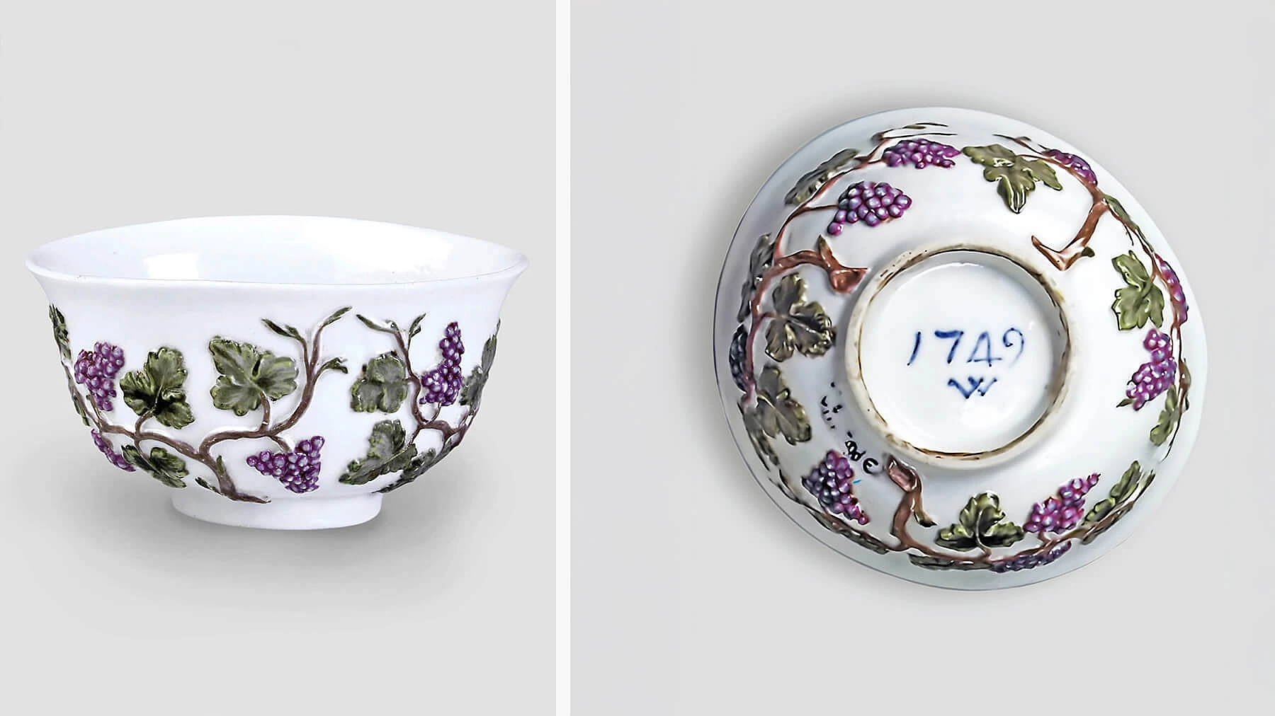 Сохранилось около 200 предметов виноградовского периода и только 9 изделий с клеймом самого учёного. Одно из них — чашка с рельефными виноградными гроздьями из собрания Эрмитажа. Клеймо Виноградова в виде буквы W и дата изготовления 1749 год выполнены подглазурной синей краской. Роспись чашки стилистически отсылает к мейсенскому фарфору, который был образцом для Невской мануфактуры.