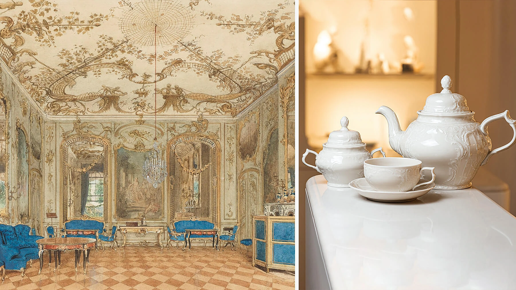 История коллекции начинается в середине 18 века. Прусский король Фридрих Великий заказал у той самой Королевской мануфактуры сервиз специально для нового дворца в Потсдаме. Рельеф посуды цвета слоновой кости повторял лепнину эпохи рококо на сводах дворца Сан-Суси.