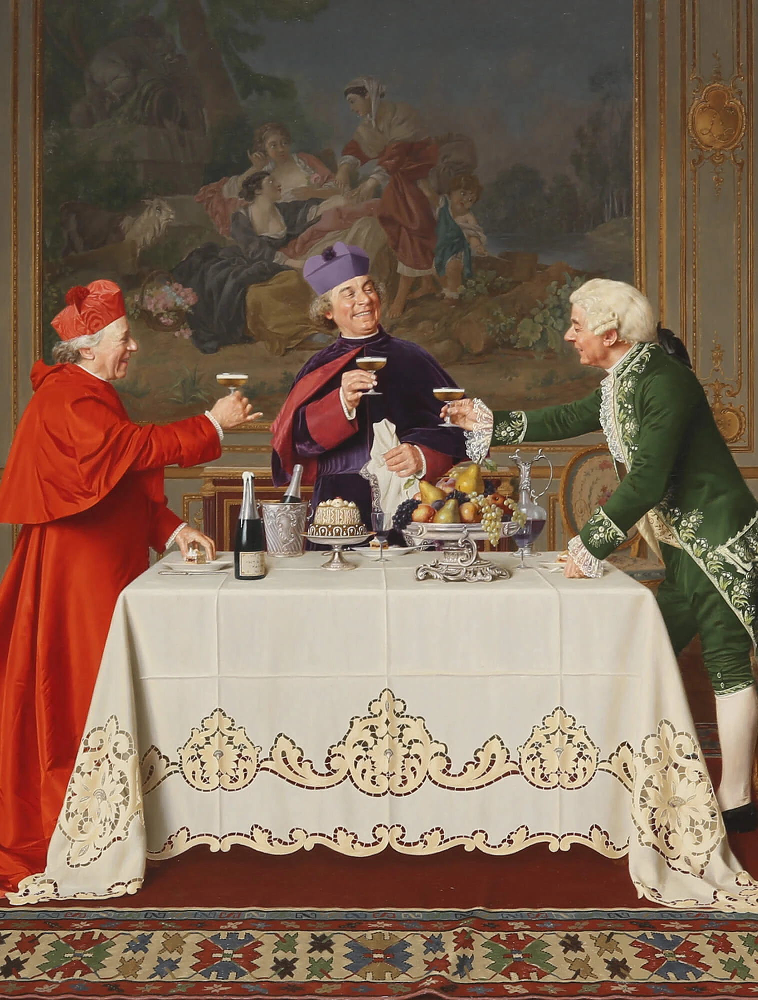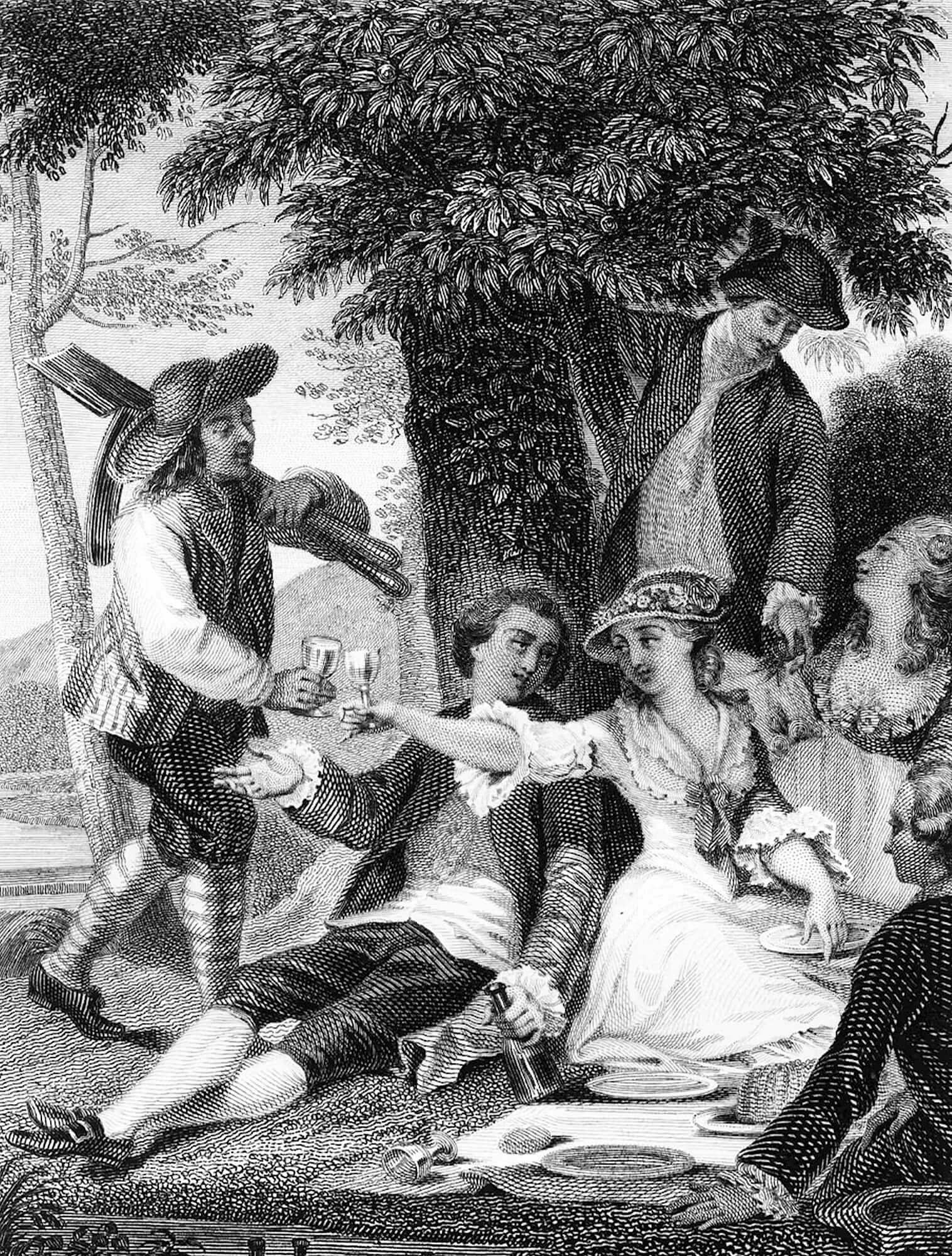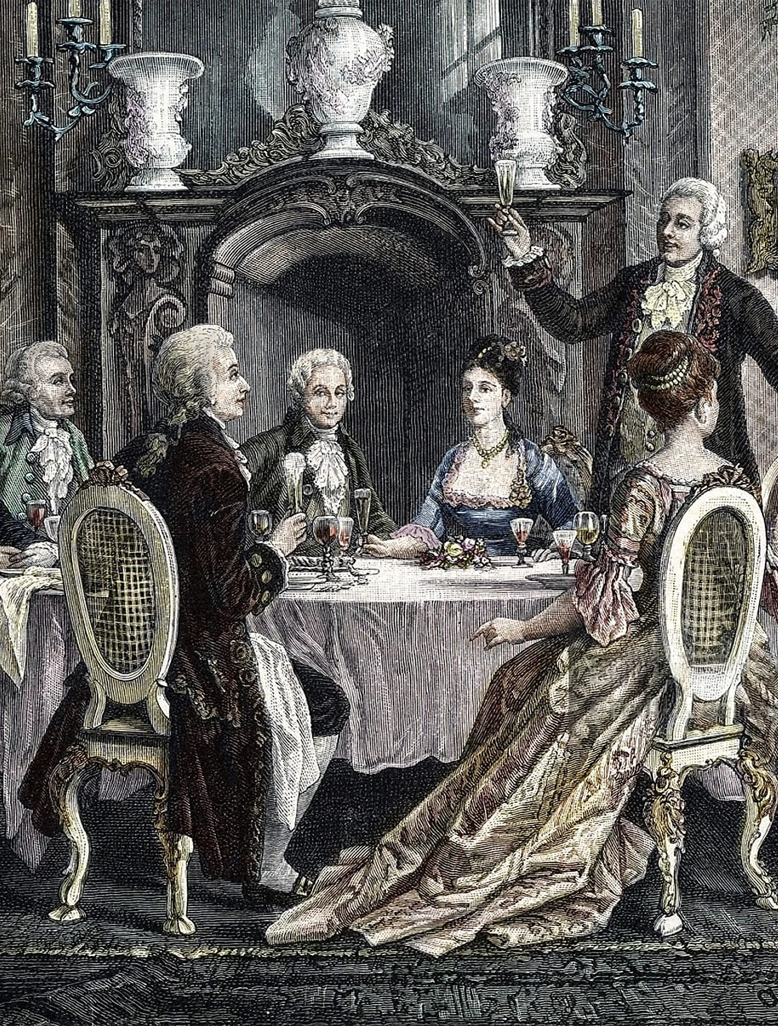 Шампанское пили из широких бокалов в форме чаши — тех самых креманок (coupe), появившихся в конце 17 века. Напиток воспринимали как модный символ принадлежности к кругу образованных и обеспеченных людей.