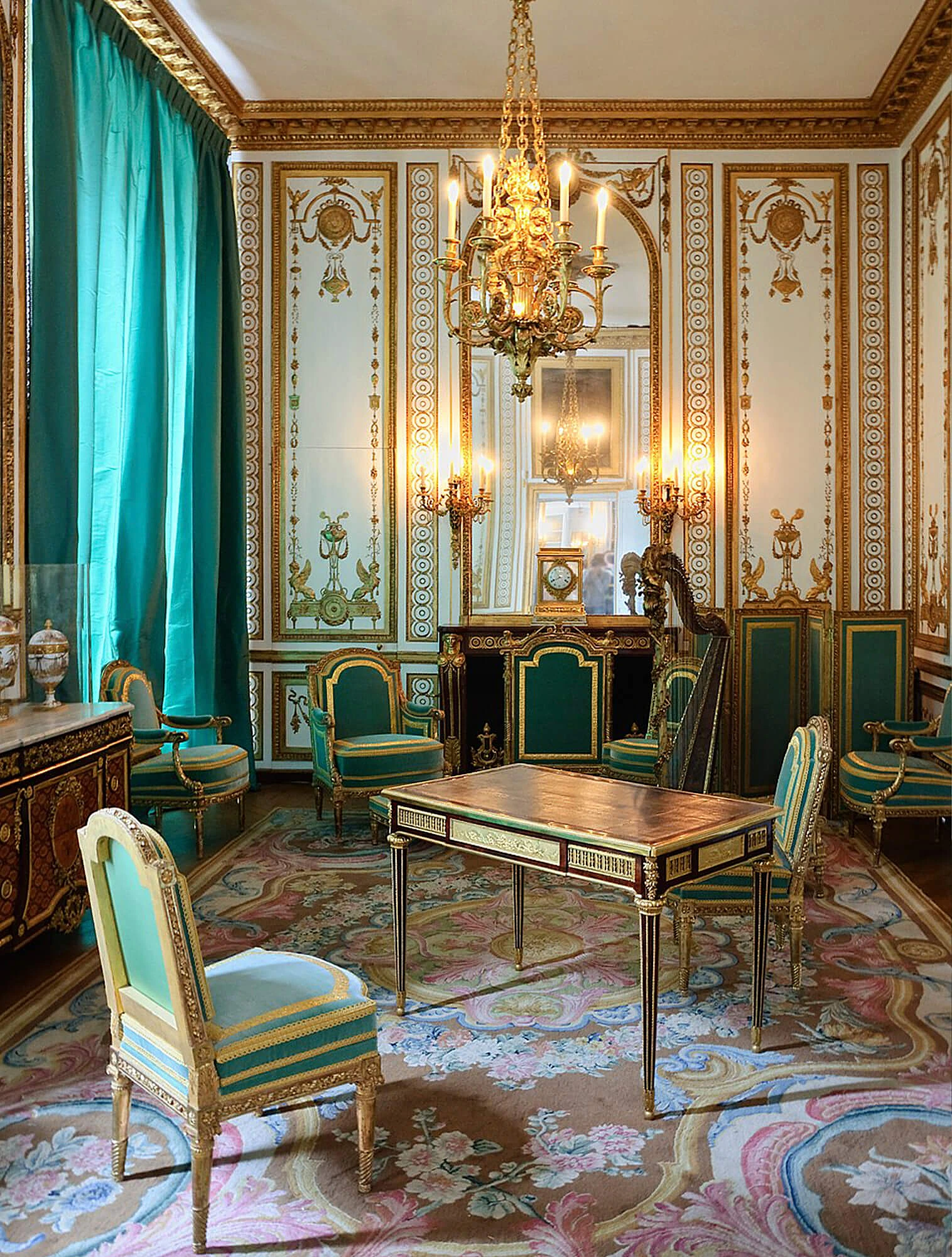 Тот же принцип работает и в мебели. Резные элементы, позолота, бронзовые накладки располагаются по углам в местах соединений. В результате даже самая нарядная классическая мебель не выглядит перегруженной.