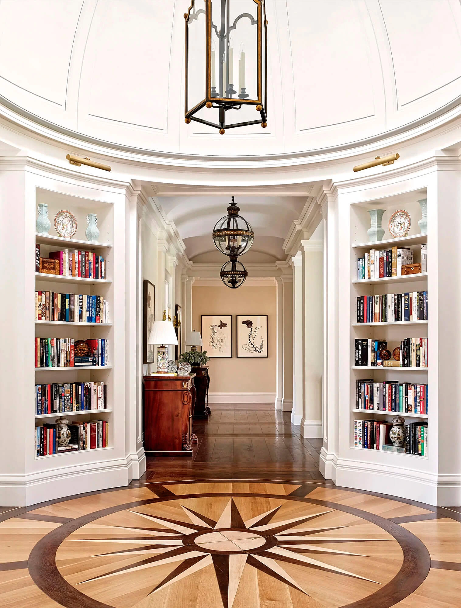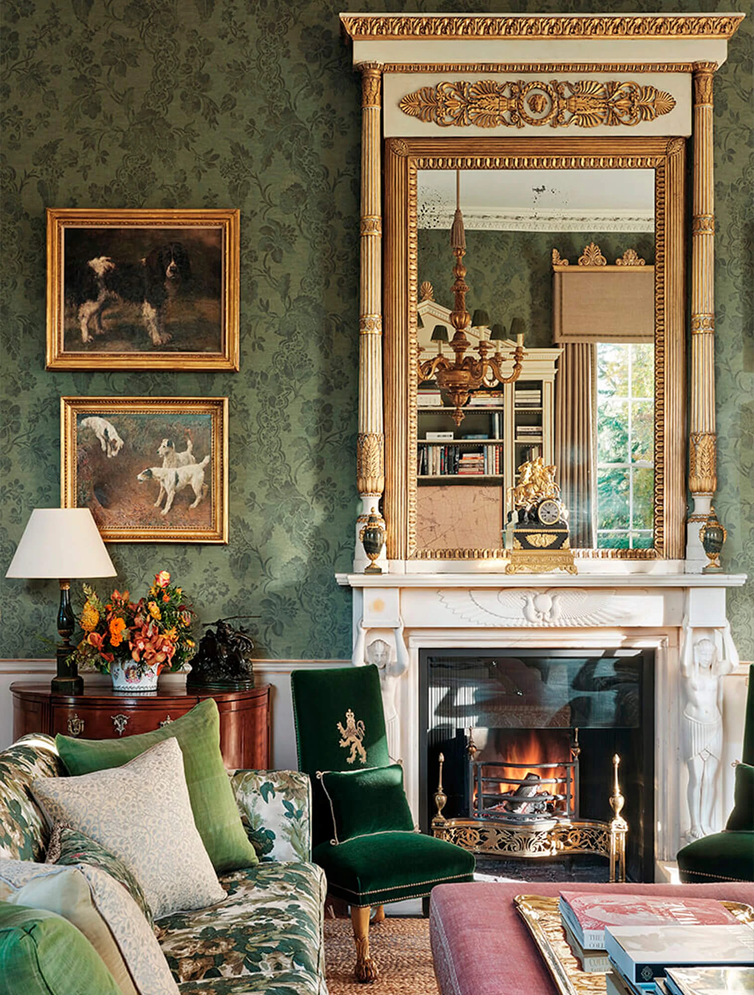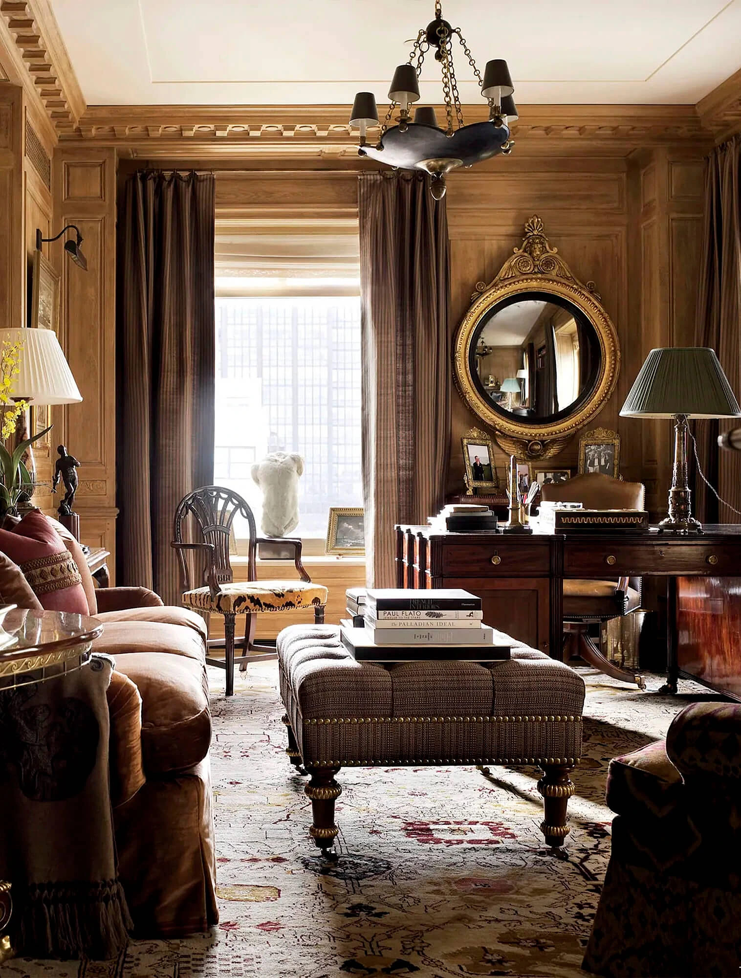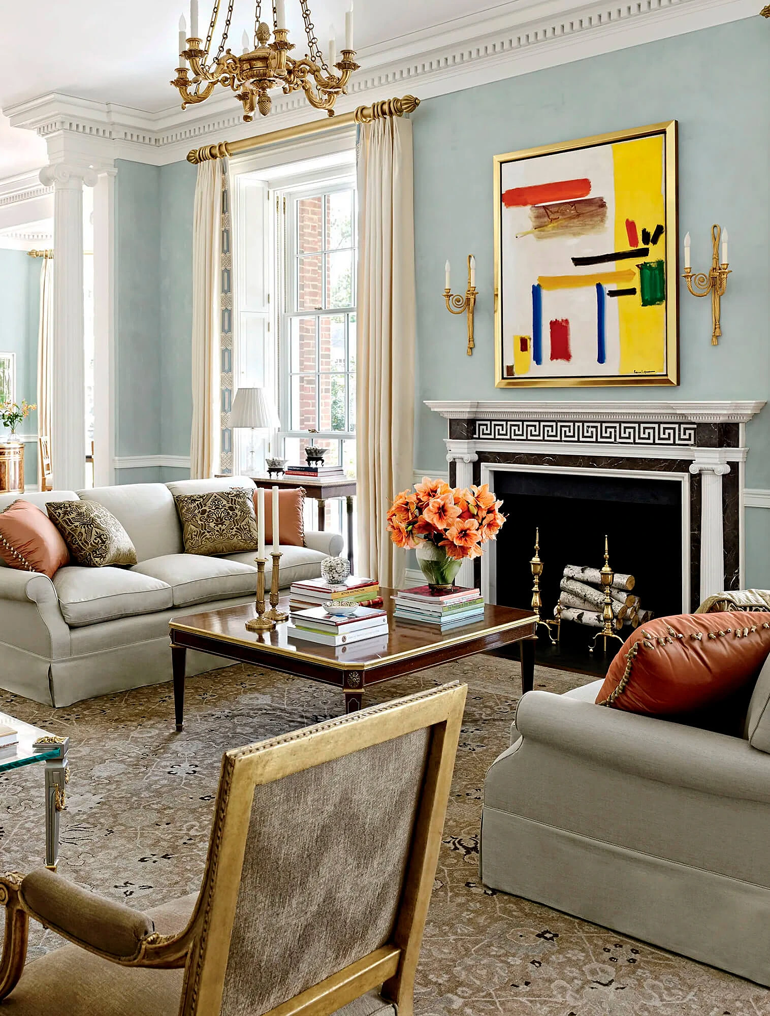 Классический стиль в интерьере также отличается симметрией: два кресла по бокам камина, два торшера, парные вазы на каминной полке. Центральный элемент комнаты, например, стол, окно или зеркало, задают направление, и всё пространство выстраивается вокруг него.