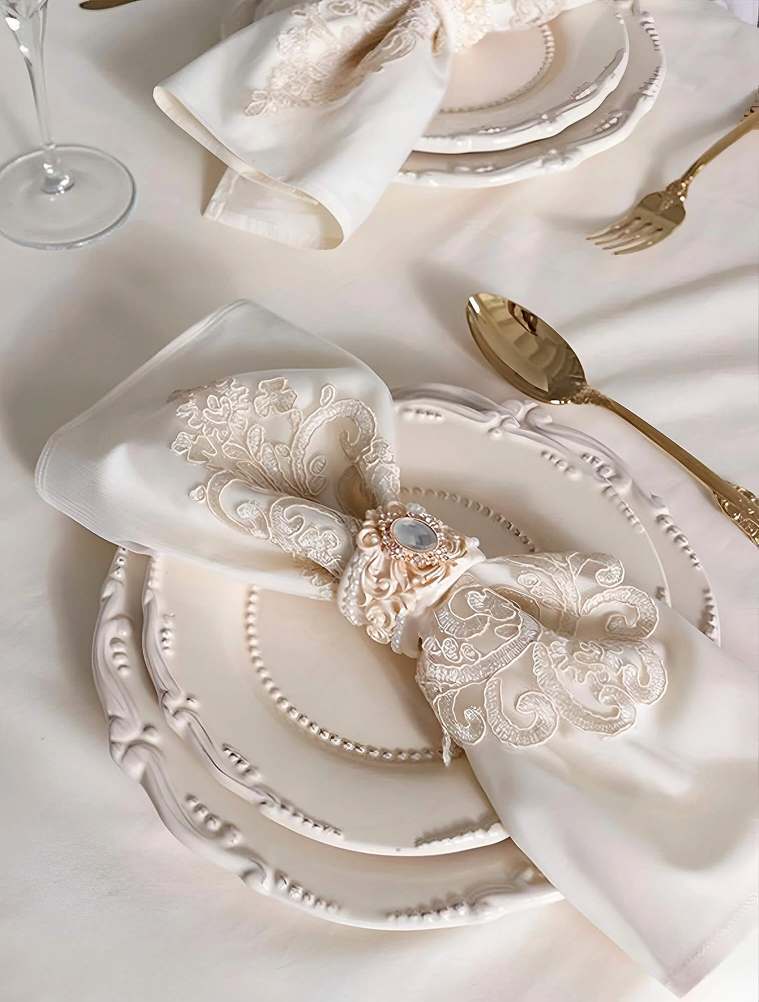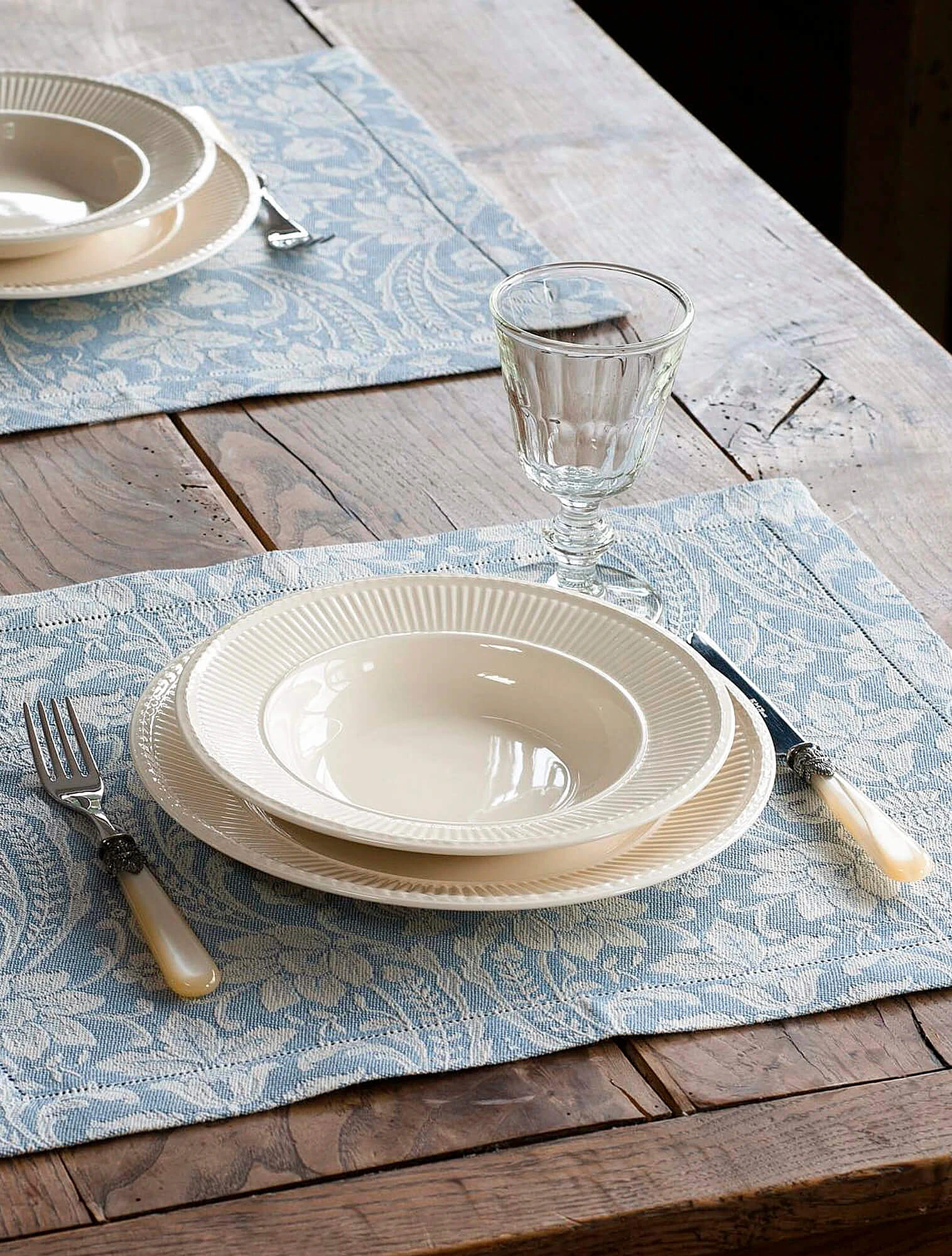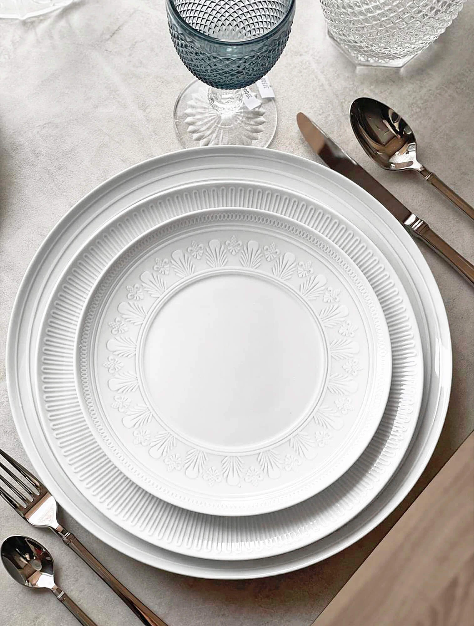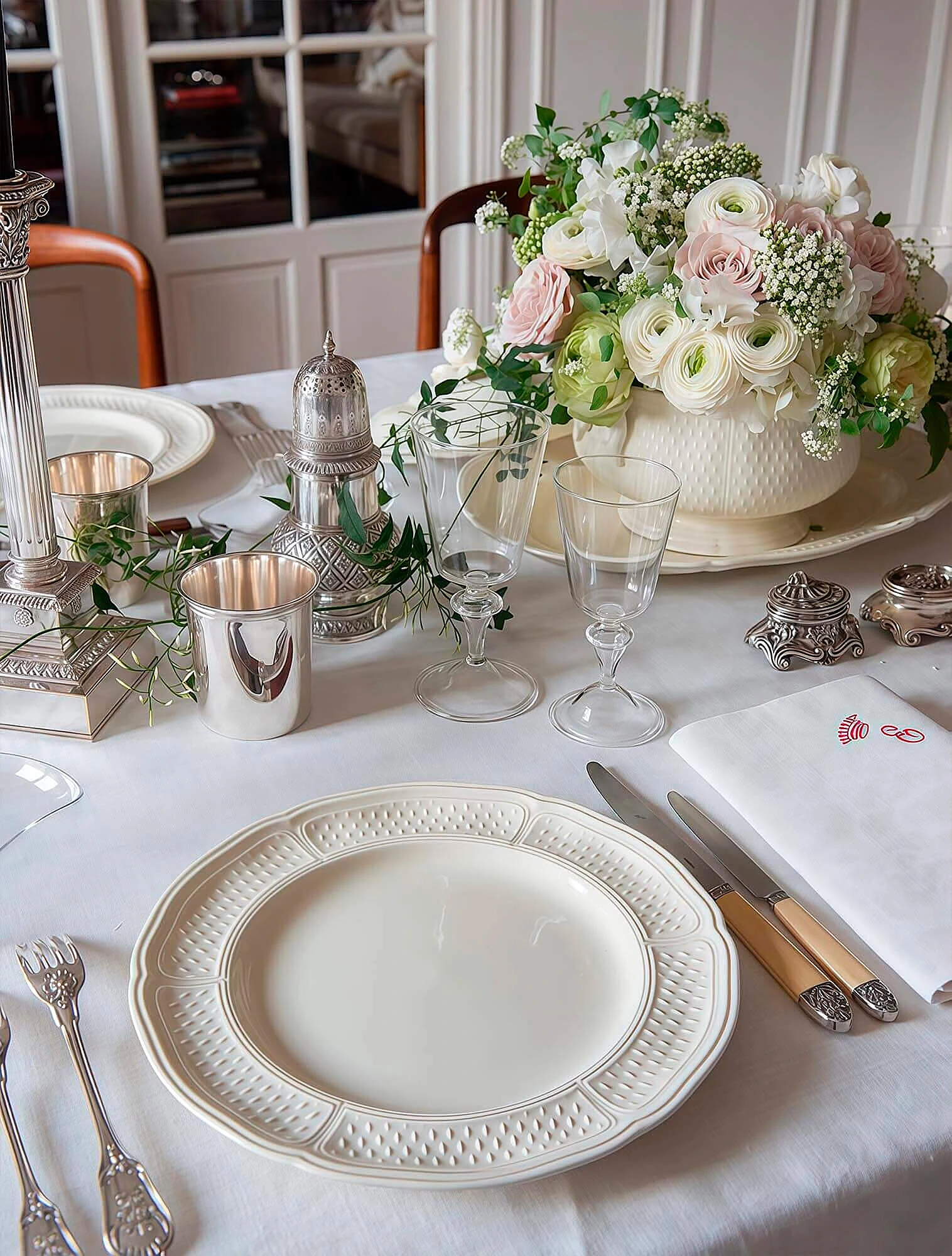 Материал — фарфор, хрусталь, серебро. Фарфоровые сервизы обычно белого или кремового цвета, они могут быть украшены рельефным узором или позолотой. Хрустальные бокалы — с традиционной огранкой. В отличие от тонкого стекла, хрусталь даёт яркий блеск, а грани усиливают игру света. Это создаёт эффект торжественности, характерный для классического стиля.