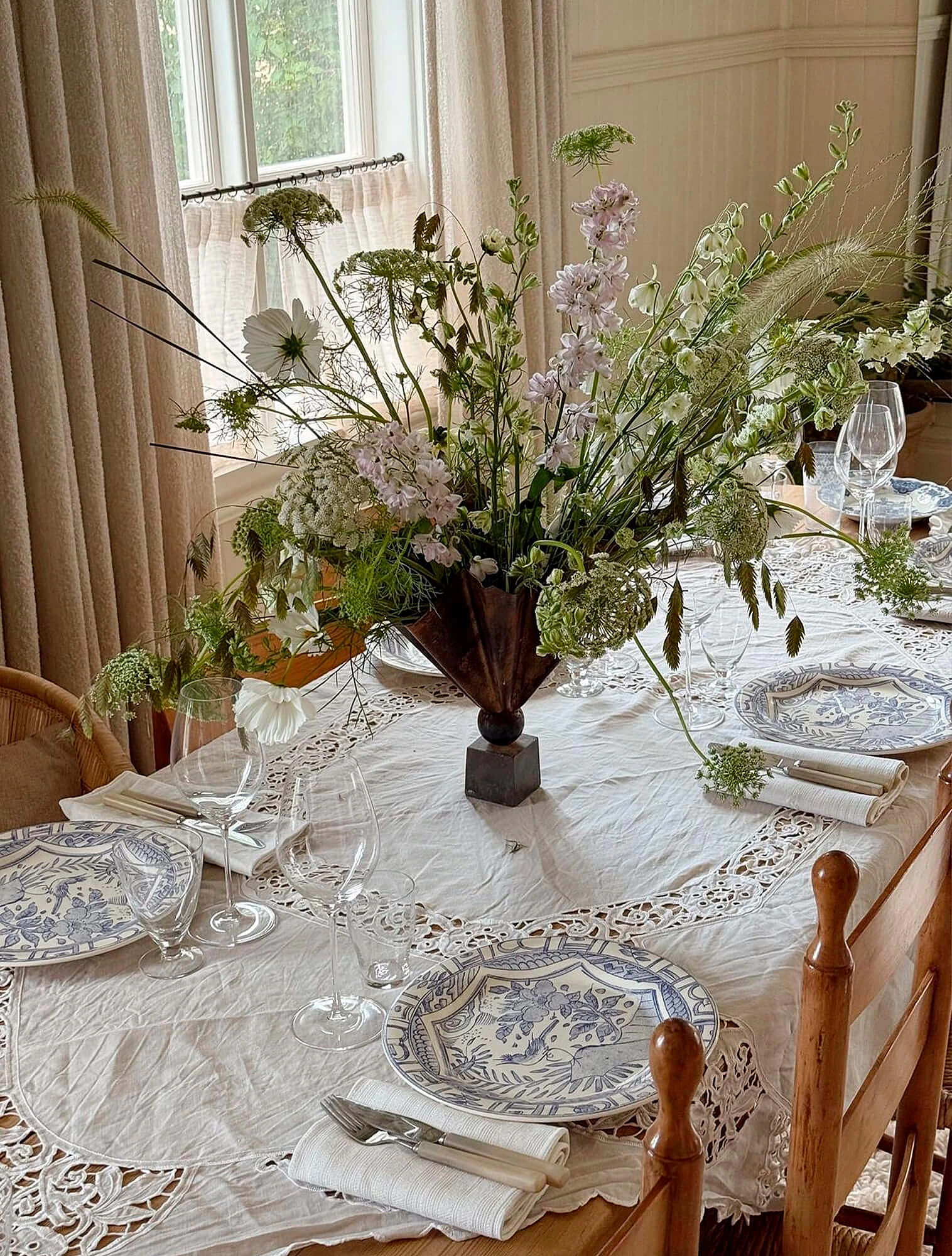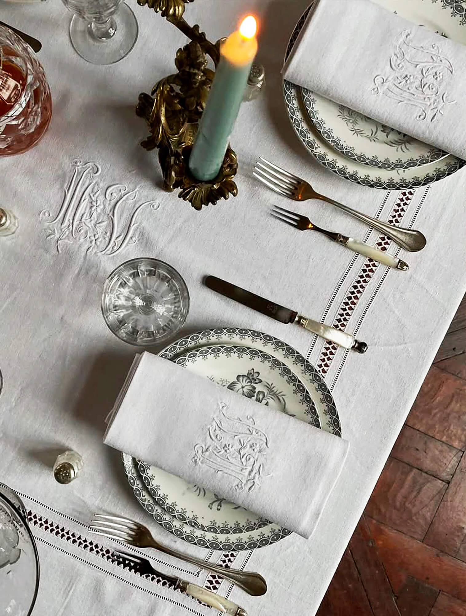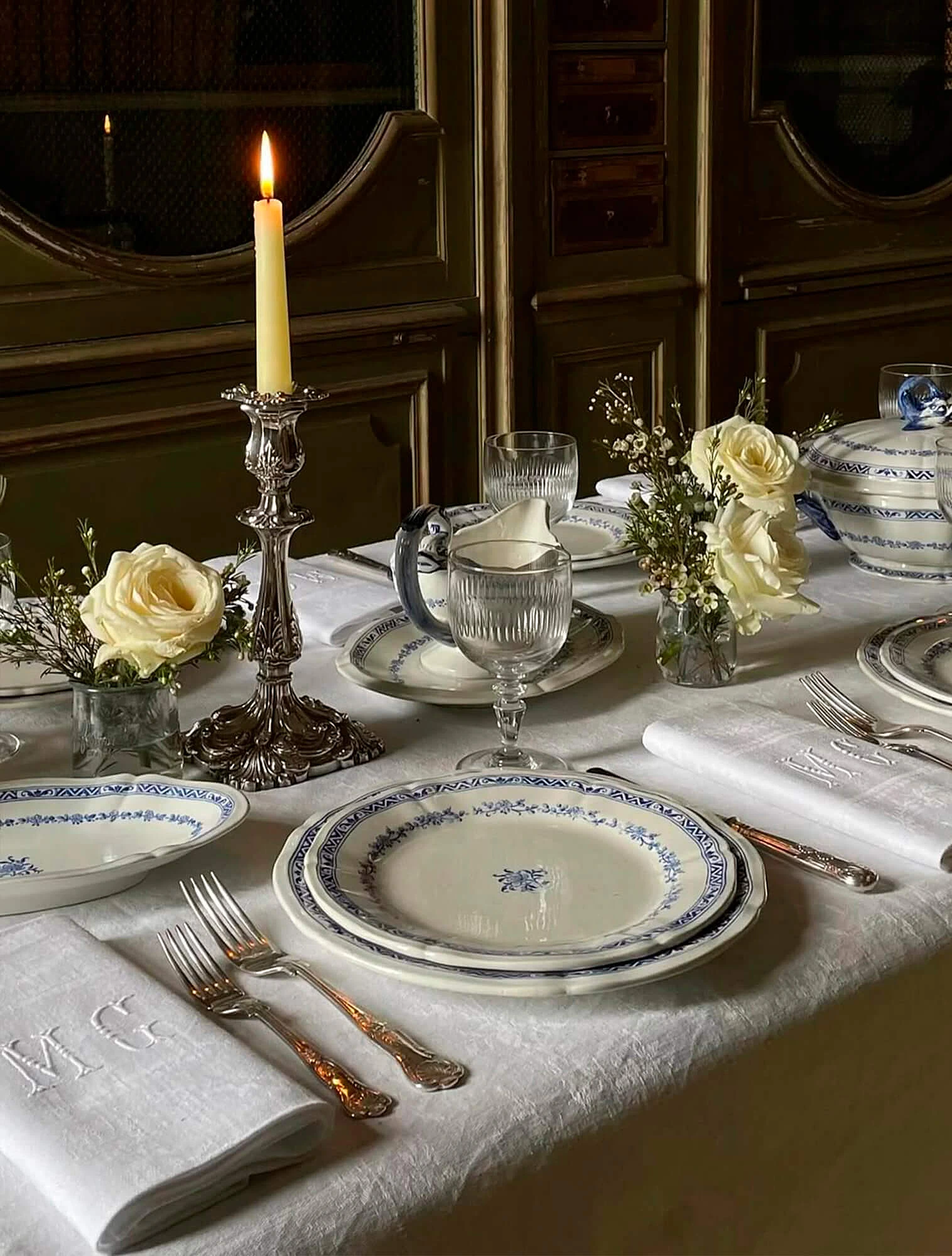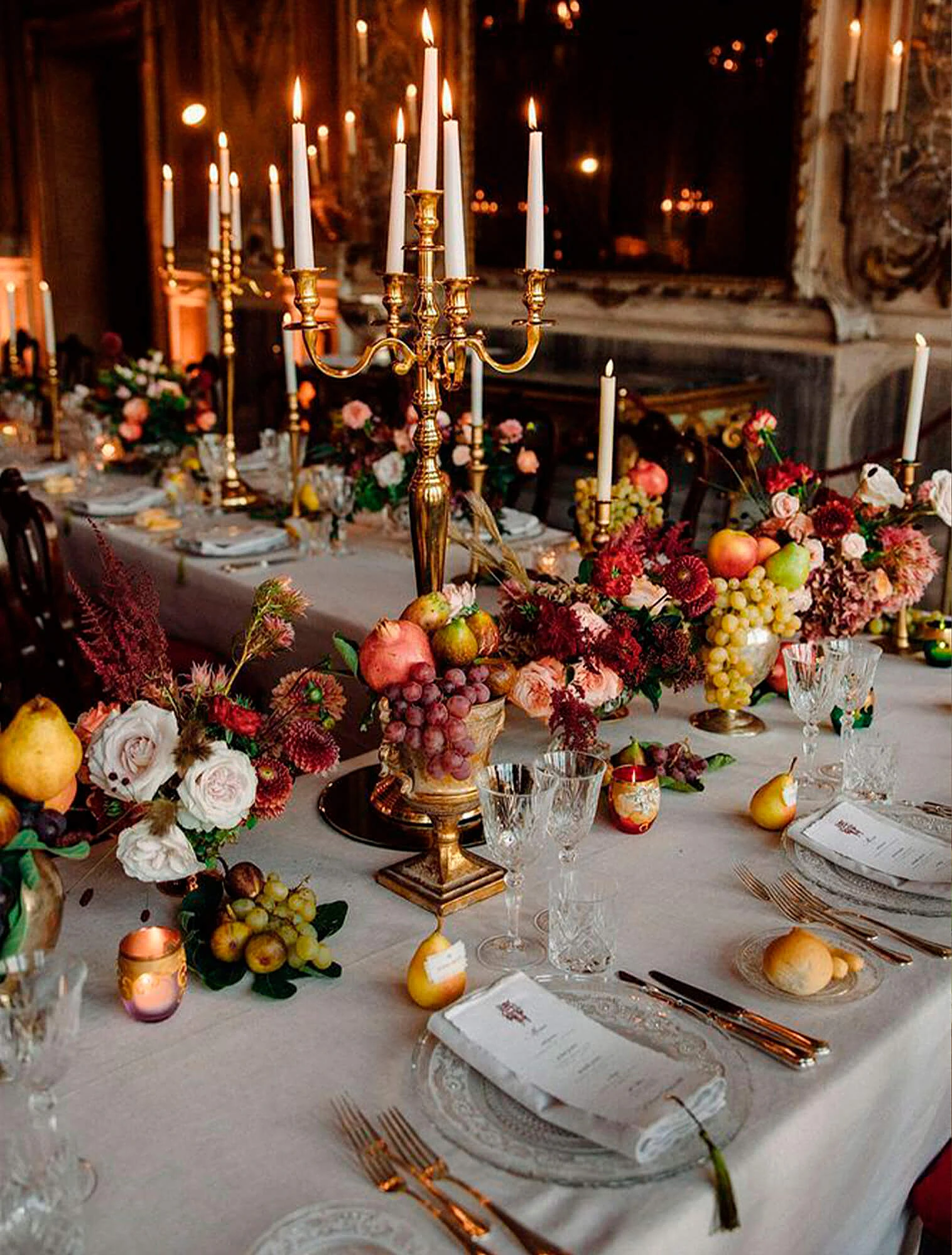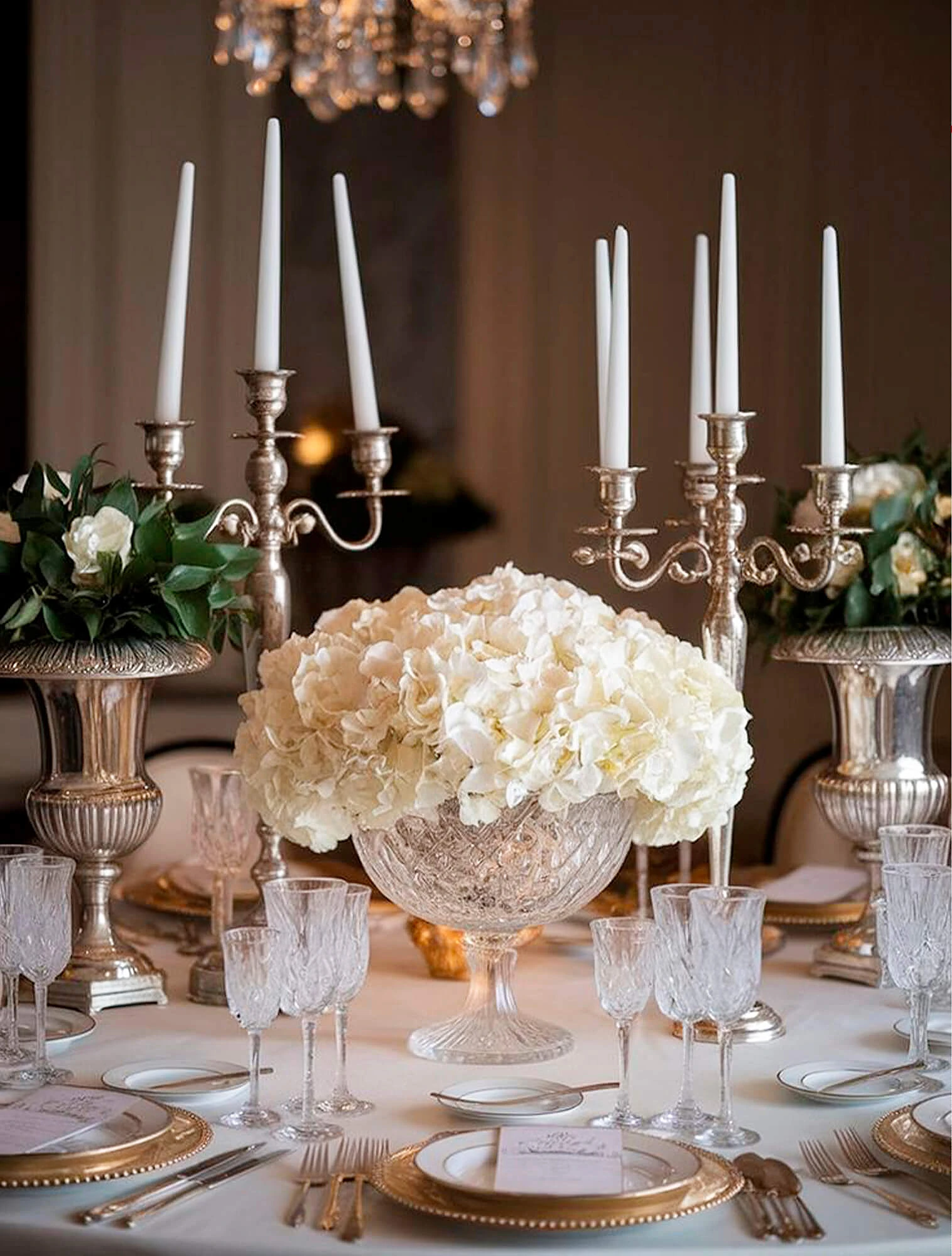 Декоративные элементы — подсвечники, канделябры, небольшие статуэтки. Материалы те же, что и в посуде: хрусталь, серебро, бронза, фарфор. Важно соблюдать симметрию: парные подсвечники по краям стола, ваза в центре. Свечи в классической сервировке используются только белые, без декора. Обилие мелких деталей не приветствуется.