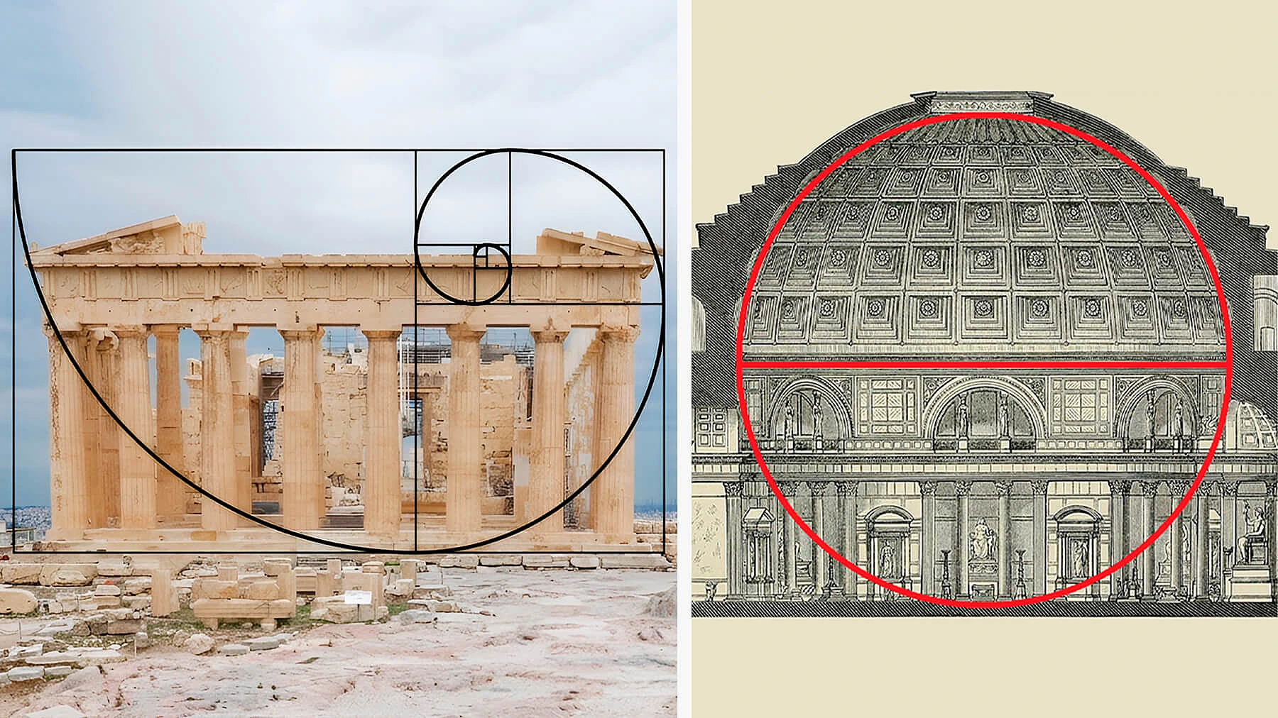 Парфенон — древнегреческий храм, расположенный на афинском Акрополе. Его фасад построен именно на основании этой пропорции, его ширина относится к высоте как 1,618 к 1.