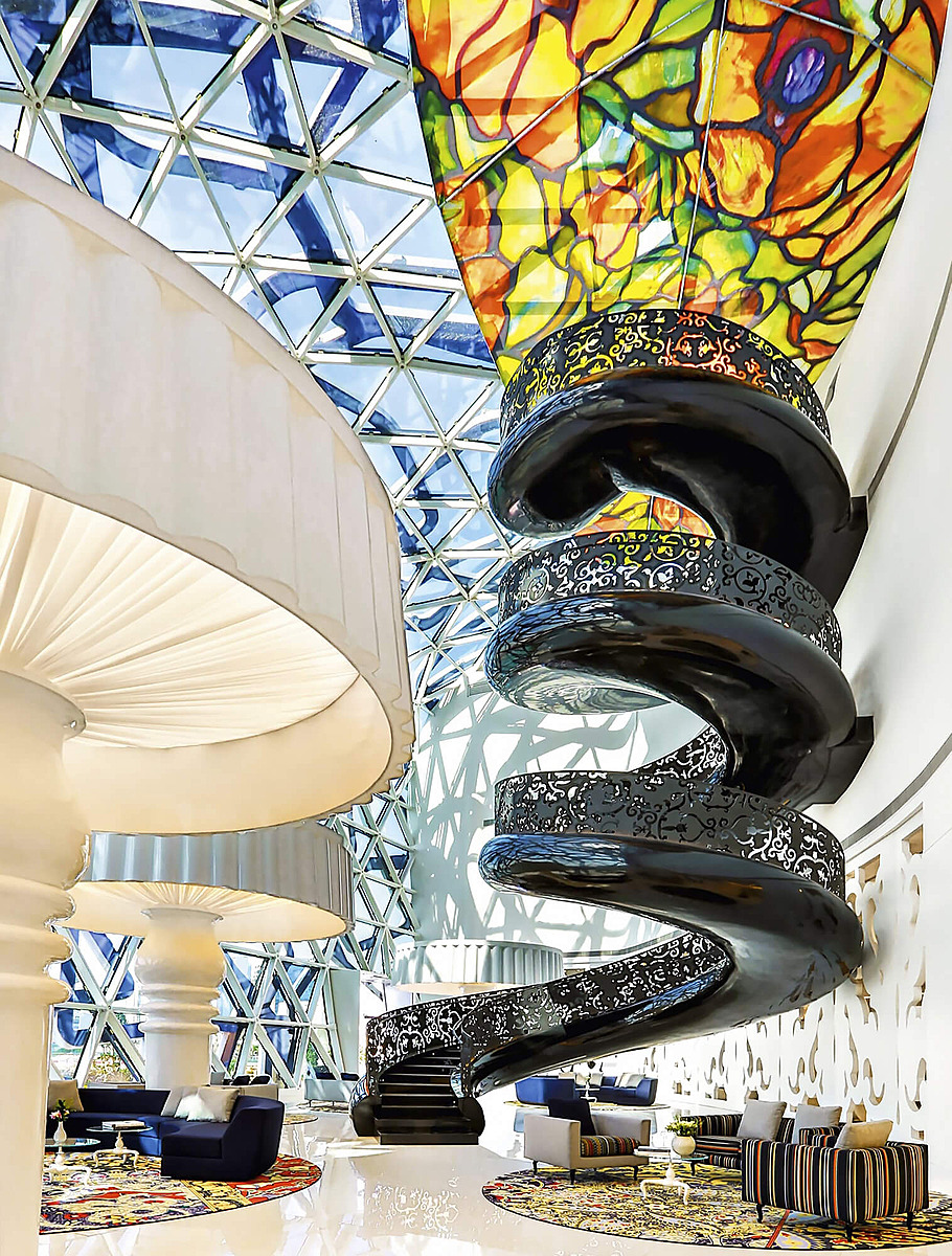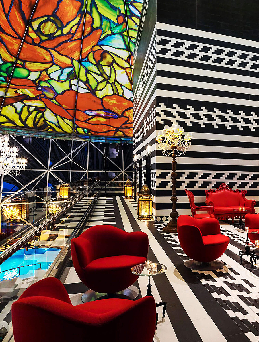 В Mondrian Doha Вандерс создал экстравагантный интерьер, сочетающий арабский фольклор с современным дизайном. Отель выделяется витражными потолками, золотыми лифтами, ажурными лестницами и мраморными полами. Каждая деталь интерьера отражает богатство ближневосточной культуры сквозь призму современного искусства Европы.