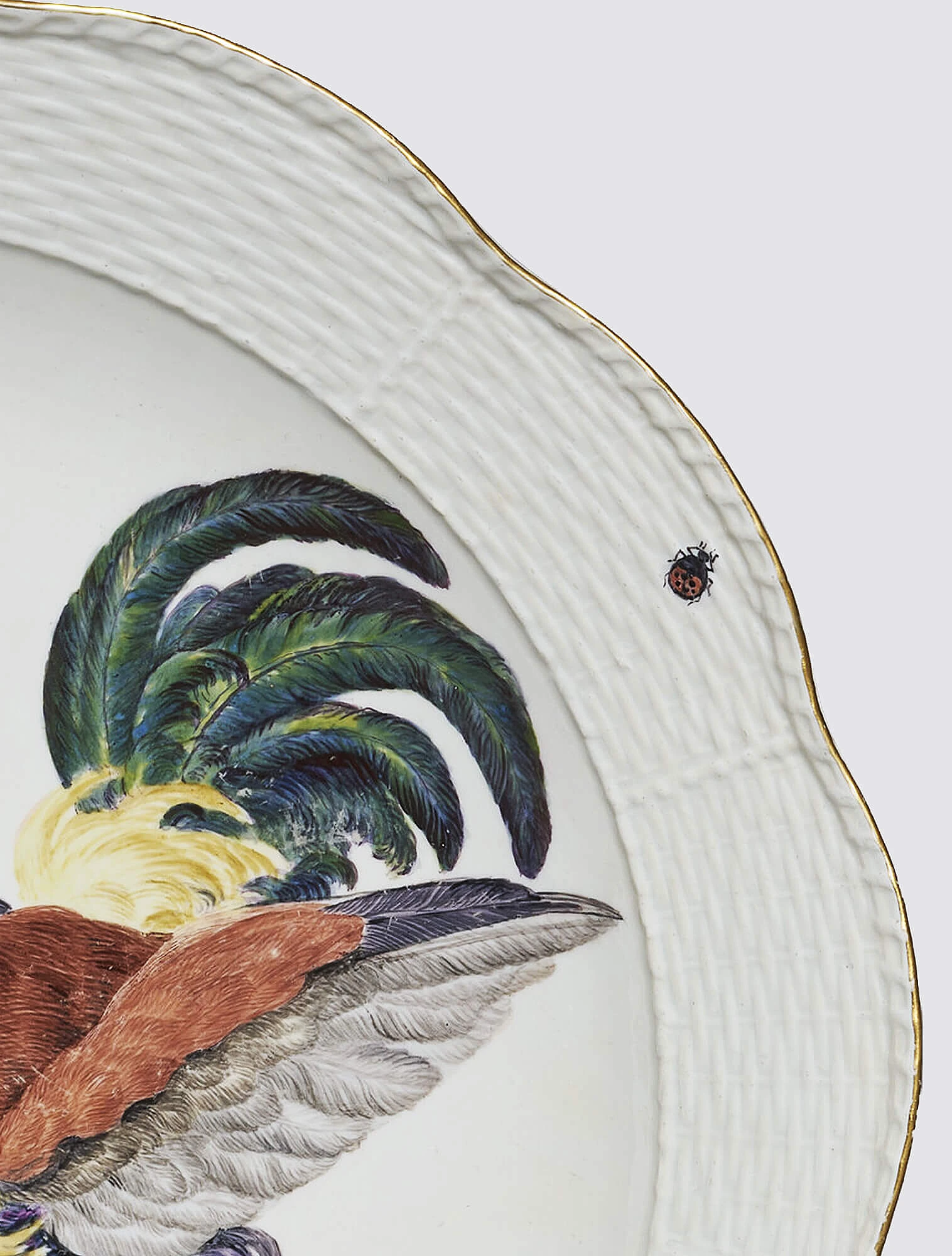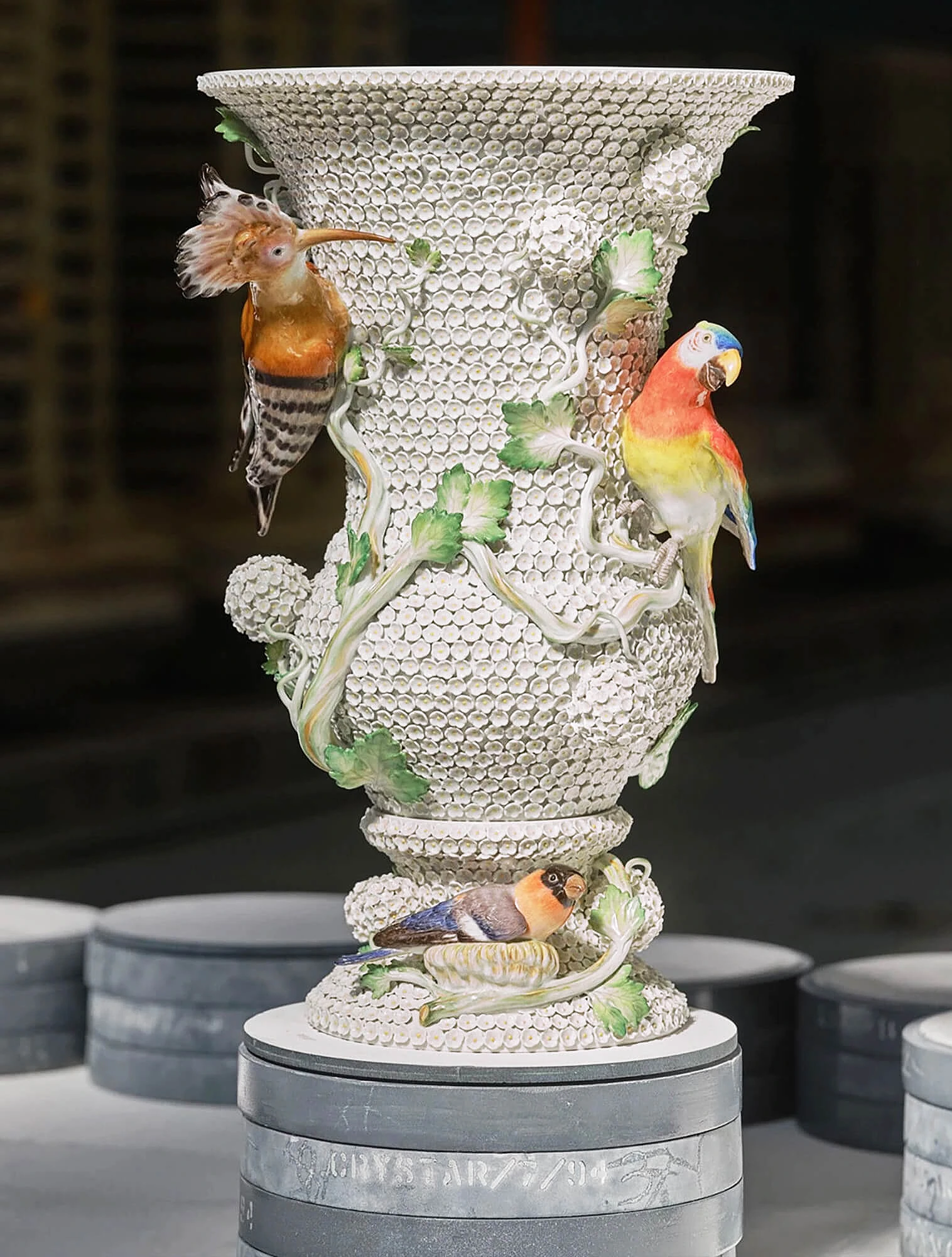 Одним из самых сложных и впечатляющих направлений мейсенской пластики стал так называемый new cutout — ажурный фарфор со сквозной резьбой. В этой технике делали вазы, корзины, блюда: их стенки вручную прорезали в сырой фарфоровой массе ещё до обжига, что требовало исключительной точности и большого опыта. Ажурные изделия казались почти невесомыми. Их создавали не столько для повседневного использования, сколько как художественные объекты, призванные продемонстрировать, на что способна мануфактура Meissen.
