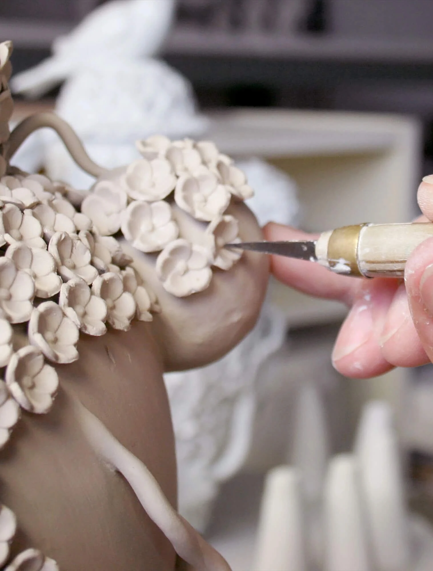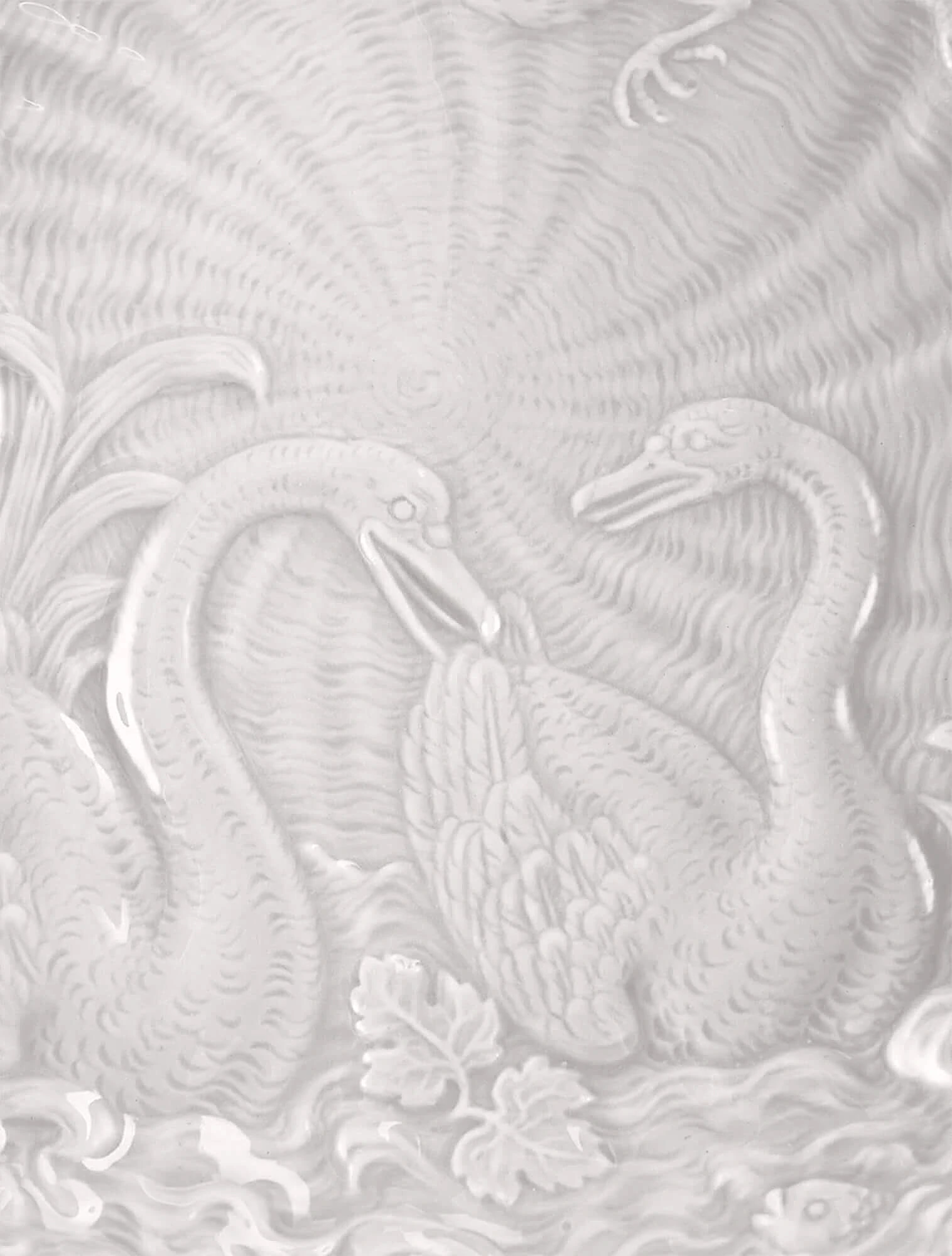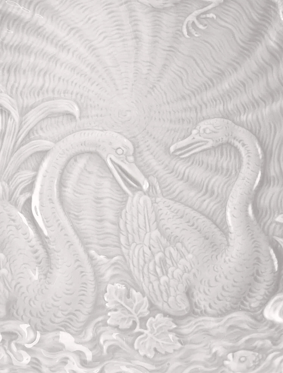 Рельеф создавался вручную и наносился ещё на сырую фарфоровую массу — с точным расчётом усадки при обжиге. Лебеди, волны и раковины не повторяются: их расположение, направление движения и глубина рельефа варьируются от предмета к предмету, создавая ощущение живой текучей поверхности.