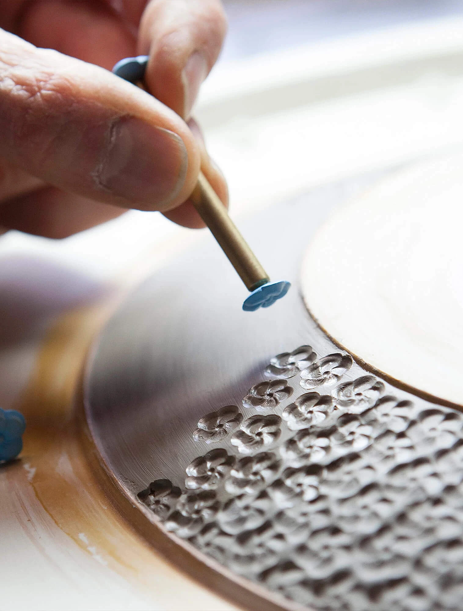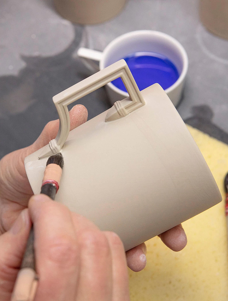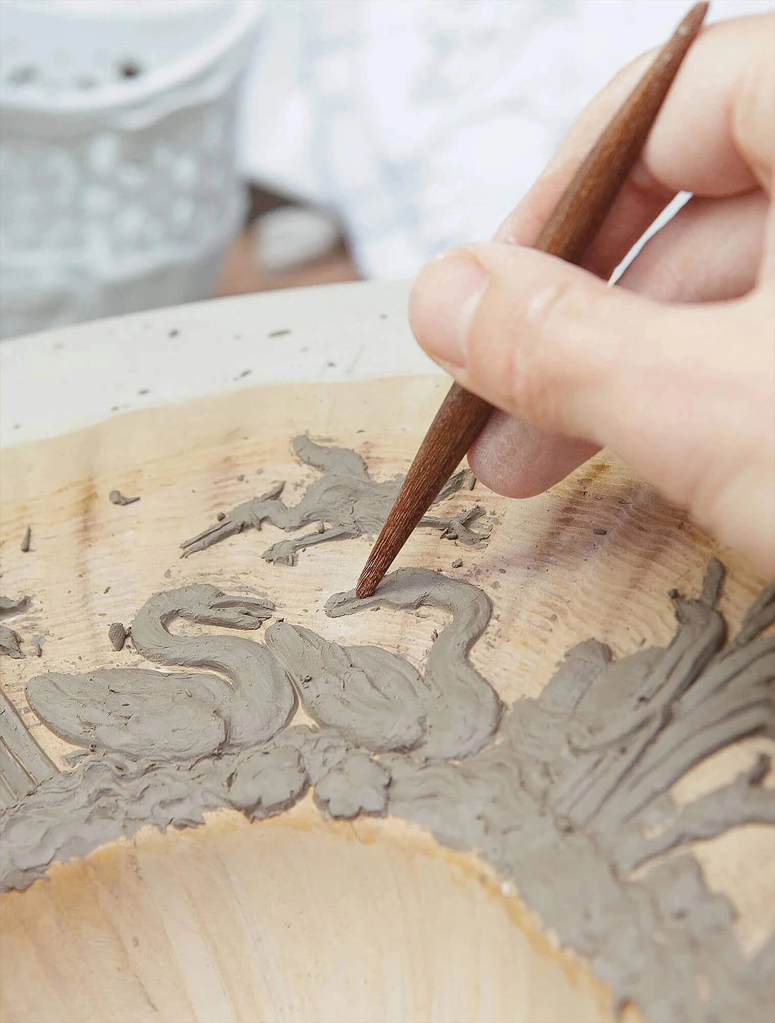 Рельеф создавался вручную и наносился ещё на сырую фарфоровую массу — с точным расчётом усадки при обжиге. Лебеди, волны и раковины не повторяются: их расположение, направление движения и глубина рельефа варьируются от предмета к предмету, создавая ощущение живой текучей поверхности.