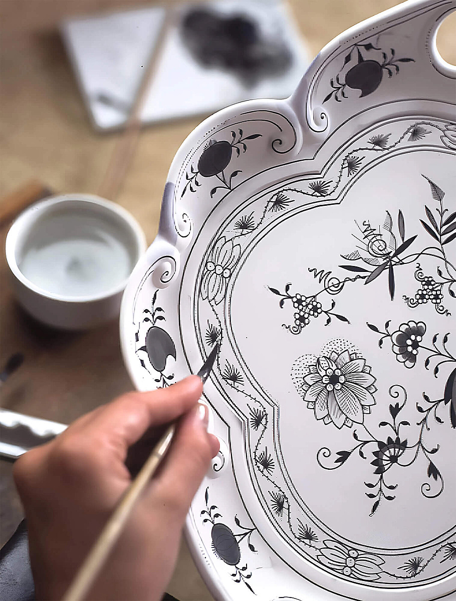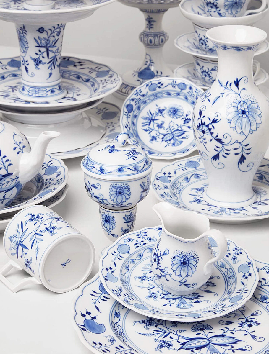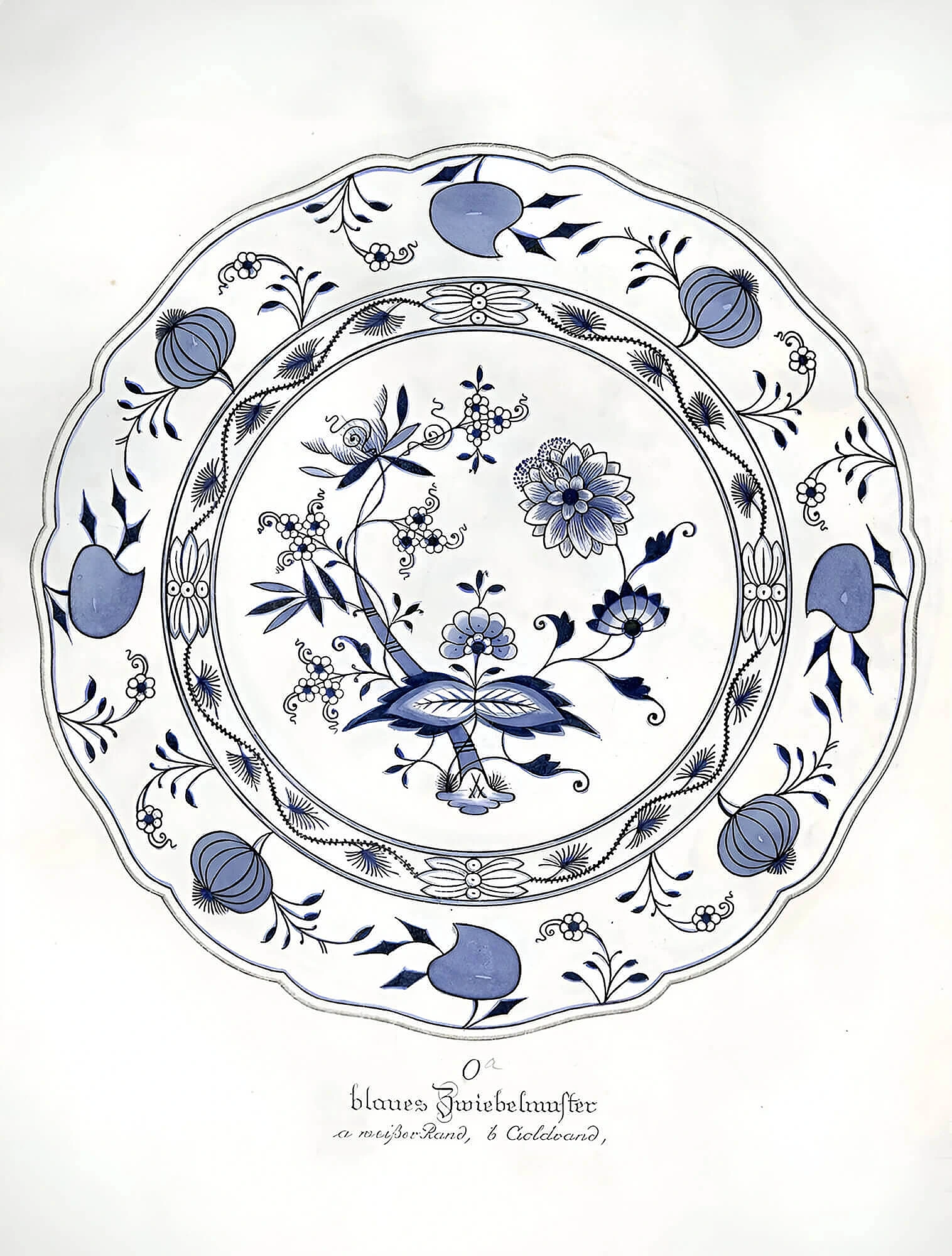 В 1731 году появляется самый узнаваемый мотив мейсенского фарфора, вдохновлённый восточными орнаментами — луковый узор (Zwiebelmuster). В этой росписи мастера использовали тот самый термостойкий кобальтовый пигмент: он сохранял глубокий синий цвет даже при высокотемпературном обжиге и зрительно подчёркивал белизну фарфора.