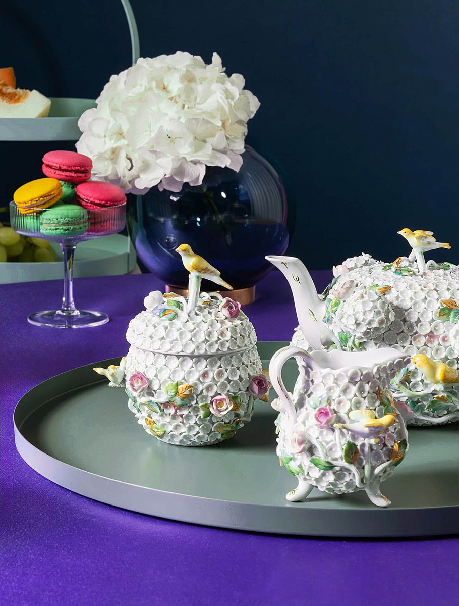 Например, истоки коллекции Royal Blossom уходят в 18 век к тому самому сервизу для невесты короля Августа III, который был создан в технике бульденеж. Сегодня мастера вручную отпечатывают каждый цветок, превращая поверхность фарфора в рельеф. Так один из самых устойчивых образов Meissen — цветок калины — продолжает жить в новой интерпретации.