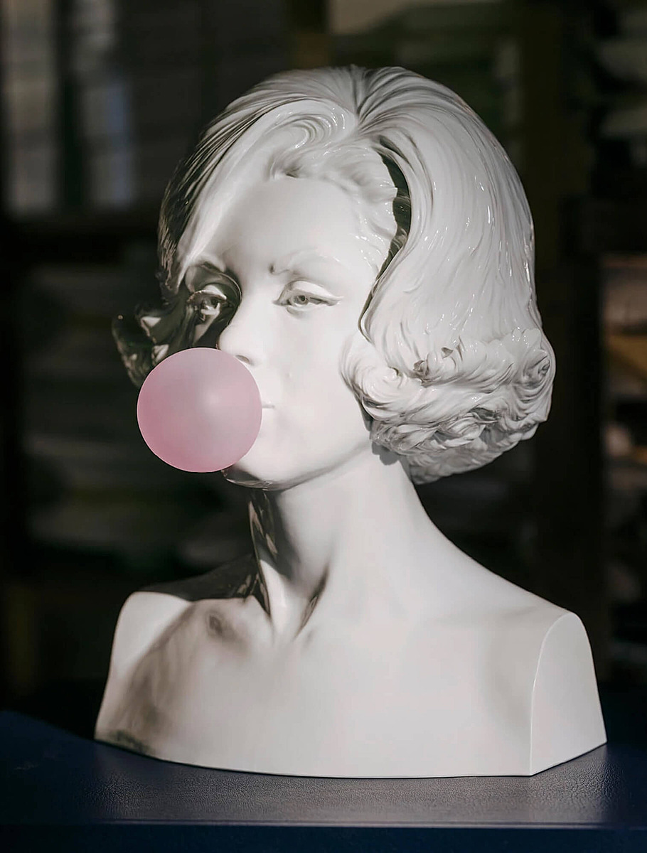 В проекте Legends Blowing Bubbles классическая мейсенская скульптура соединяется с эстетикой поп-арта: фарфоровый бюст Мэрилин Монро выполнен вручную мастерами Meissen, а стеклянный «пузырь жвачки» создан чешской мануфактурой Moser.