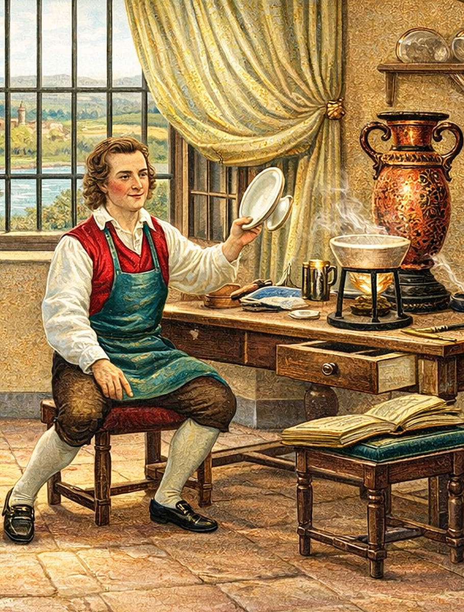 Иоганн Фридрих Бёттгер вошёл в историю Meissen не как керамист, а как алхимик. В начале 18 века поиск философского камня и превращение металлов в золото считались реальной научной задачей. Бёттгер как раз занимался такими опытами — работал с минералами, плавил вещества в печах и искал способ получить золото искусственным путём. Золото ему создать так и не удалось. Но именно этот опыт работы с сырьём и привёл его к главному открытию: формуле твёрдого фарфора, который для своей эпохи был не менее ценным, чем золото.