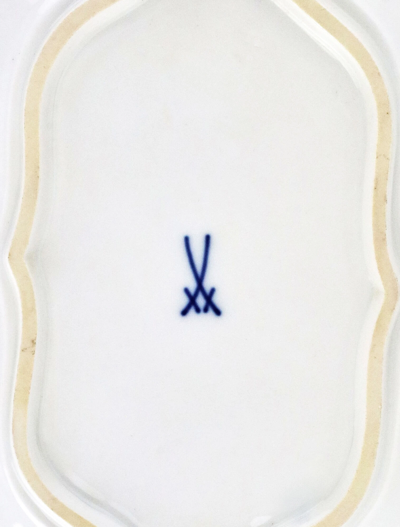 Этой же синей краской в 1722 году стали наносить фирменное клеймо Meissen — скрещённые мечи, заимствованные из герба саксонских курфюрстов. До этого изделия либо вовсе не маркировались, либо получали самые разные обозначения: инициалы, цифры и символы, так или иначе связанные с производством.