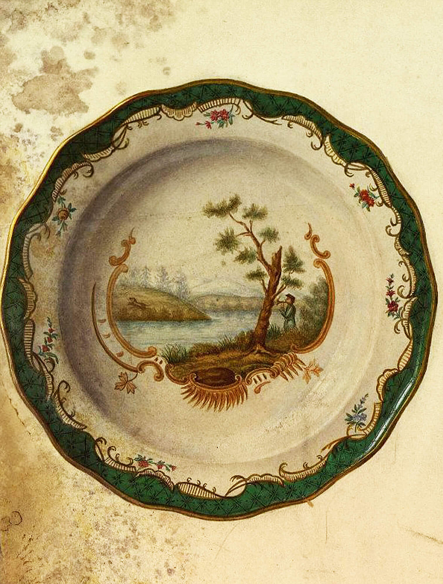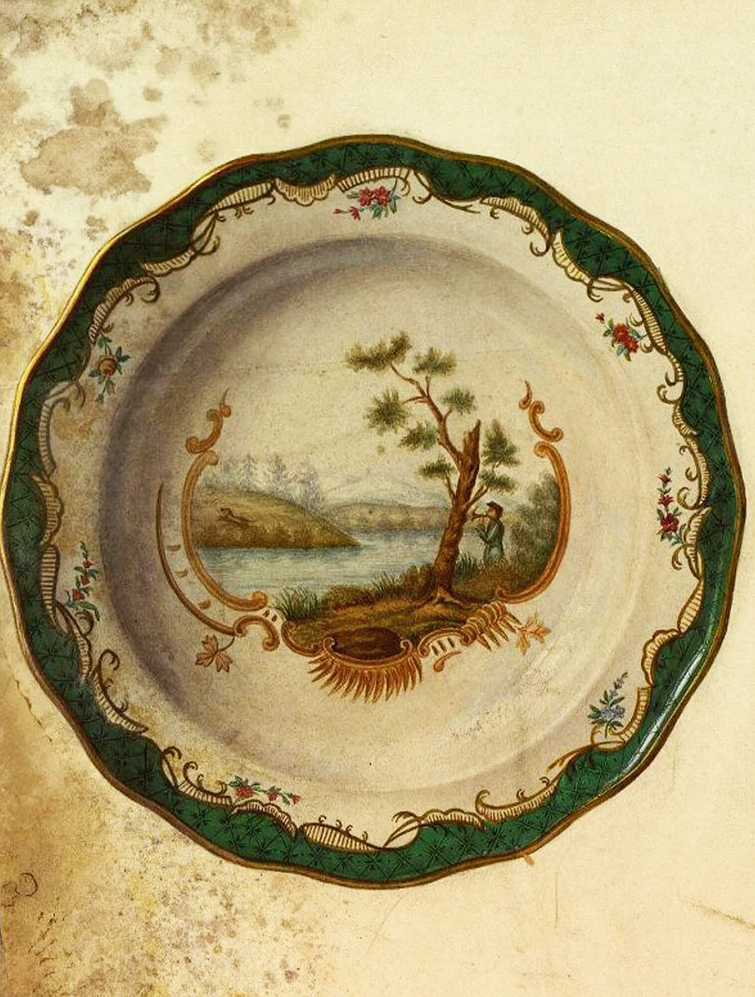 «Охотничий сервиз» отличают изумрудно-зелёные края с мозаичным узором и детально прорисованные охотничьи сцены, обрамлённые золочёными завитками. Сегодня предметы этого сервиза хранятся в крупнейших музеях — в Эрмитаже, Екатерининском дворце, Историческом музее в Москве и Музее Дюссельдорфа.