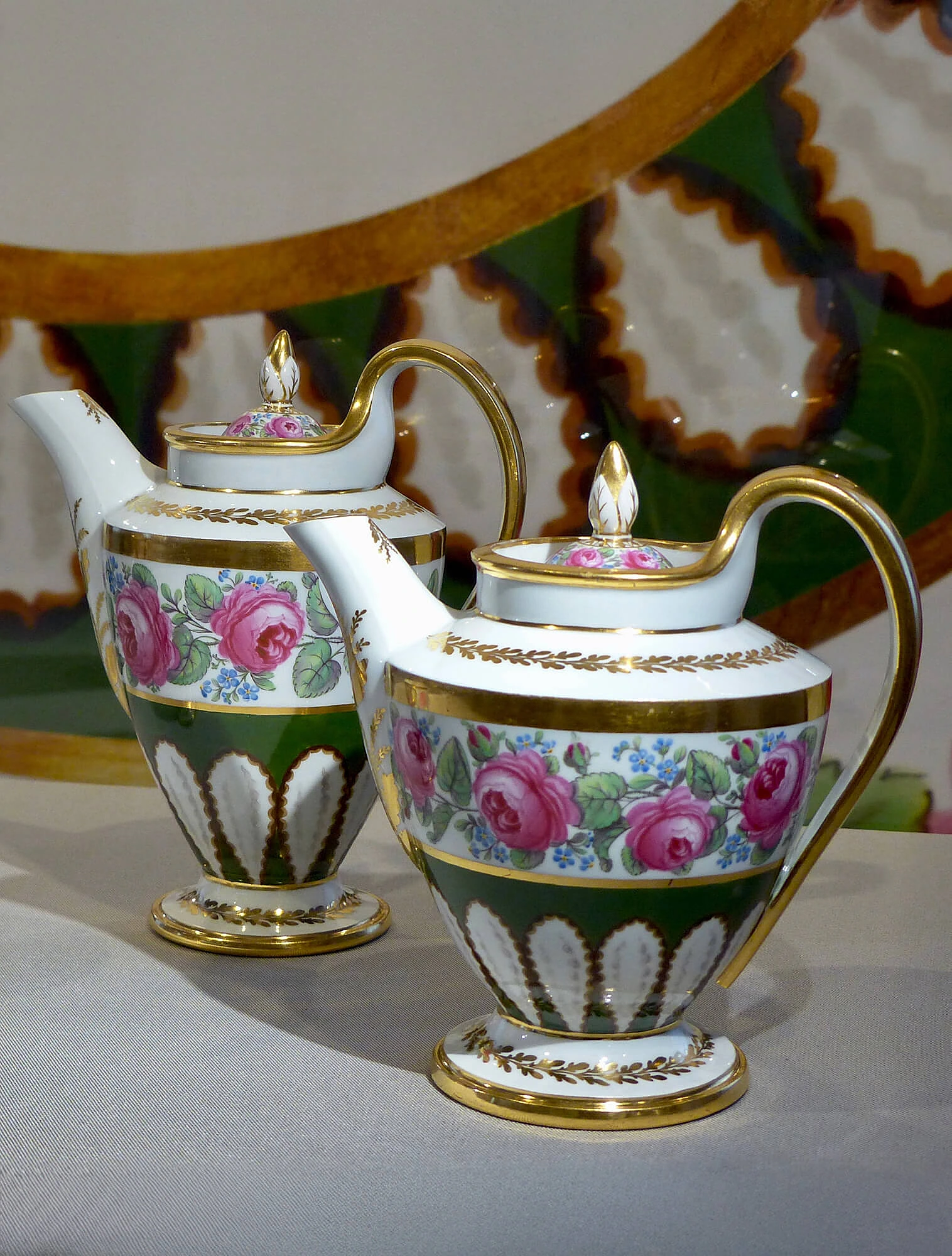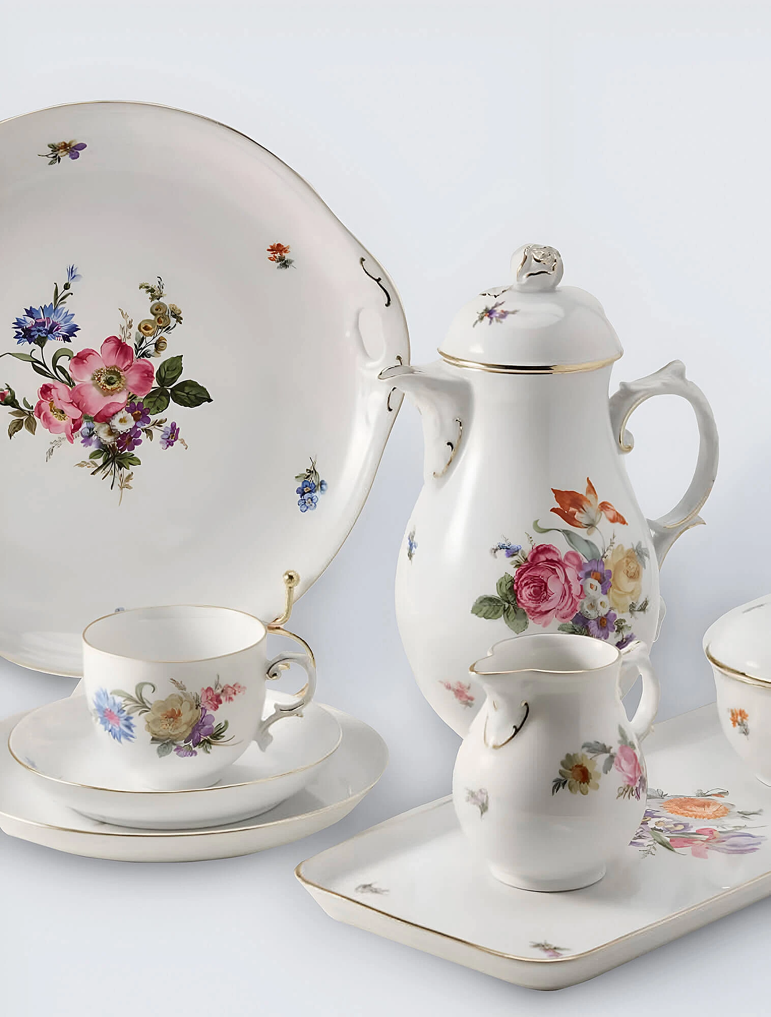 Позже фабрика перешла к более строгим классическим формам: симметричные силуэты, чёткие линии, античные орнаменты и спокойная палитра заменили игривую рокайльную декоративность. Знаковыми стали коллекции с тонкими флористическими орнаментами и изящной позолотой — именно они принесли фабрике славу в Европе.