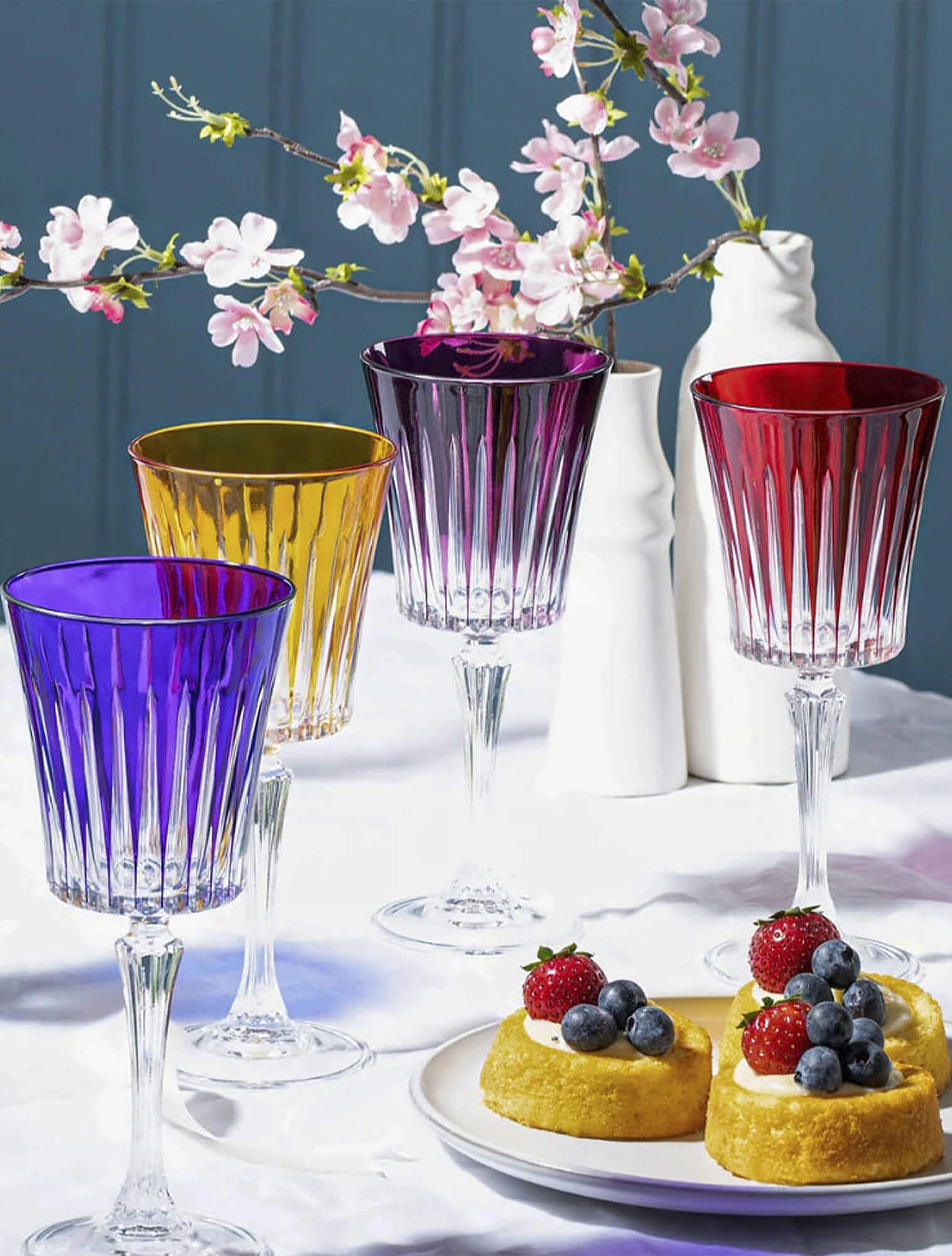 Для 2026 года характерно возвращение выразительного цветного стекла. Бокалы рассматривают не только как утилитарный предмет, который помогает раскрыть вкус и аромат напитка. Они становятся самостоятельным декоративным акцентом, источником бликов и «цветовых пятен» на скатерти.