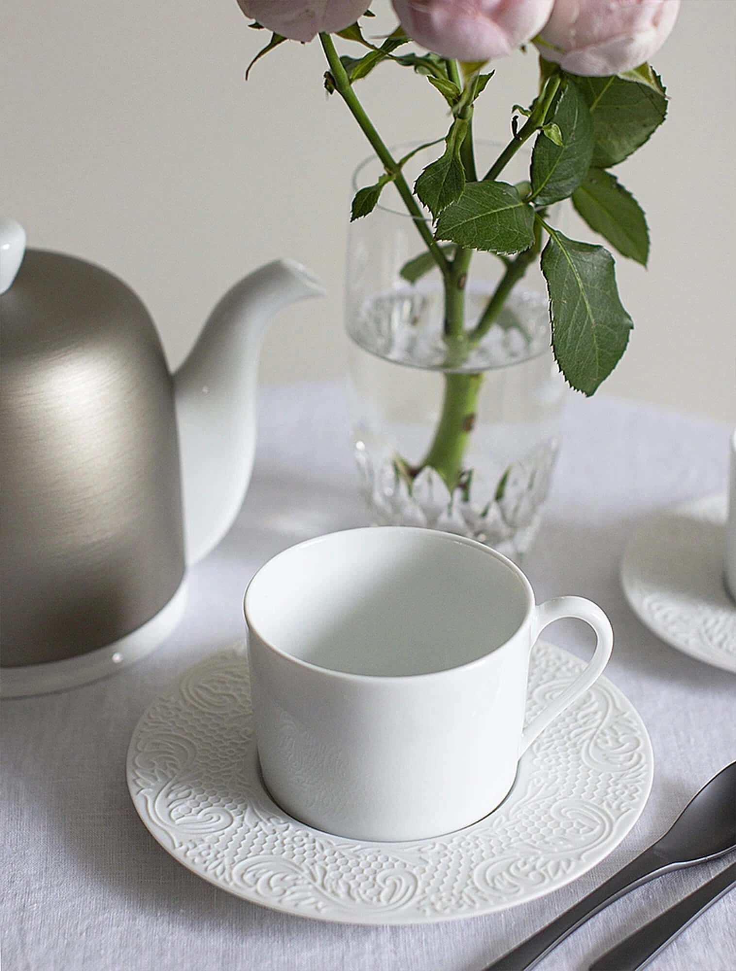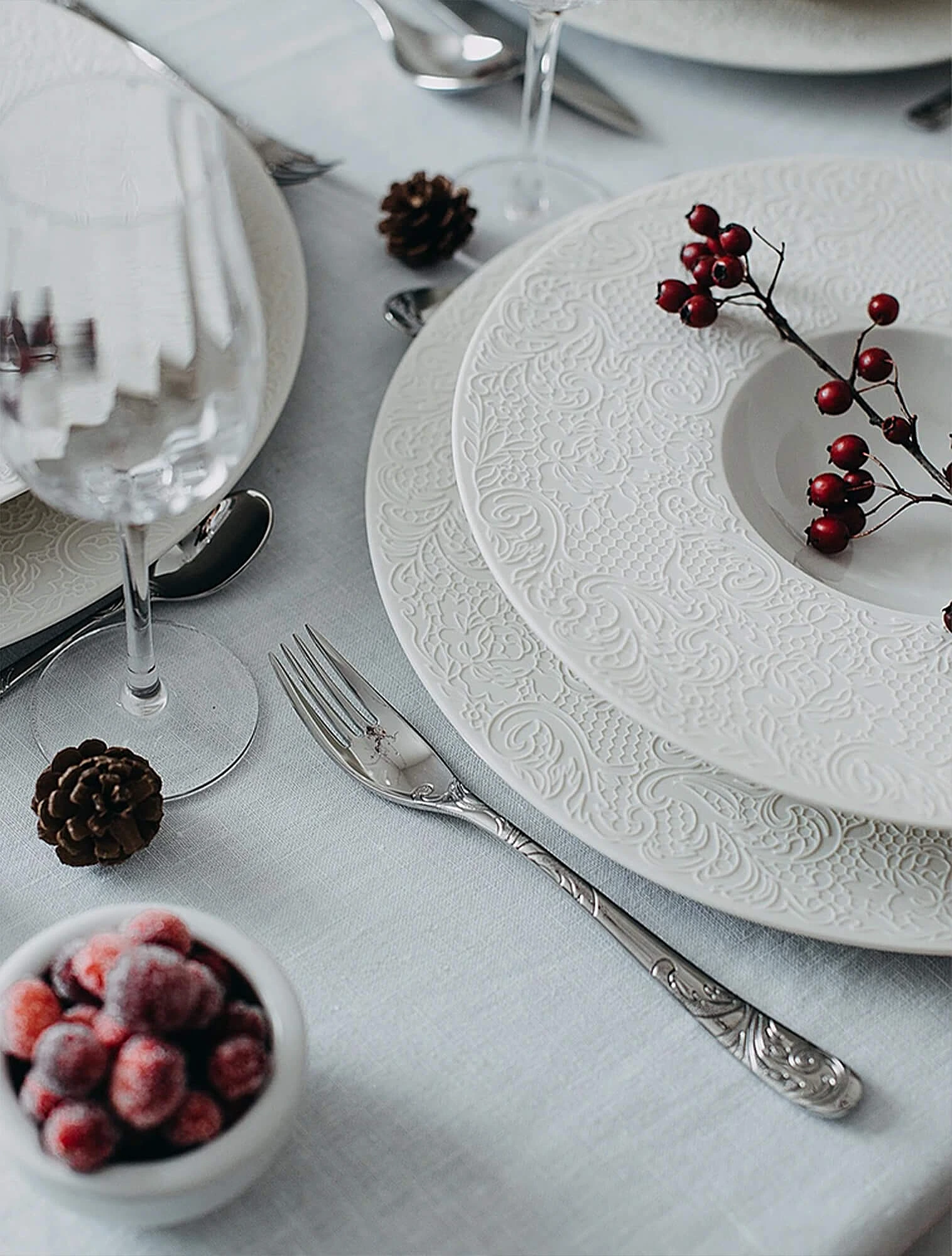 Даже фарфор дизайнеры часто украшают кружевным рисунком. Одна из самых заметных коллекций в этой стилистике — L Couture от французского бренда Degrenne. Она интересна тем, что бортики тарелок не покрывают глазурью, а оставляют матовыми, поэтому кружевной узор на них выглядит объёмно и выразительно.