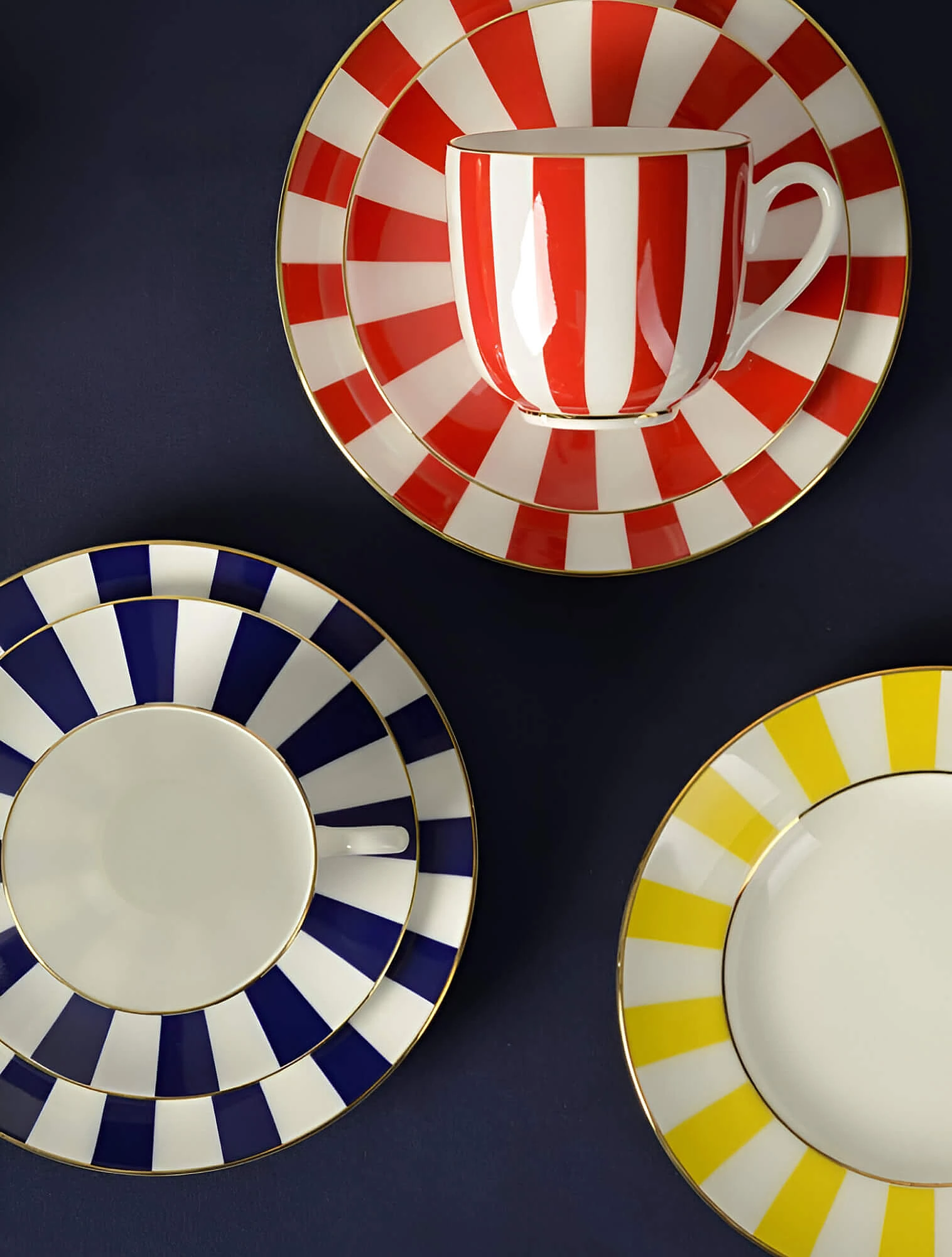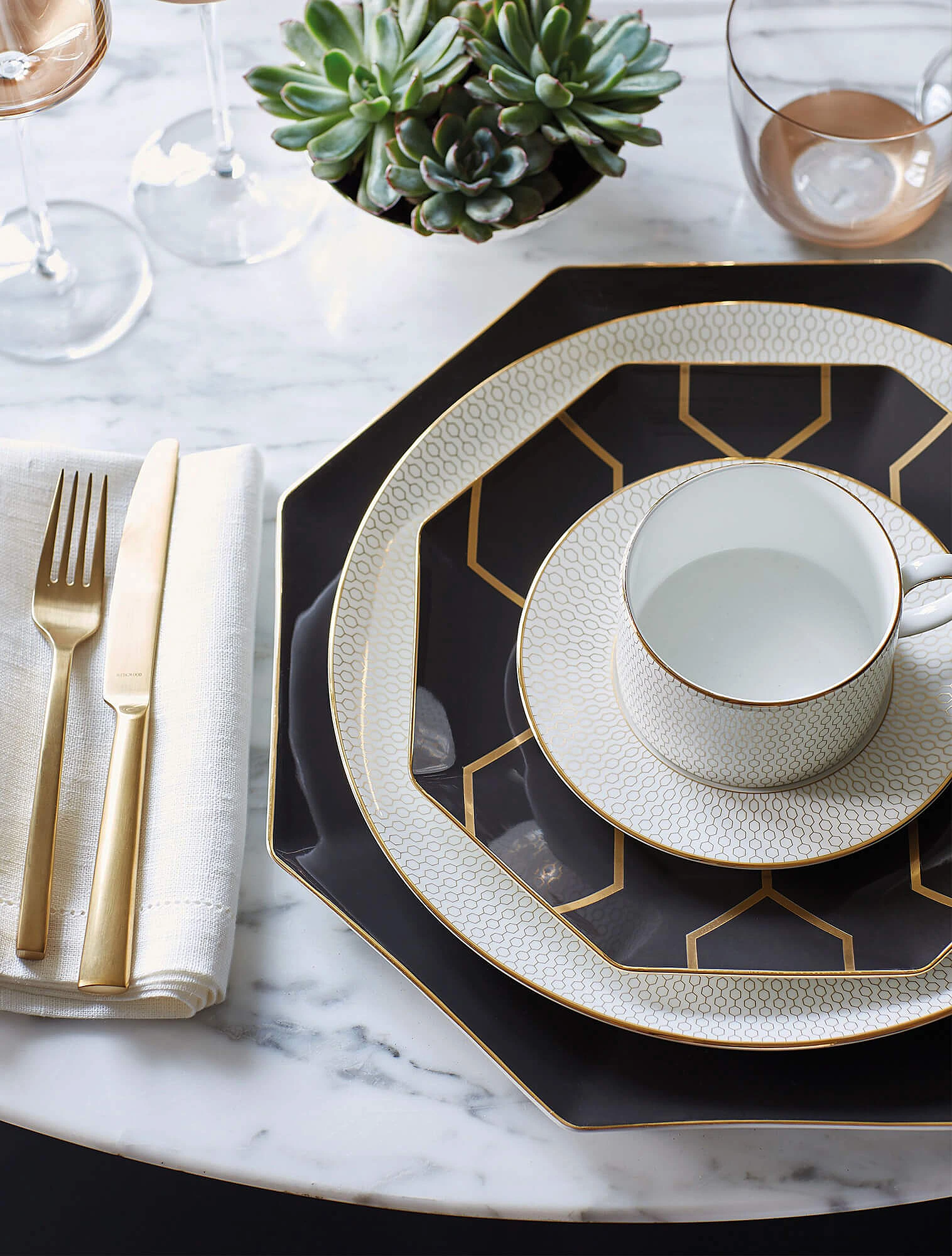 Одна из самых заметных коллекций из фарфора в этой стилистике — Gio Gold от Wedgwood. В ней воплощены ключевые черты нео-деко: глубокие тёмные оттенки, контрастные сочетания, строгий геометрический орнамент, благородные золотые акценты и графичные формы предметов.