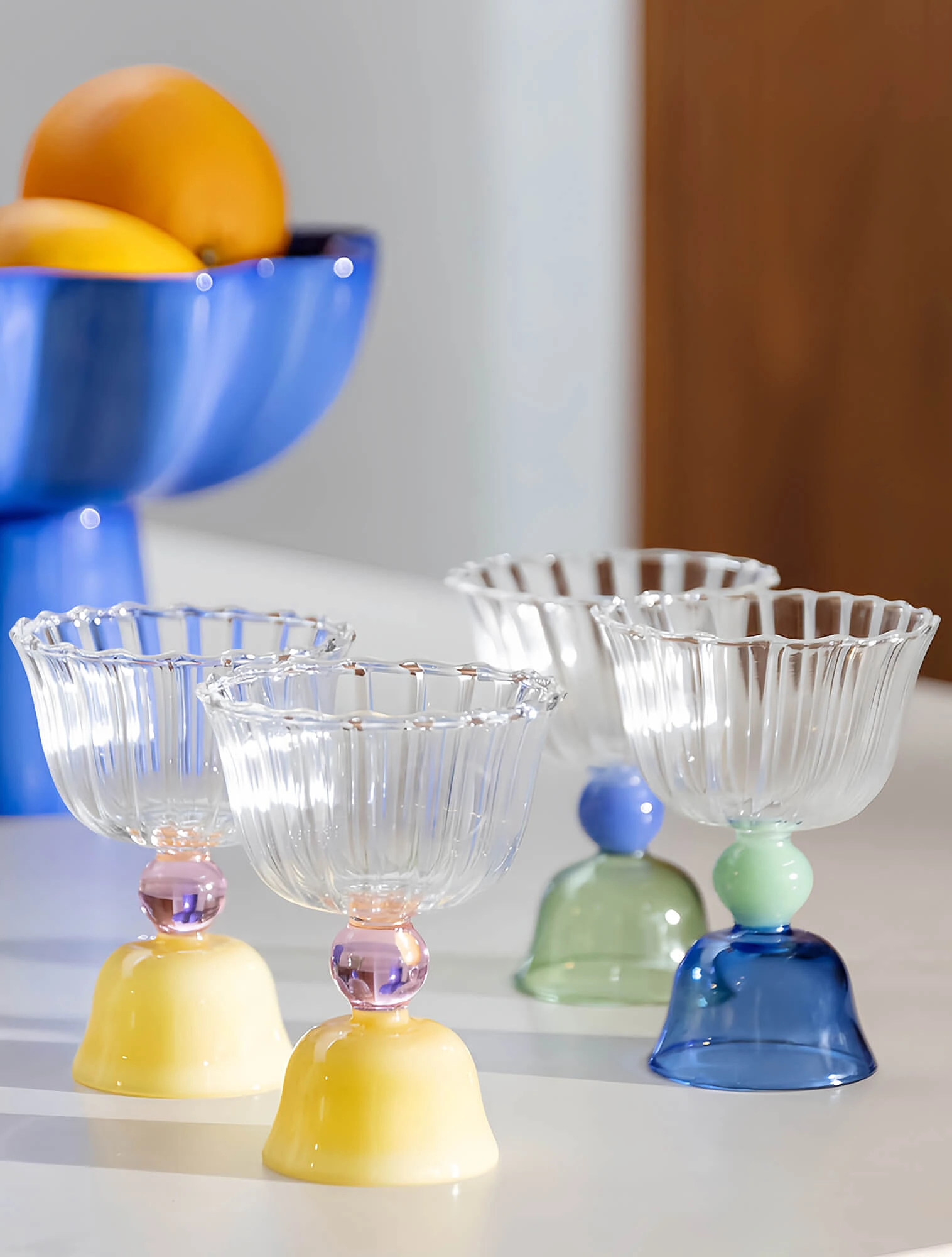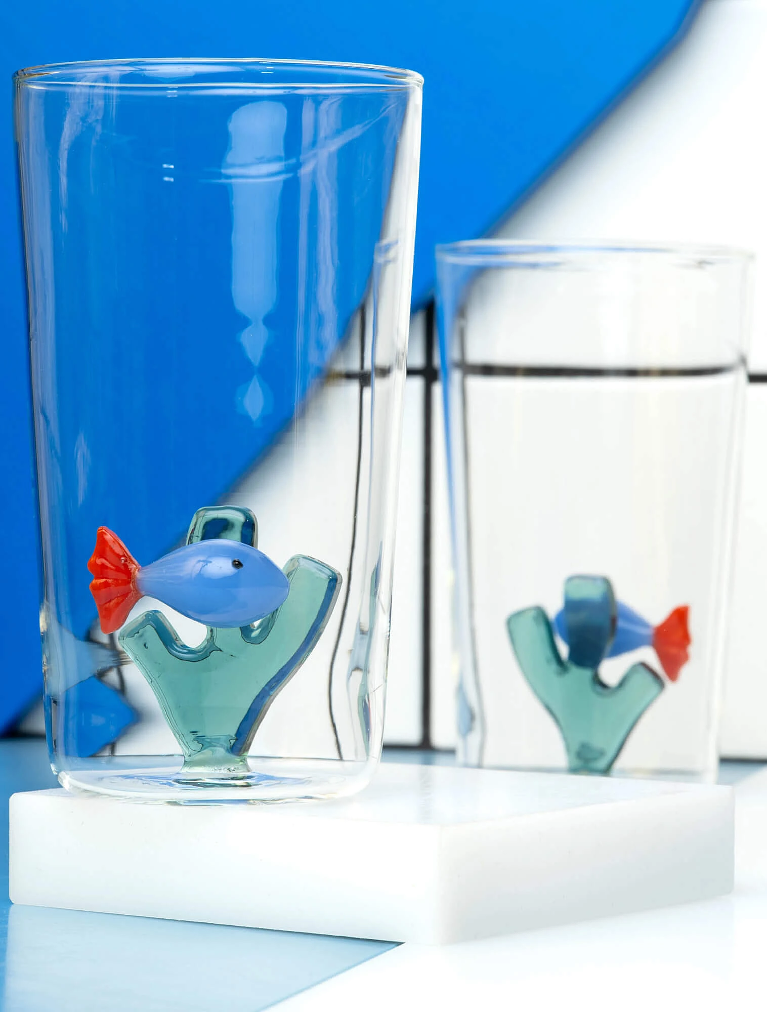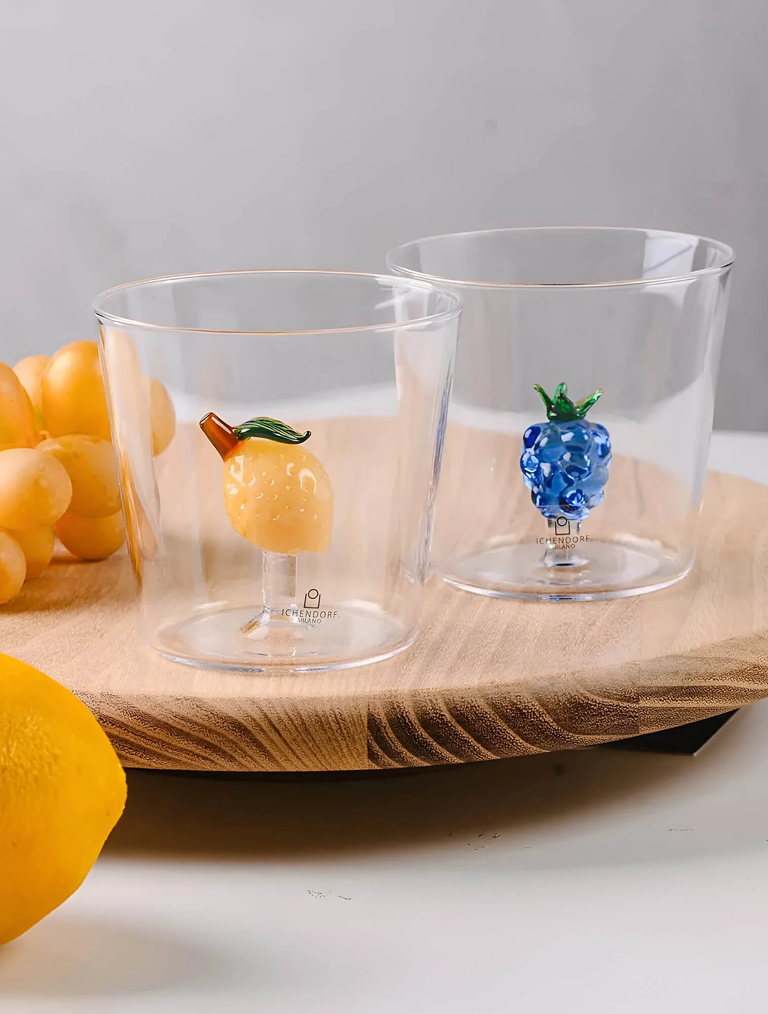 Яркий пример такого подхода — итальянская компания Ichendorf Milano. Они выпускают разнообразные стаканы для воды со стеклянными полупрозрачными фигурками на дне. Их дизайн и цвета напоминают леденцы и мармеладки, а сами стаканы всегда вызывают улыбку.