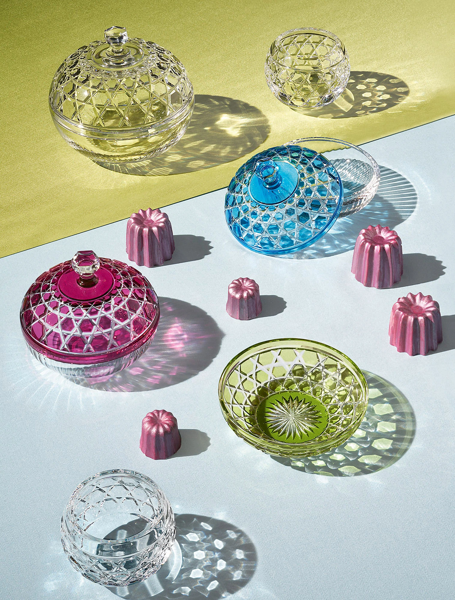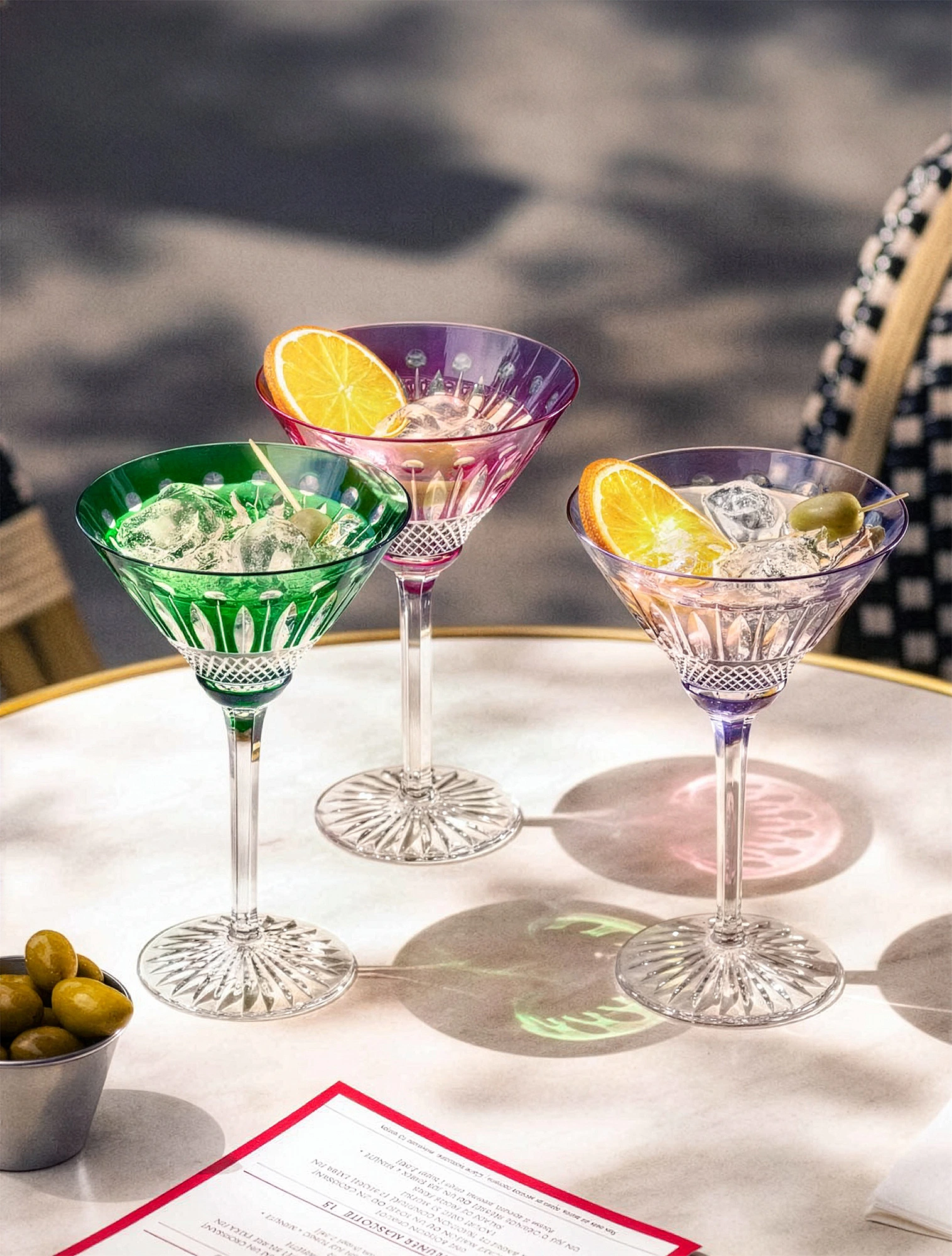 Такие наборы можно найти у разных брендов — от роскошного St. Louis до более демократичного Cristal de Paris. Кроме традиционных фужеров для вина или шампанского, необычно в сервировке смотрится посуда для крепких напитков из цветного стекла — например, рюмки датского бренда Lyngby Glas. Каждая из них имеет свой оттенок и отличается от других по высоте и форме.