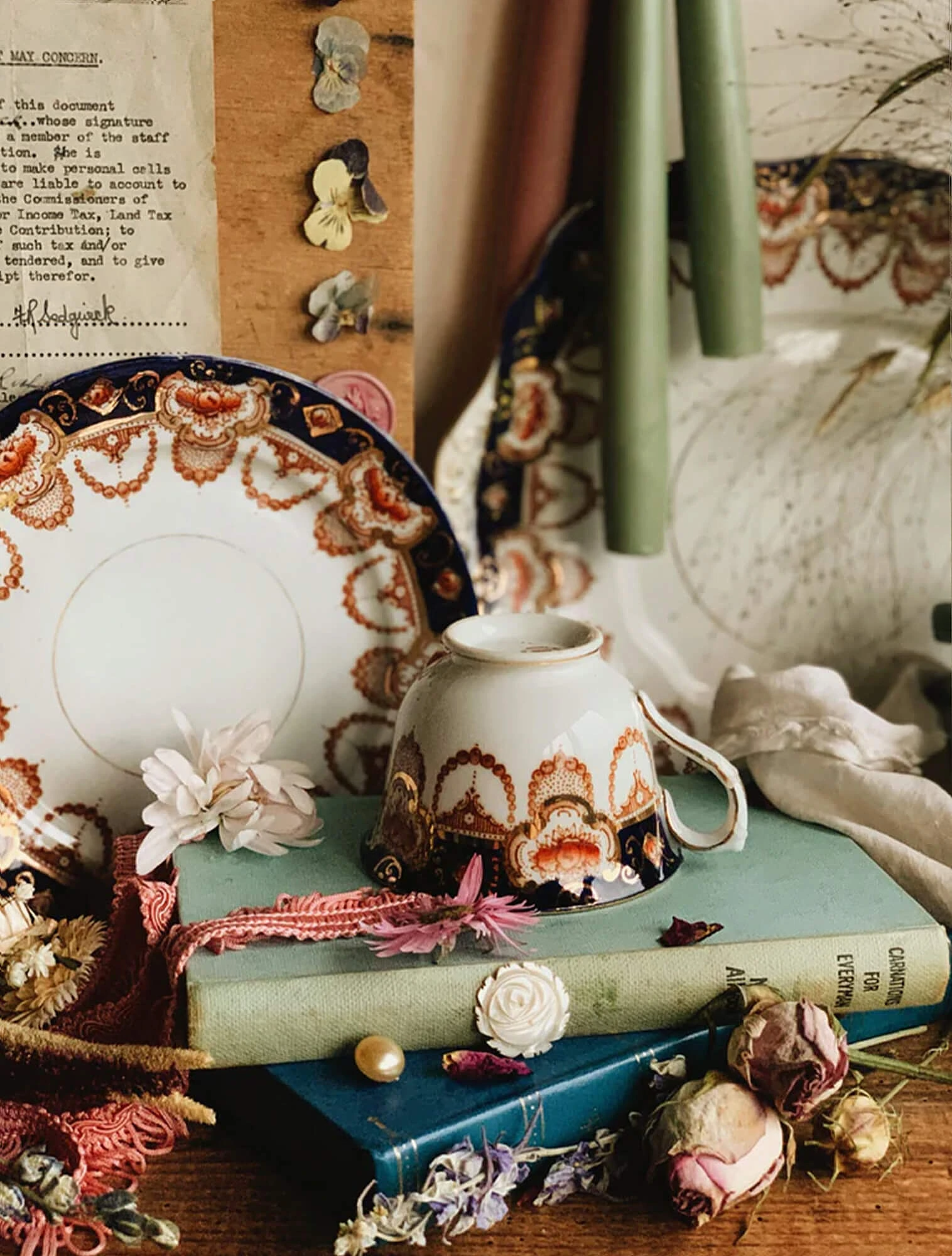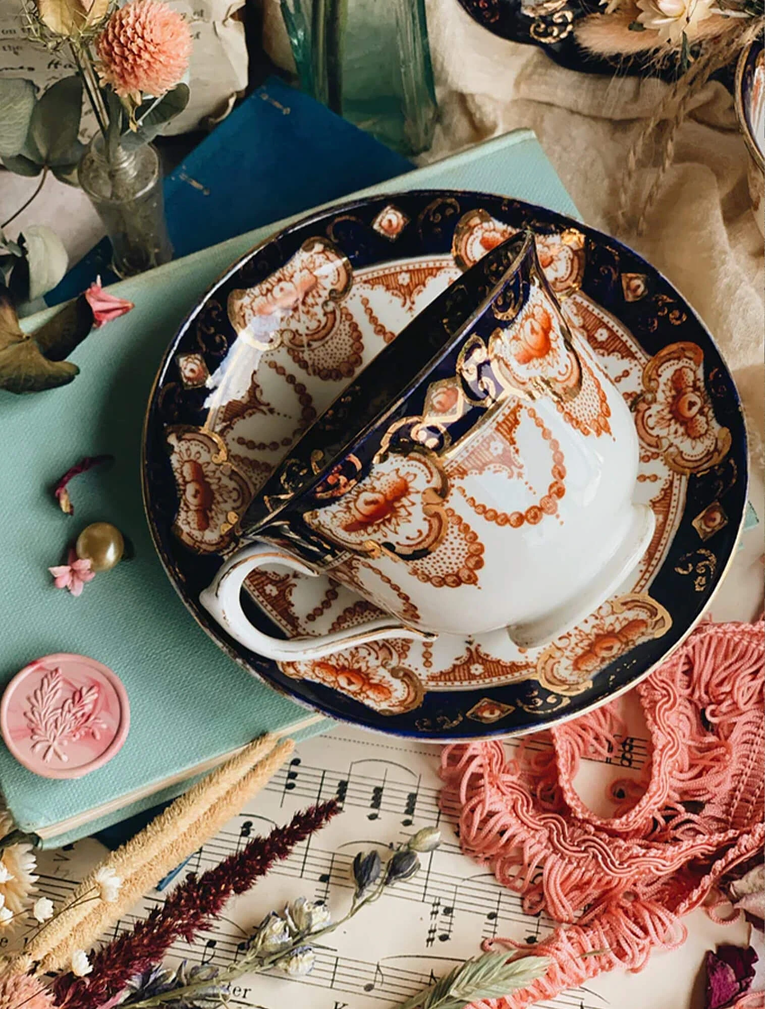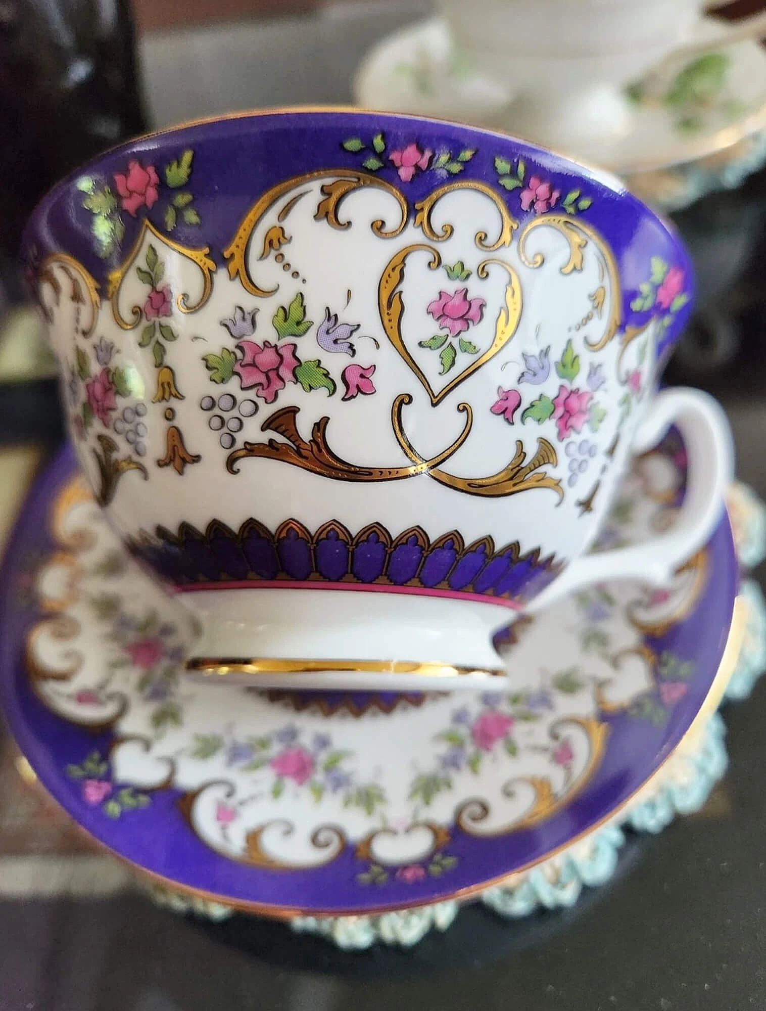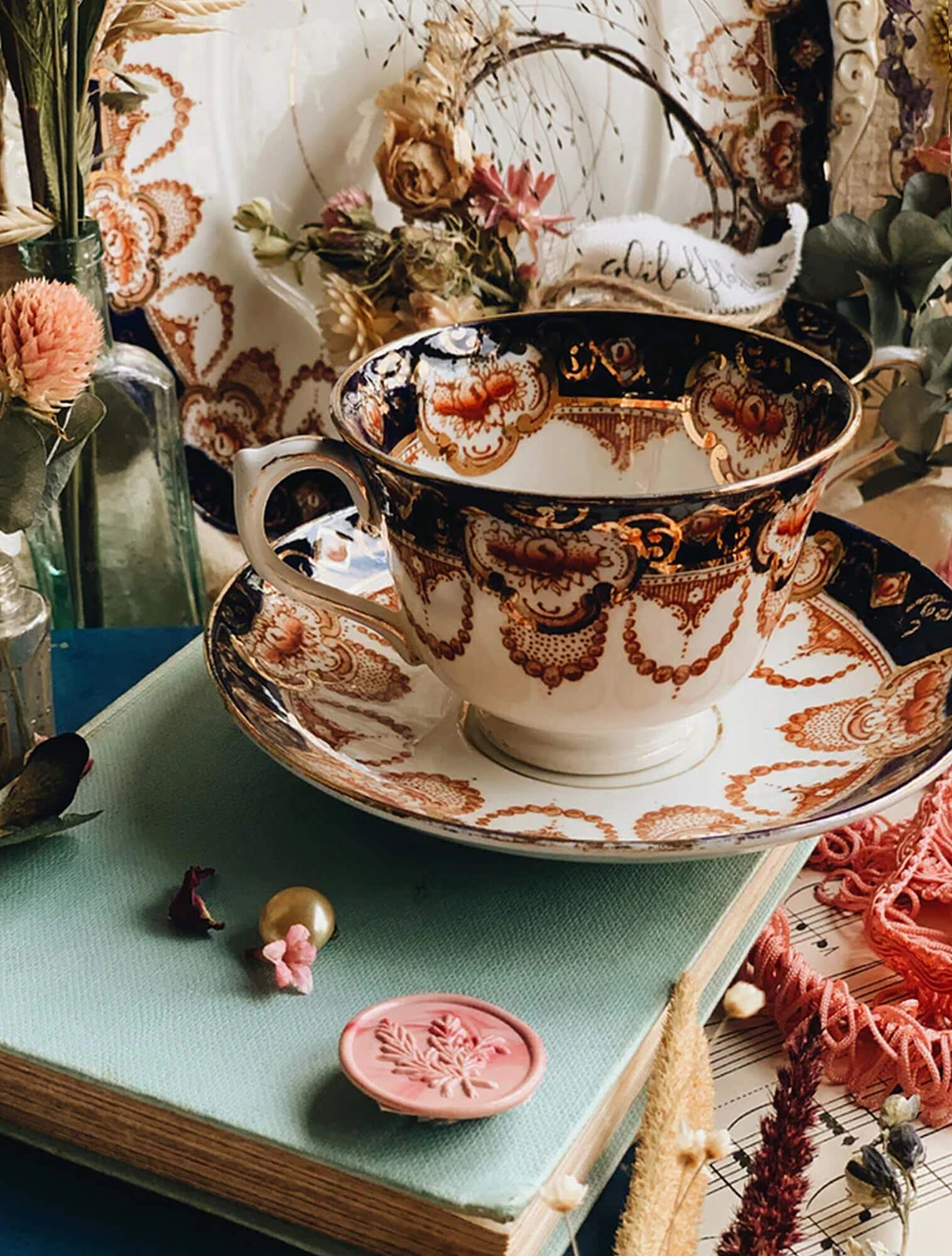 Например, в коллекции есть дизайн, который сочетает два винтажных мотива 1900-х: мелкий цветочный узор и золотые узоры на синем фоне оттенка Regency blue. Это название относится к глубокому «королевскому» синему цвету, который часто встречался на парадной посуде эпохи Регентства.